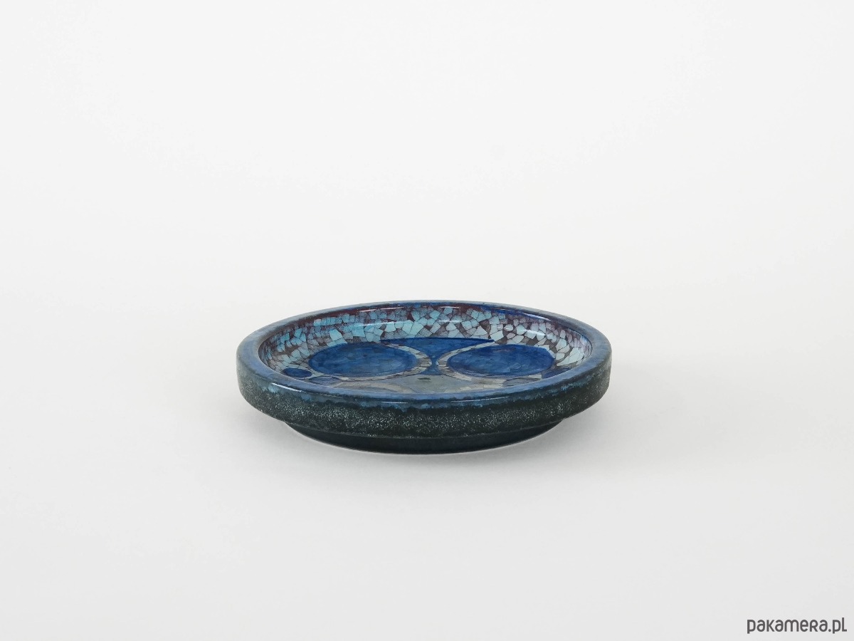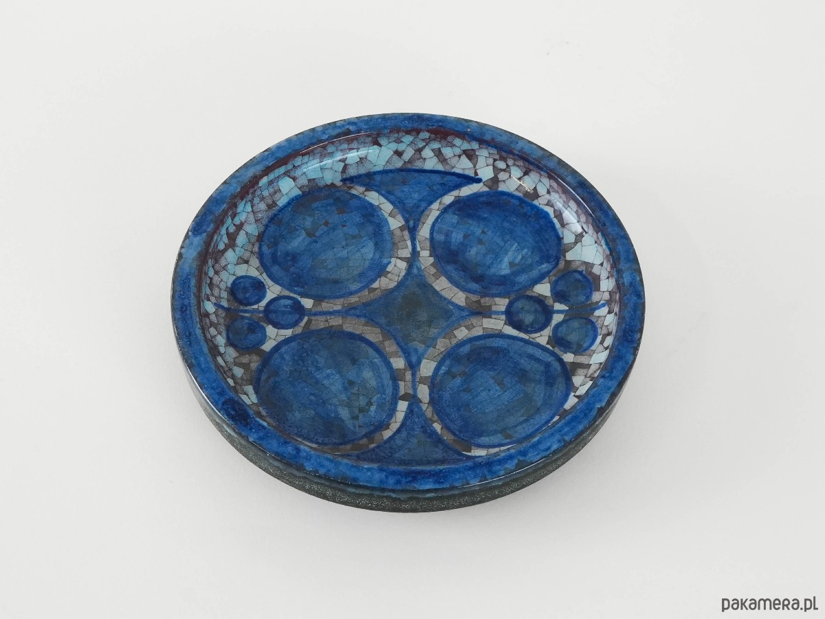 Talerz z kamionki szkliwionej. Zdobiony dekoracyjnym wzorem geometrycznym w odcieniach kobaltu, fioletu i brązu, z charakterystycznym dla artystki wyczuciem koloru i faktury. Kolekcjonerski przykład duńskiej ceramiki artystycznej z połowy XX wieku.