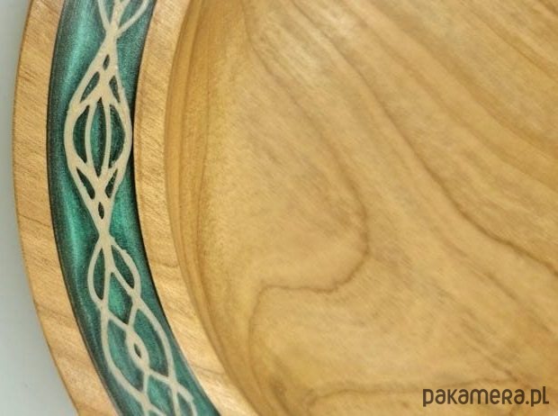 Pomyśl o koronach i ozdobach noszonych na głowie przez elfy w filmach Władca Pierścieni. Obręcz czerpie inspirację z tego samego wzoru, w którym organiczne krzywizny spotykają się ze spokojną elegancją. Zaprojektowałem motywy w polimerze z domieszką drewna i osadziłem w krystalicznie czystej morskiej zieleni żywicy epoksydowej. Ciepła wiśnia lśni na tle chłodnej żywicy, przywołując na myśl lasy i rzeki, światło słoneczne i cień, ziemię i wodę w harmonii. Z góry obrzeże wygląda jak delikatna wstążka z czasów secesji. Z boku przezroczysta żywica mieni się, gdy tańczy w niej światło.