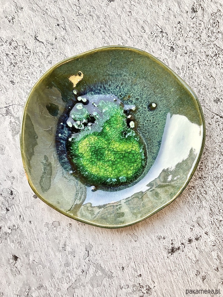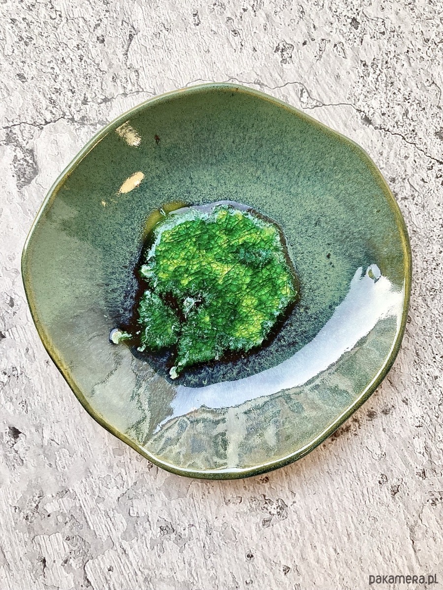 TALERZYK *EMERALD* to piękne połączenie organicznej formy, przejść zielonego i granatowego szkliwa oraz szmaragdowego środka. Idealny do podawania deserów. Stanie się niezwykłą ozdobą w twojej kuchni.