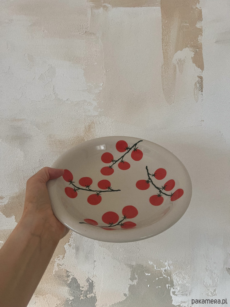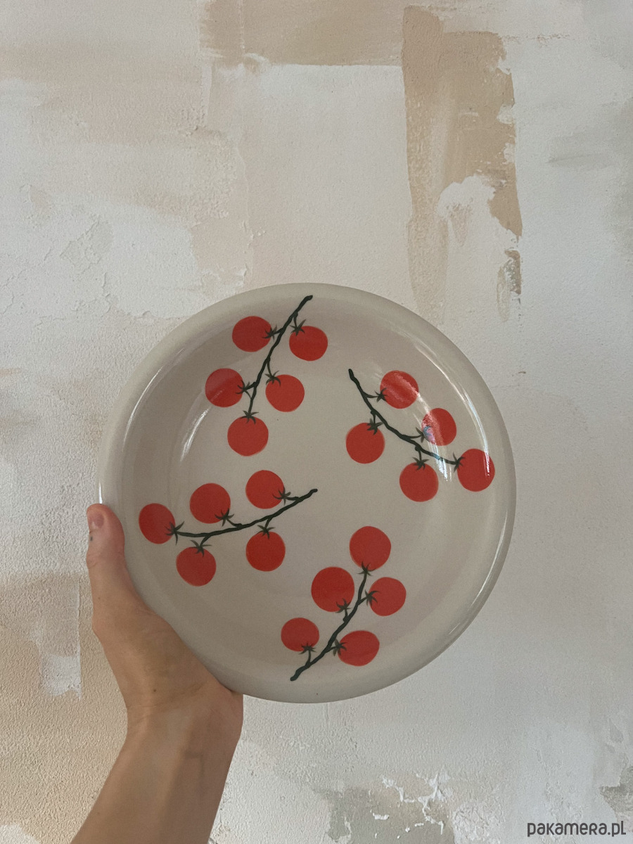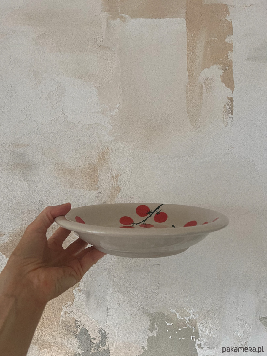 Głęboki talerz ręcznie malowany w pomidorki. Idealny na makaron lub zupę.