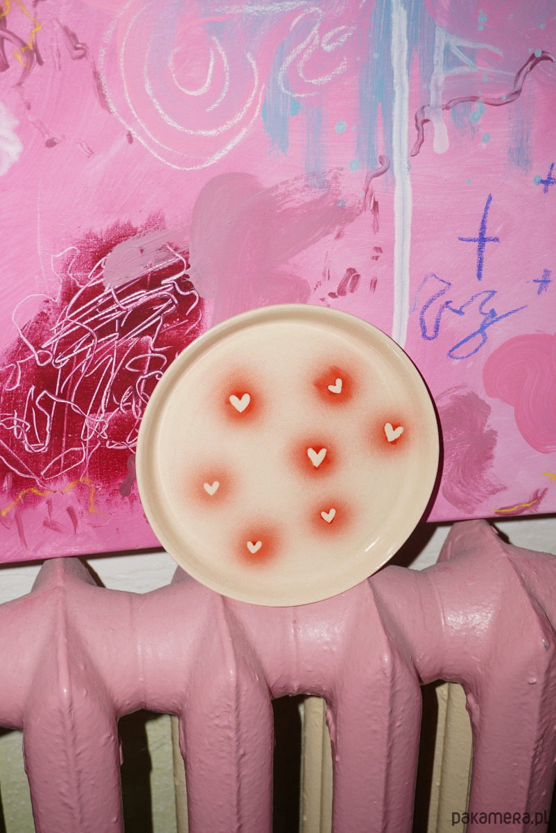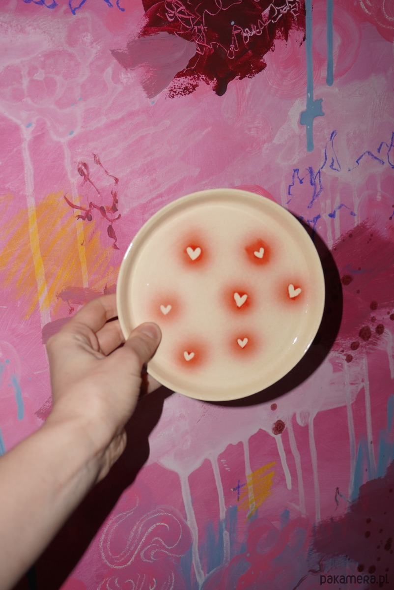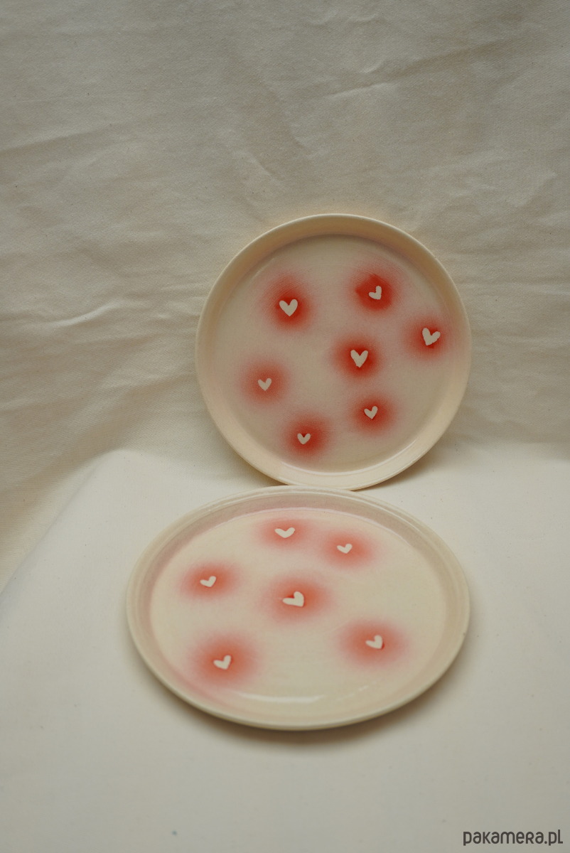 Stworzony na kole garncarskim talerzyk jest owocem tradycyjnego rzemiosła i pasji do ceramiki. Każdy egzemplarz jest indywidualnie formowany, a ręcznie naniesione detale dodają mu charakteru, który wyróżnia go spośród masowych wyrobów. Talerzyk ozdobiony nasprejowanymi serduszkami.