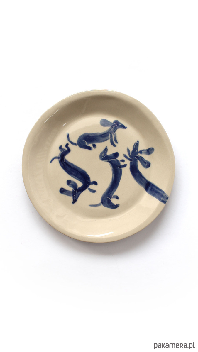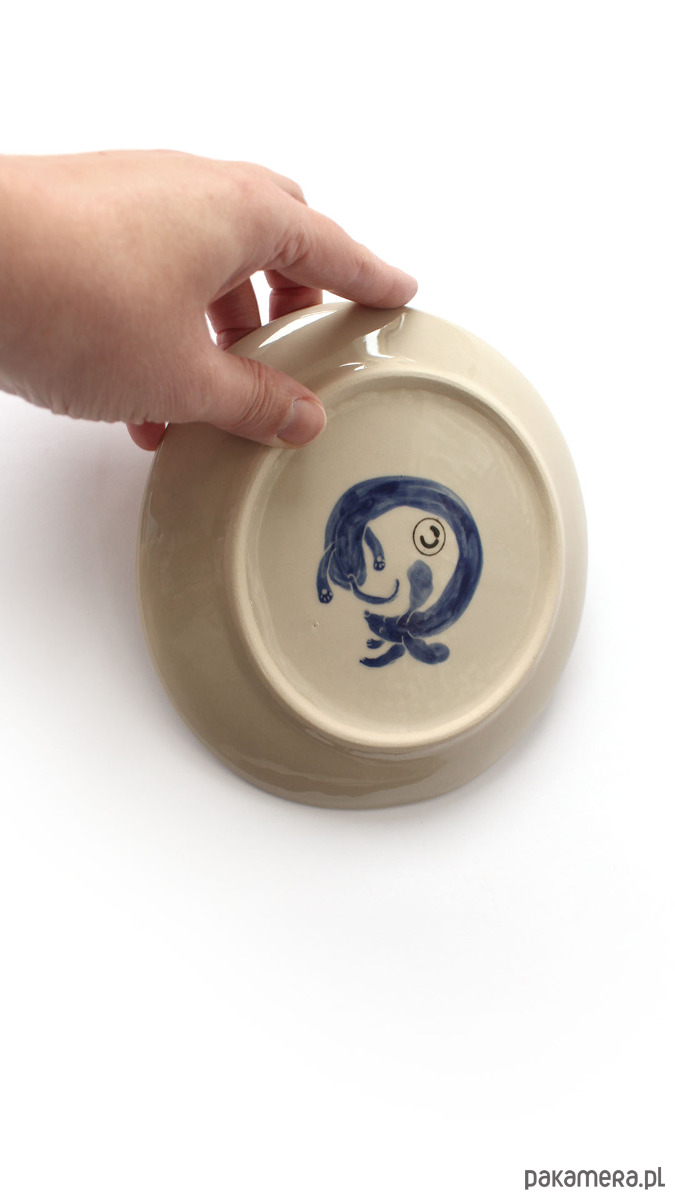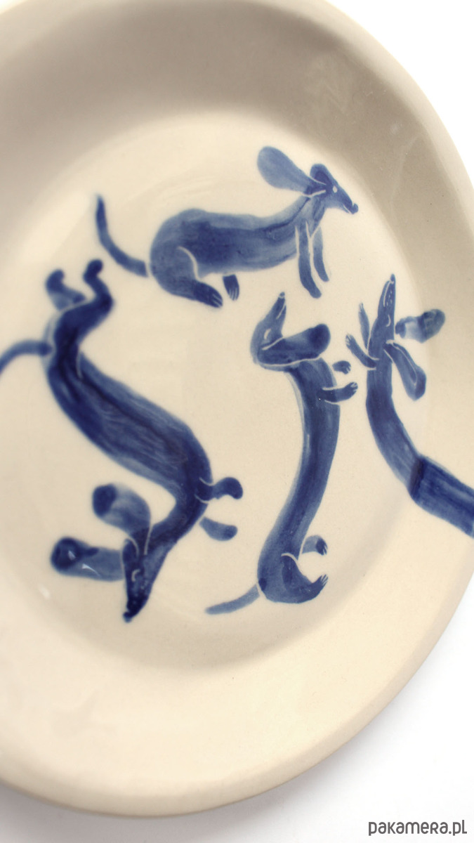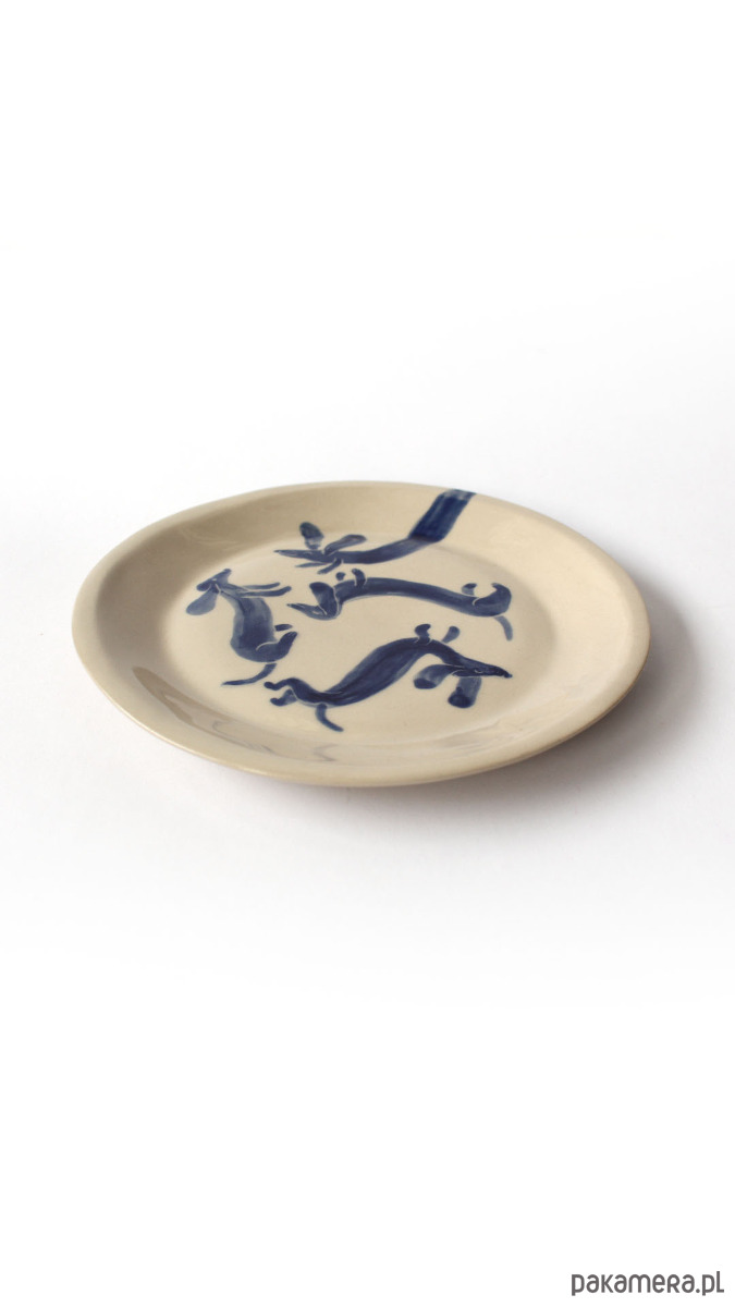Grafika z ręcznie malowanymi jamniczkami- farbą podszkliwną w kolorze kobaltu, wykonany z wysokiej jakości kremowej gliny,100% handmade. Wypalany dwukrotnie, szkliwiony i zdobiony dwustronnie. Sygnowany. Zastosowane szkliwo nadaje się do kontaktu z żywnością. Talerzyk można myć w zmywarce. Średnica ok. 16 cm, wys. 2 cm