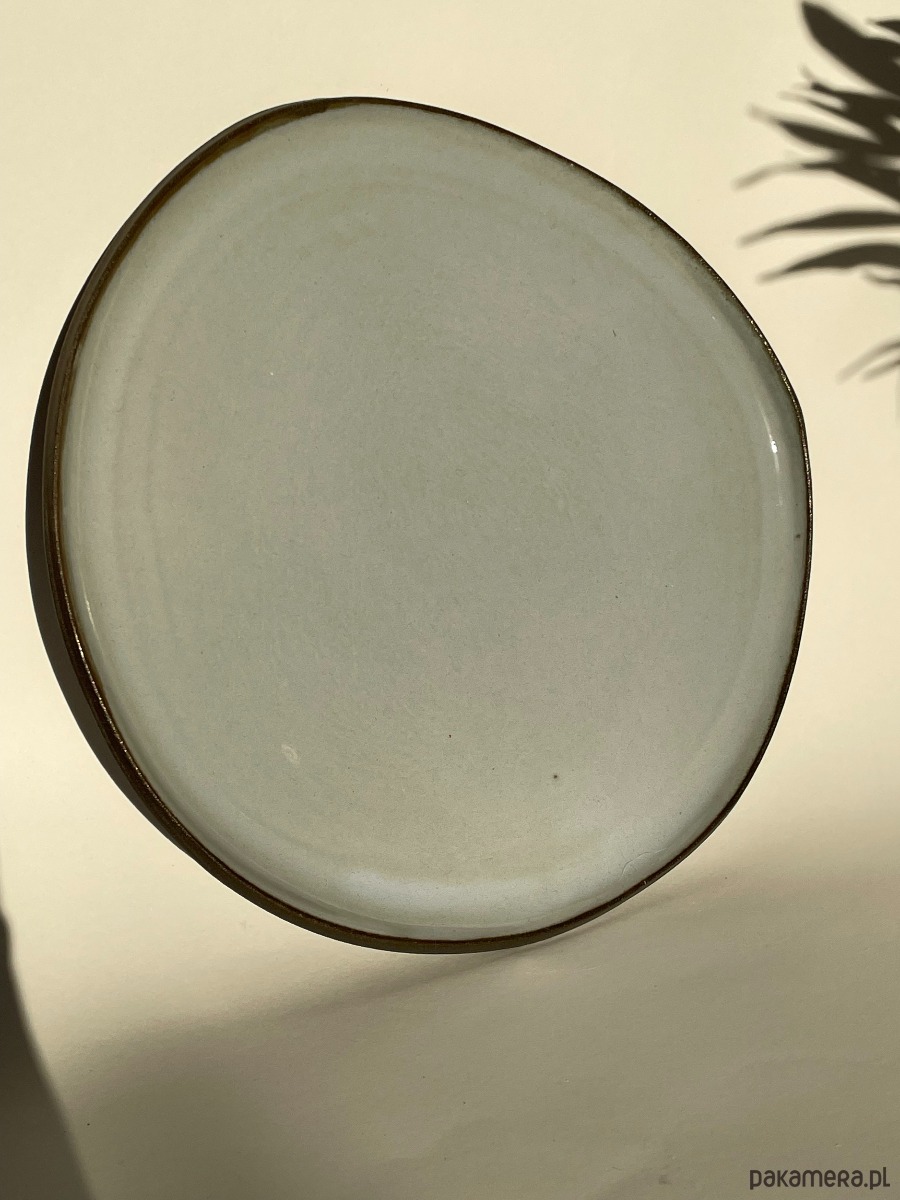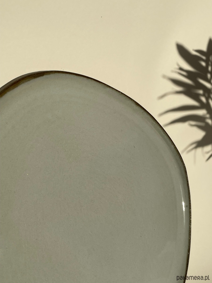 Talerz o nieidealnym okręgu w kolorze delikatnego fioletu, wykonany z czarnej gliny.
