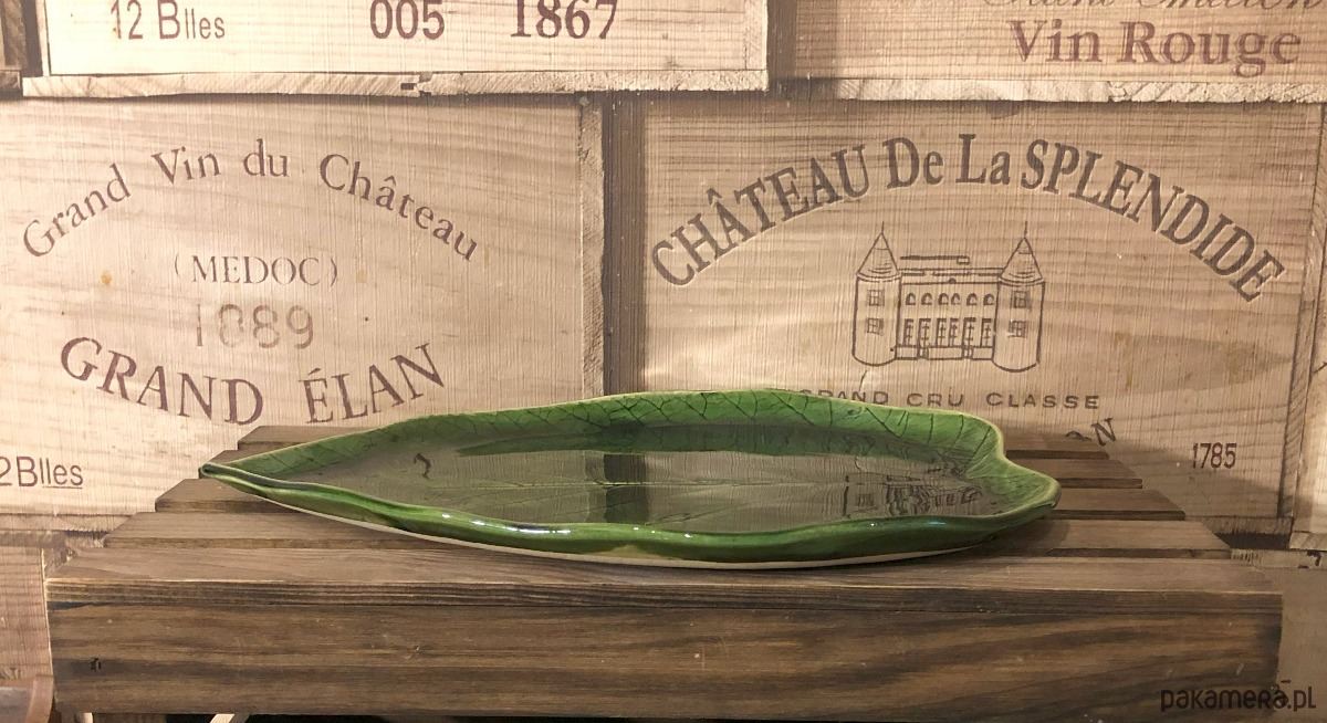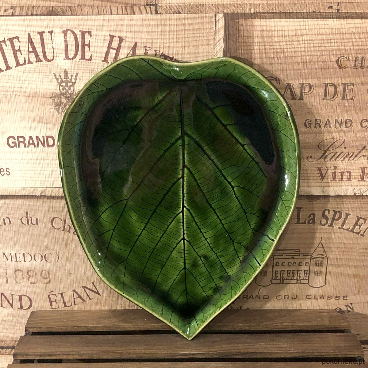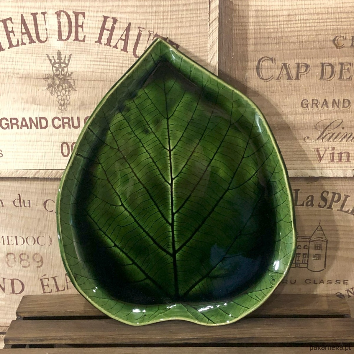 Talerz ceramiczny w kolorze butelkowej zieleni z odbitym naturalnym listkiem.
