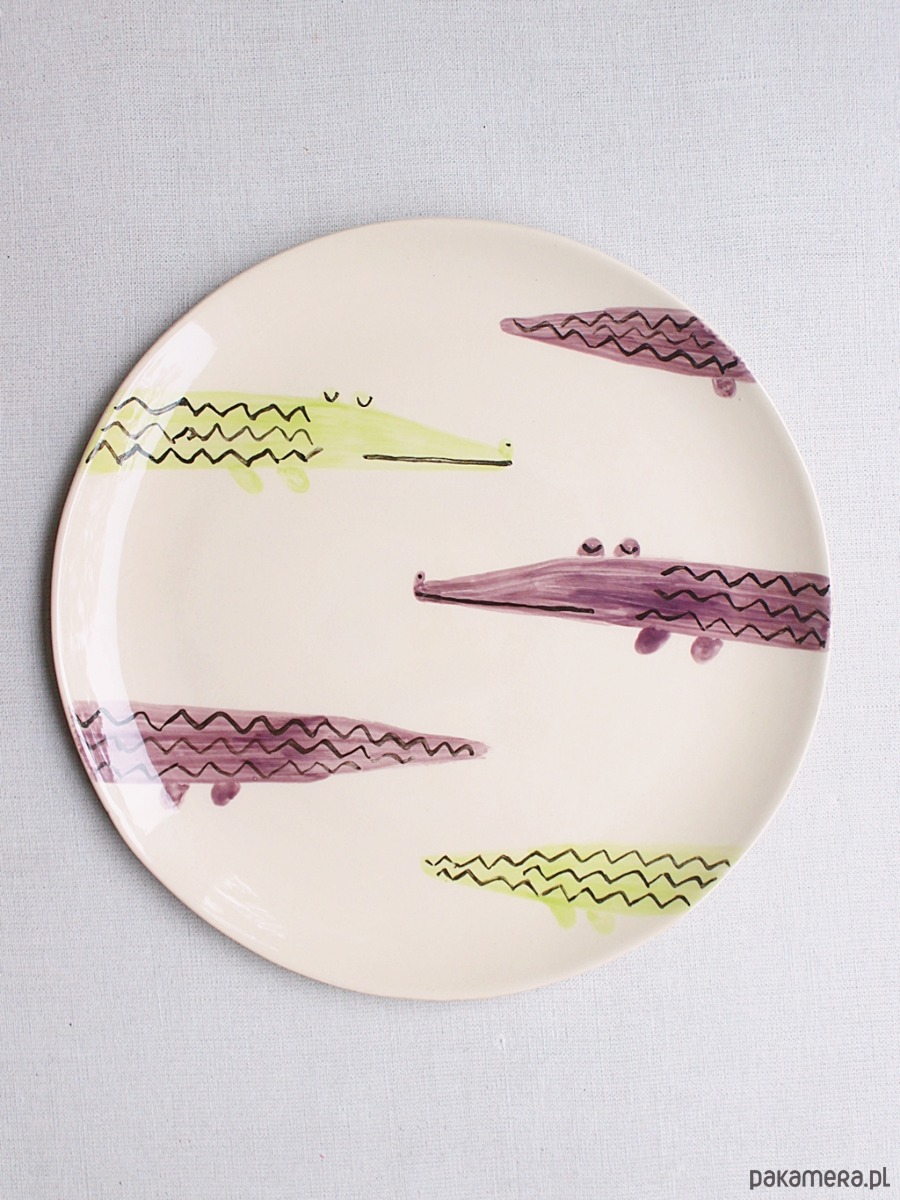 Talerzyk malowany w zielone i fioletowe krokodyle.