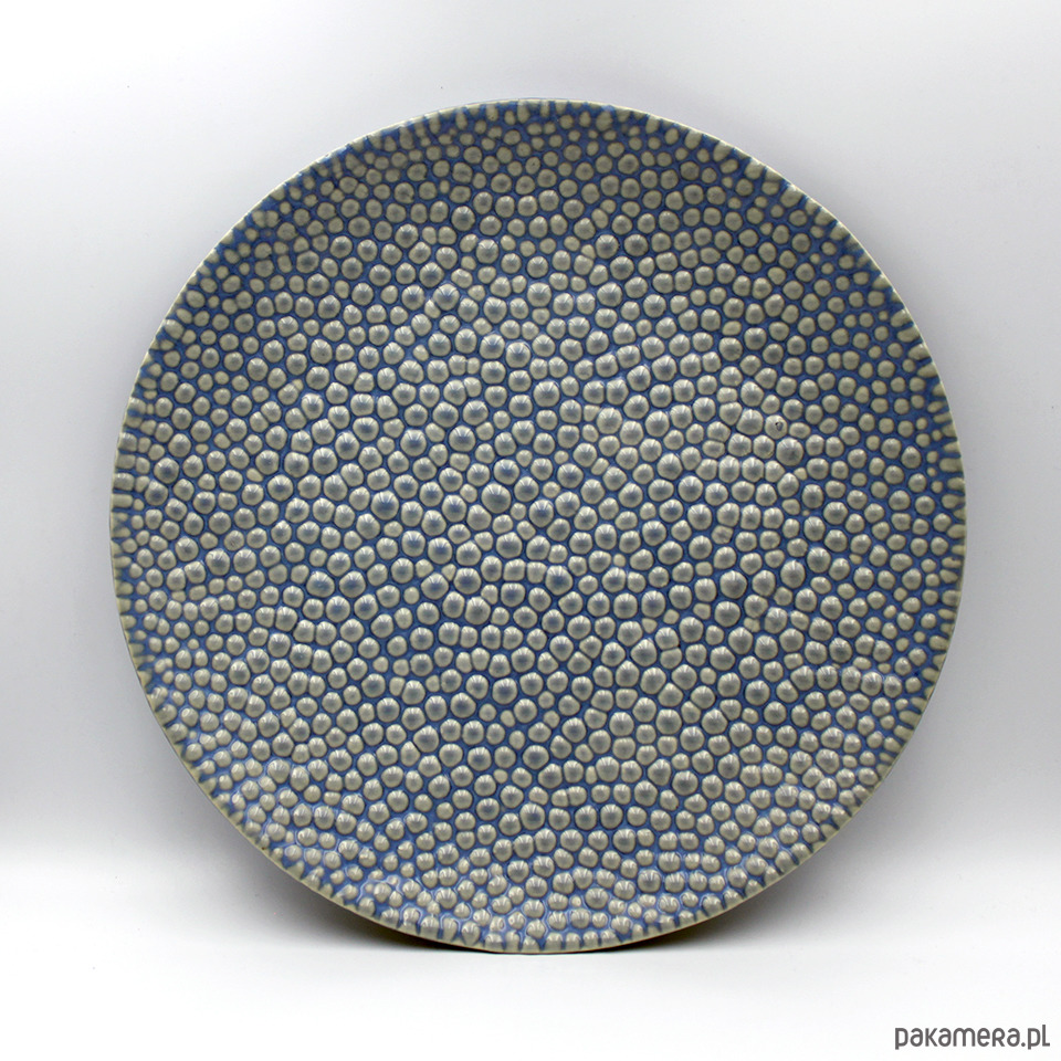 Efektowny ceramiczny talerz, ręcznie wykonany z jasnobeżowej masy kamionkowej, inspirowany mikrostrukturami i formami organicznymi, obustronnie szkliwiony błyszczącym szarobłękitnym szkliwem.Średnica ok 22cm. Na zamówienie dostępny również w innych wersjach kolorystycznych. Szkliwo przeznaczone do kontaktu z żywnością