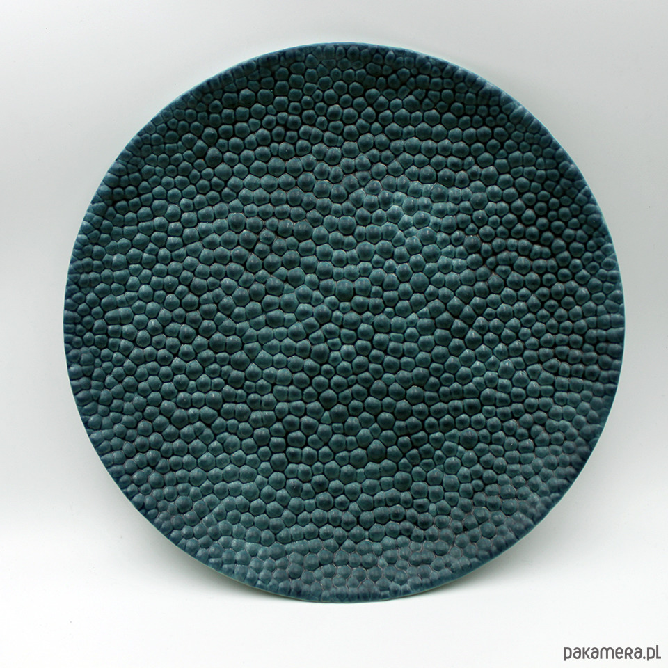 Efektowny ceramiczny talerz, ręcznie wykonany z jasnobeżowej masy kamionkowej, inspirowany mikrostrukturami i formami organicznymi, jednostronnie szkliwiony półmatowym szkliwem, spód matowy turkusowy.Średnica ok 22cm. Na zamówienie dostępny również w innych wersjach kolorystycznych. Szkliwo przeznaczone do kontaktu z żywnością