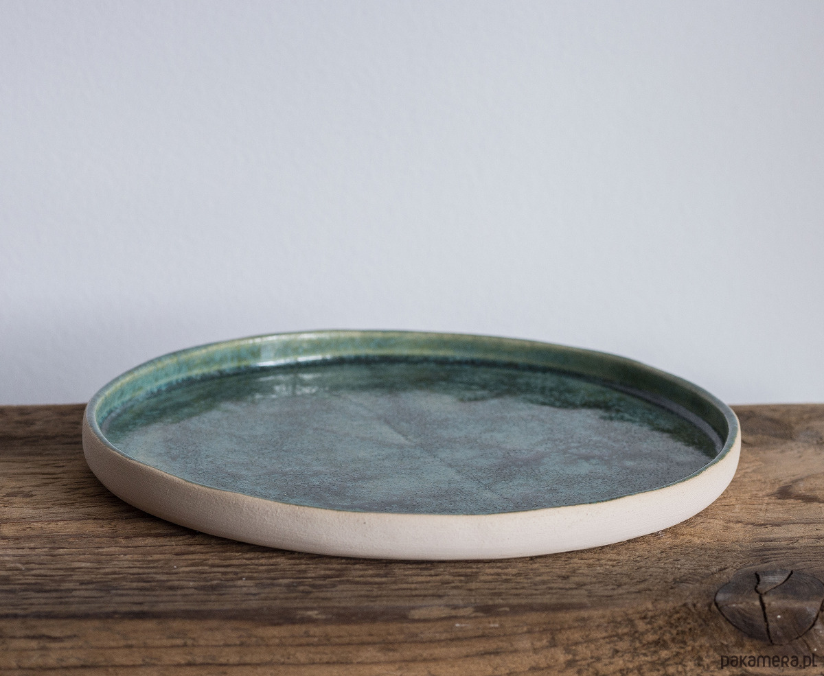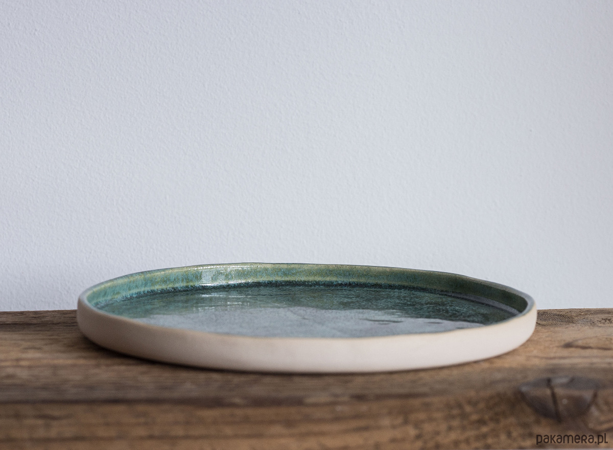 talerz ręcznie toczony z jasnej gliny kamionkowej