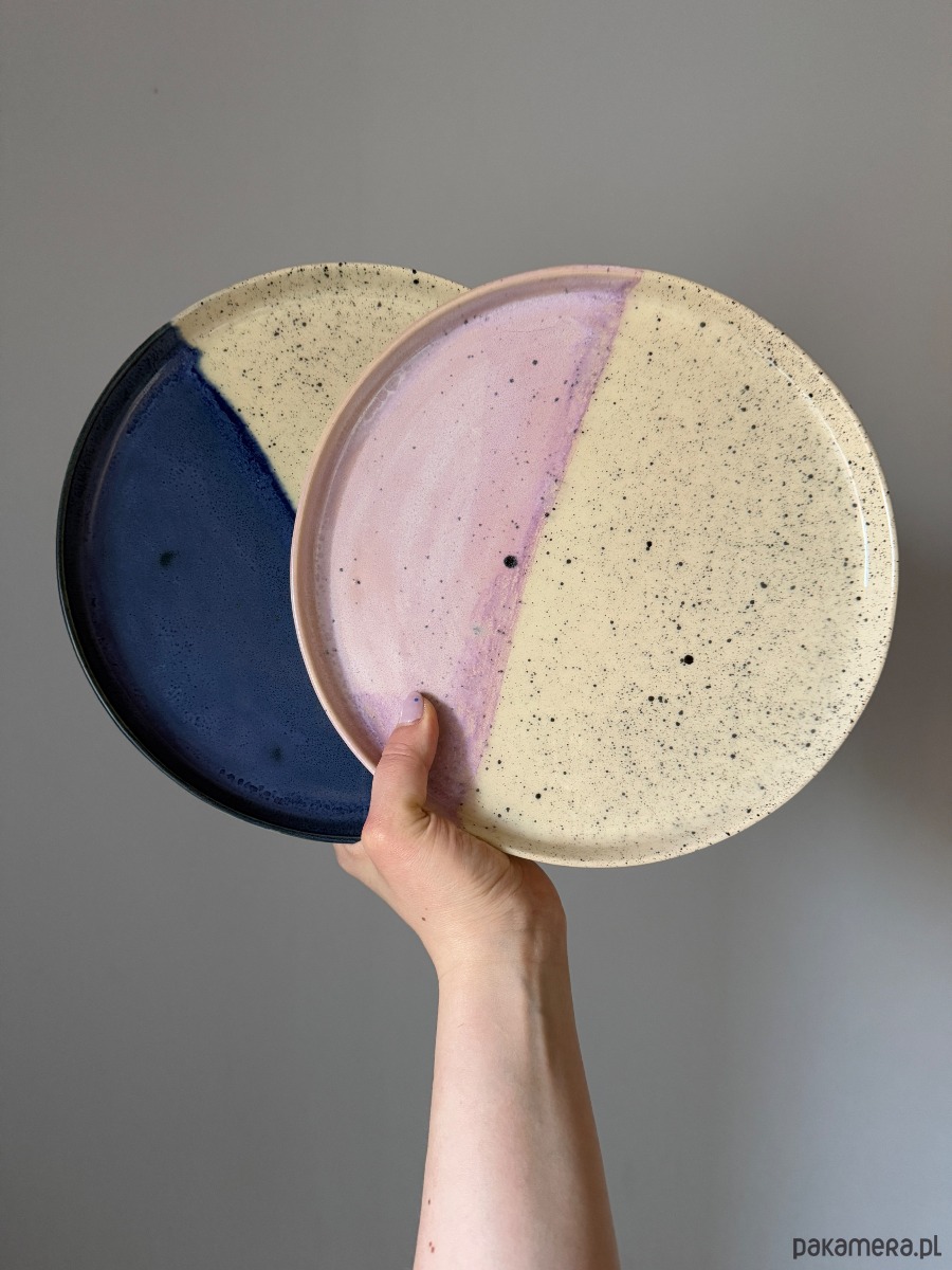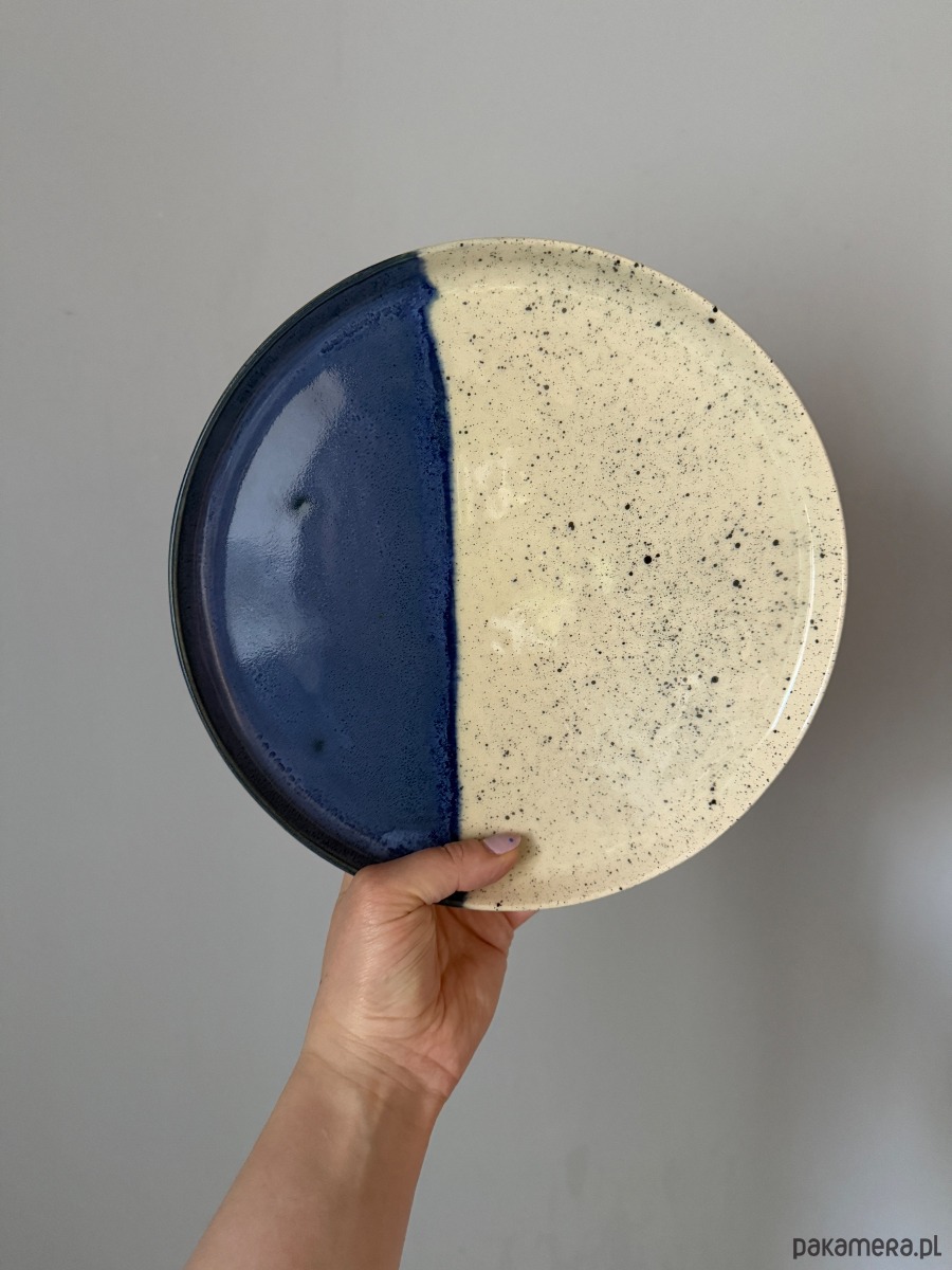 Ręcznie wykonany talerz, stworzony na kole garncarskim z jasnej gliny, pokrytej czarnymi ciapkami i kolorowym szkliwem.