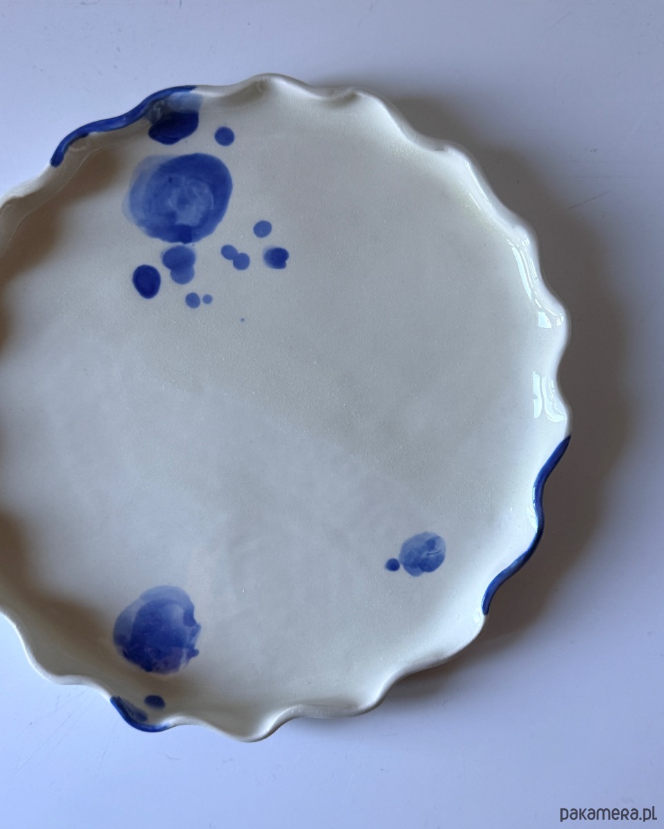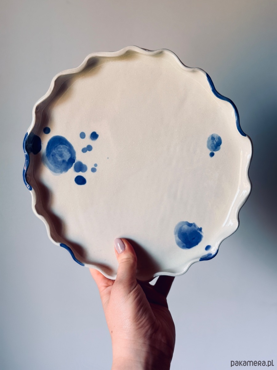 Ręcznie robiony i malowany talerz z akwarelowym motywem w kolorze kobaltu. Wykonany z białej gliny.