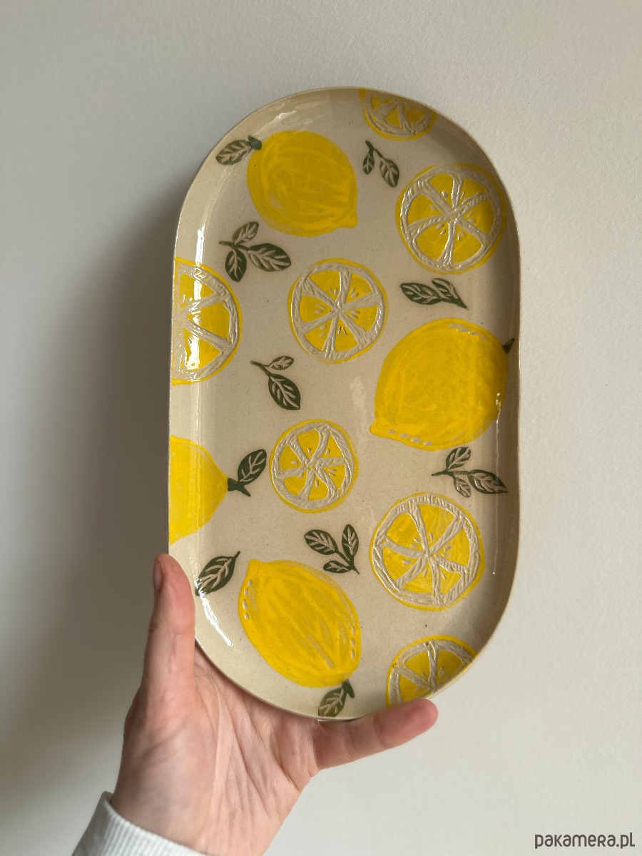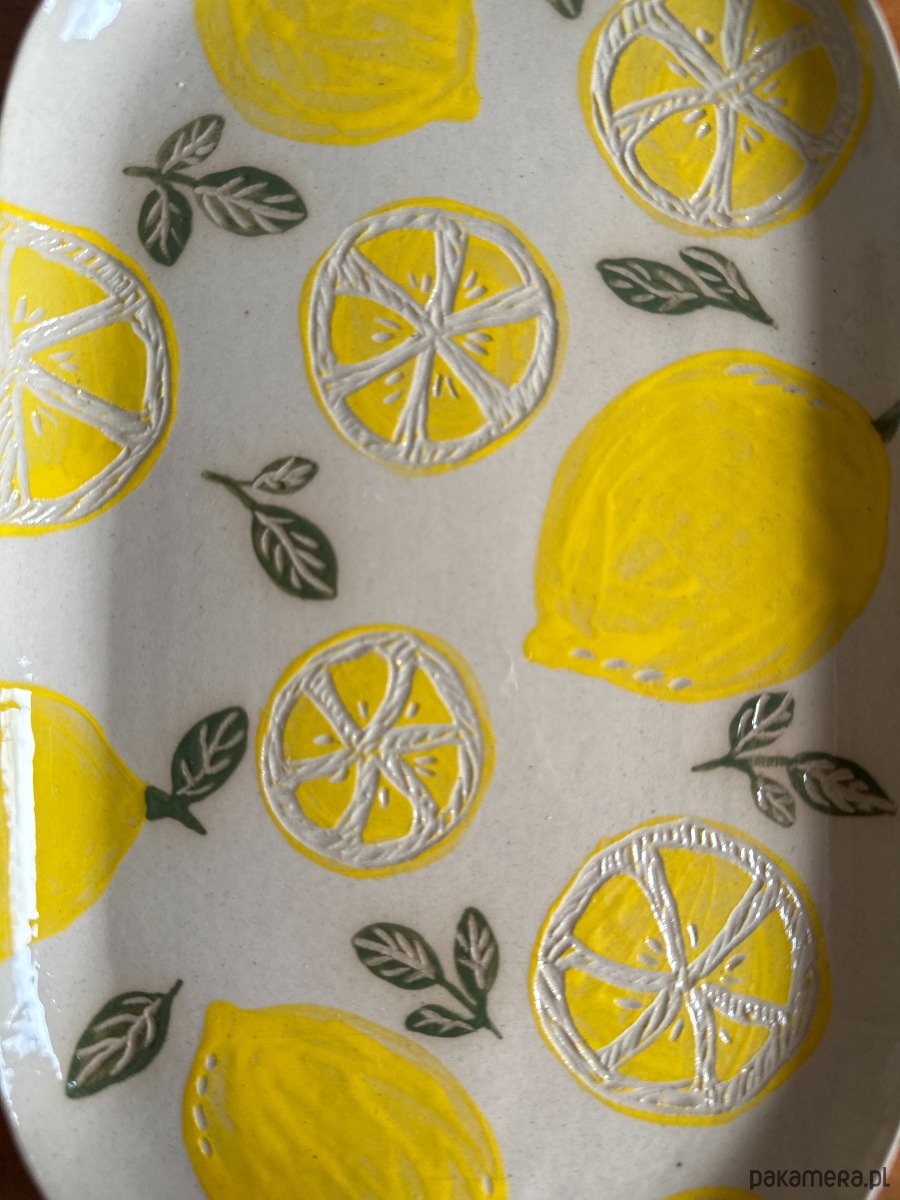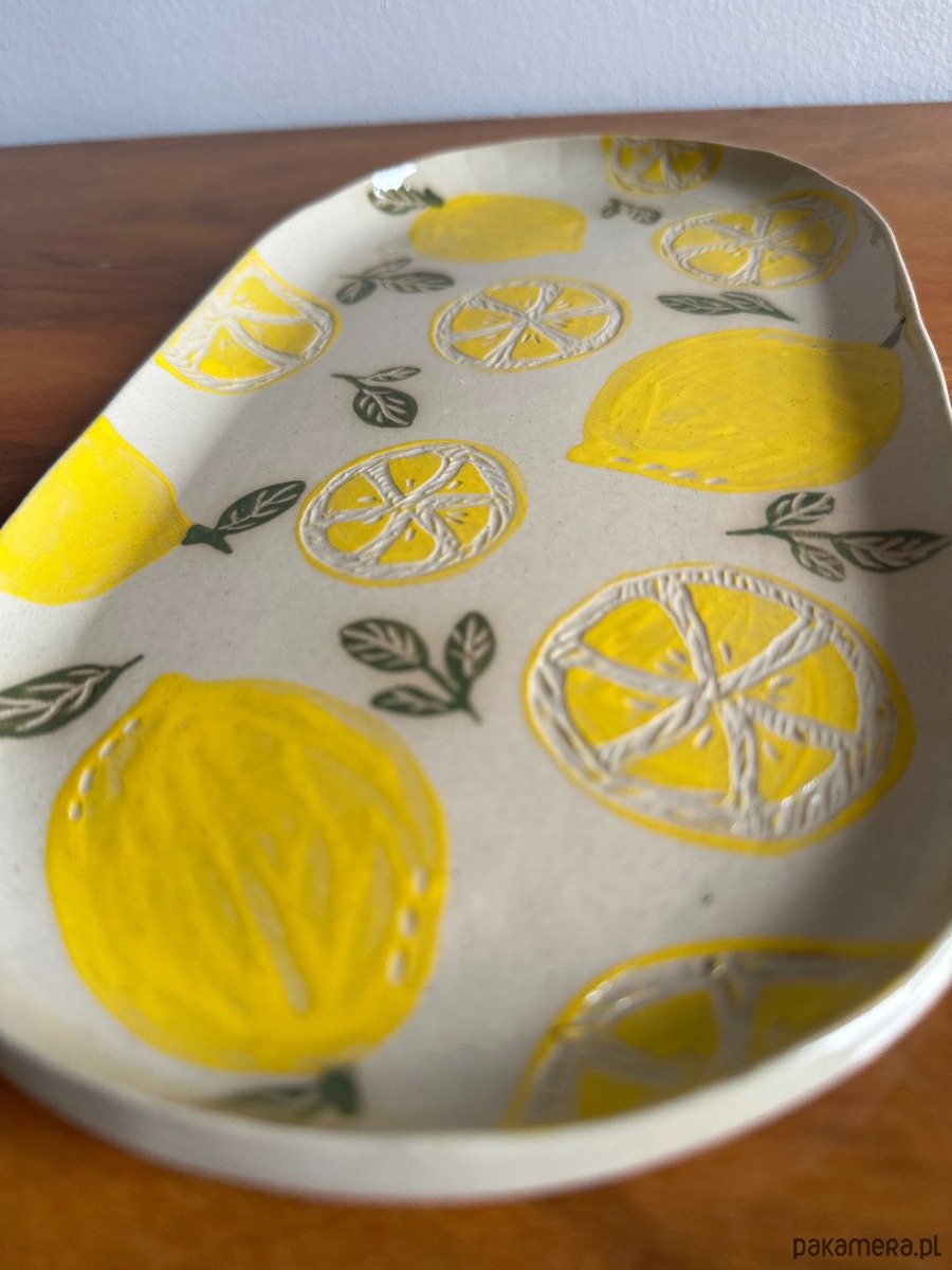 Ten wyjątkowy talerzyk/paterka to ręcznie wykonana forma, ozdobiona metodą sgraffito w radosny, cytrynowy wzór. Intensywne żółcie przełamane delikatną zielenią liści wprowadzają do wnętrza lekkość i letni klimat – nawet w środku zimy.