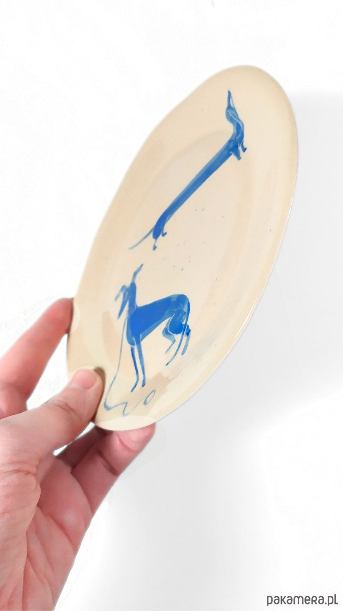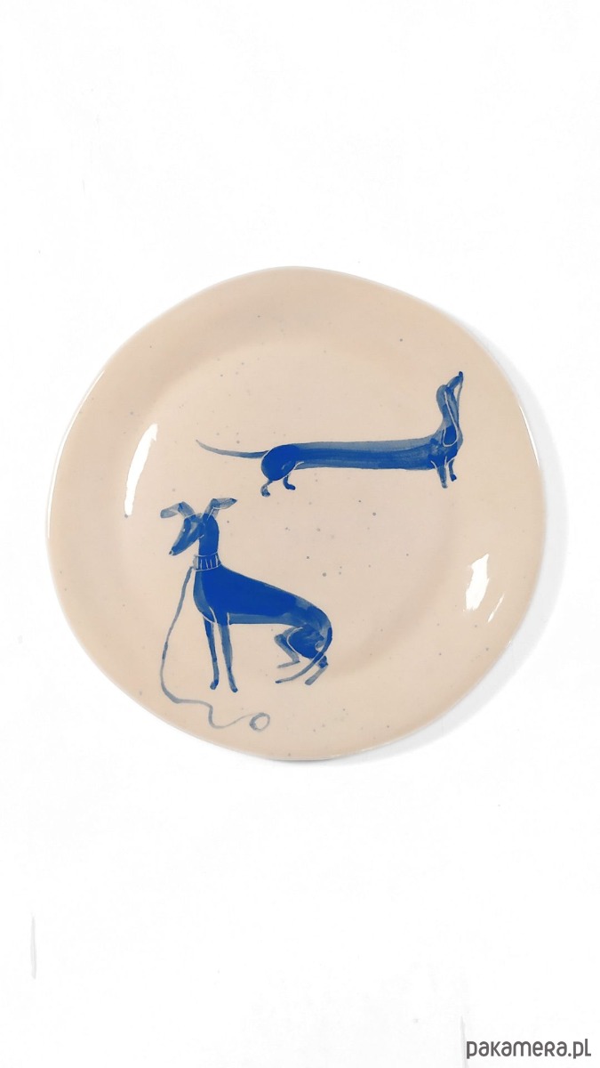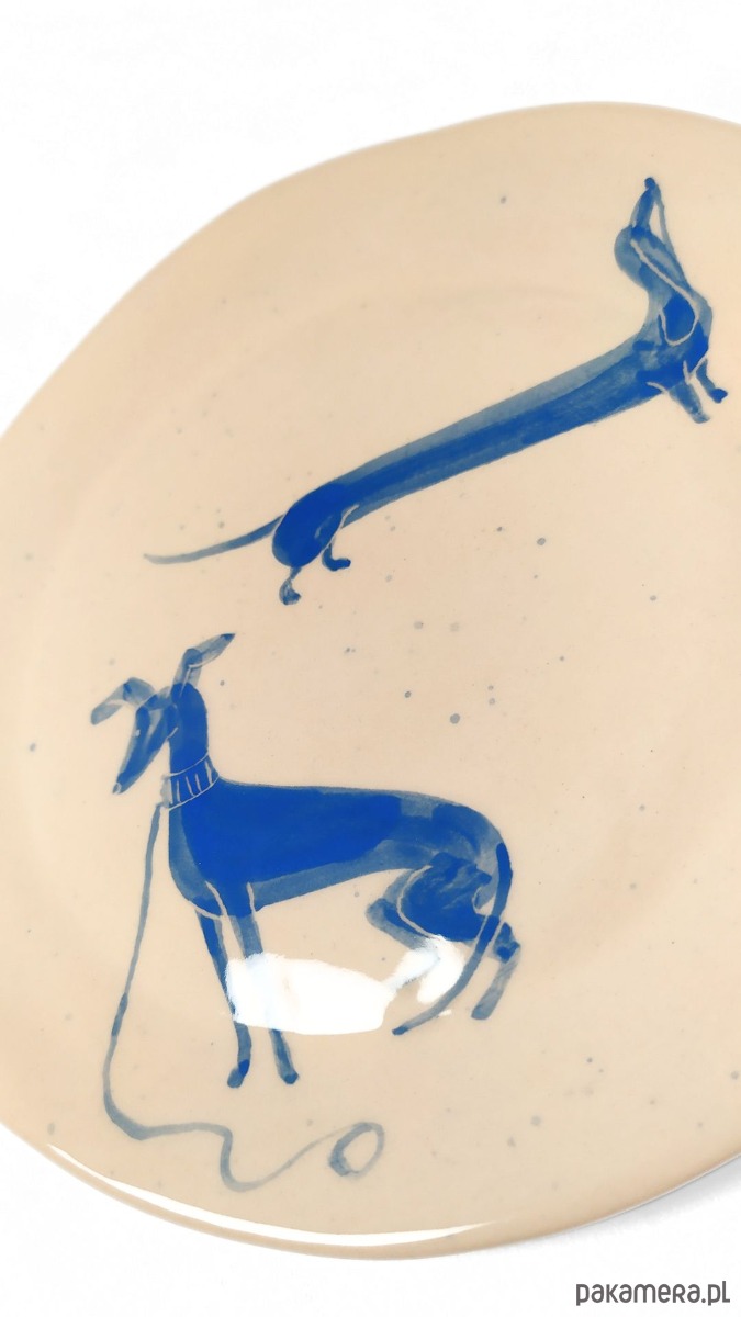 Grafika z ręcznie malowanymi pieskami - farbą podszkliwną w kolorze niebieskim, wykonany z wysokiej jakości kremowej gliny,100% handmade. Wypalany dwukrotnie, szkliwiony dwustronnie. Sygnowany. Zastosowane szkliwo nadaje się do kontaktu z żywnością. Talerzyk można myć w zmywarce. Średnica ok. 16 cm, wys. 2 cm
