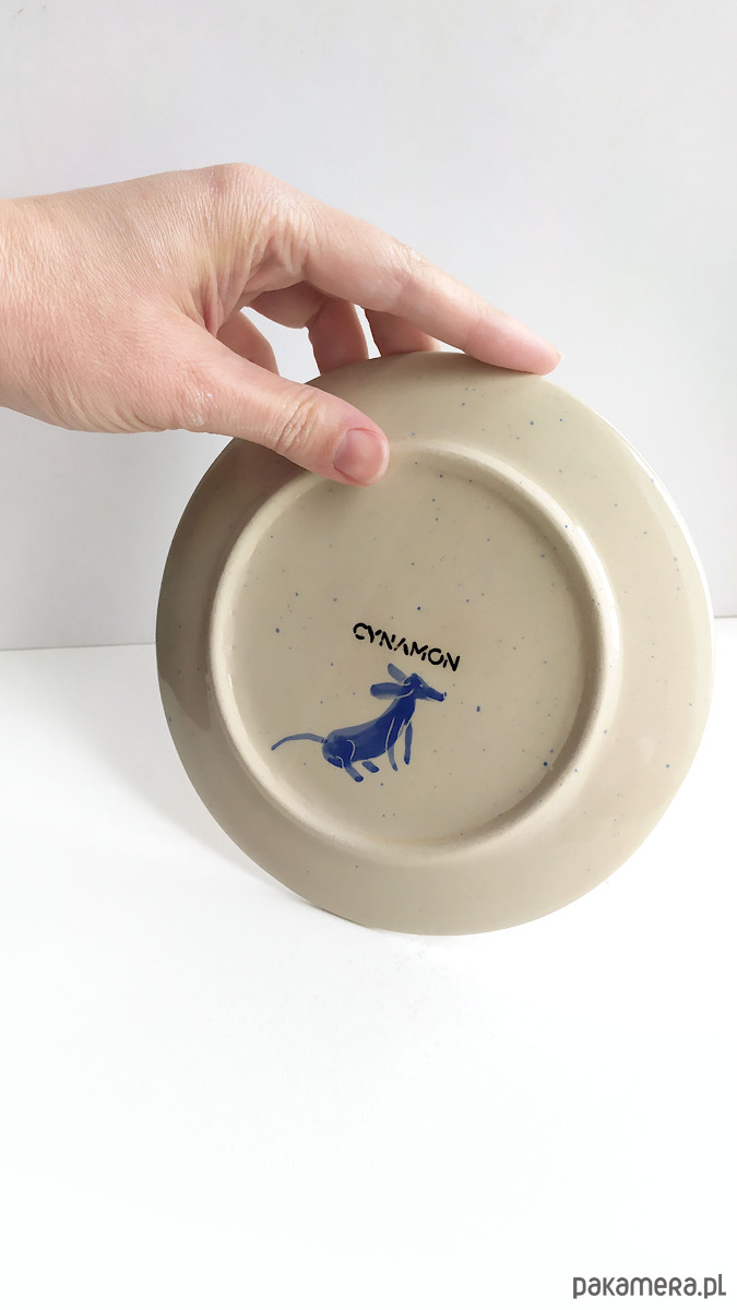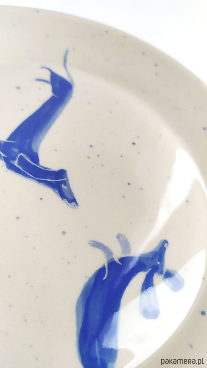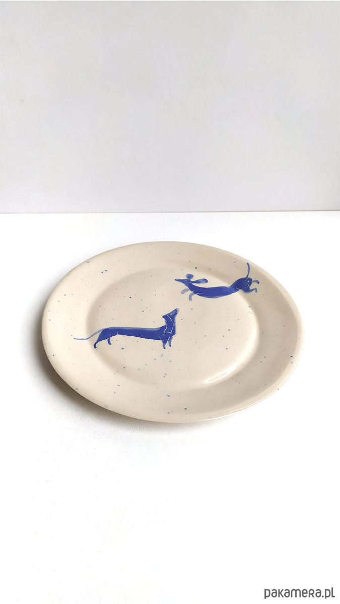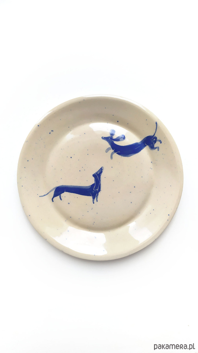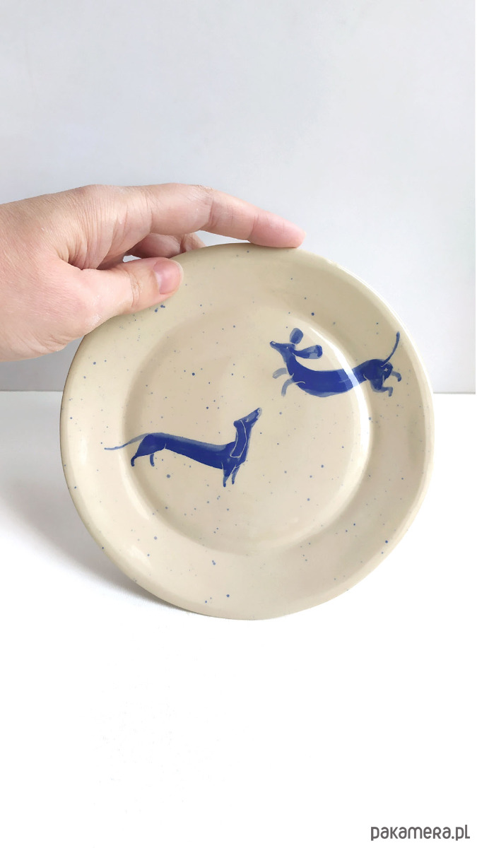 Grafika z ręcznie malowanymi pieskami - farbą podszkliwną w kolorze niebieskim, wykonany z wysokiej jakości kremowej gliny,100% handmade. Wypalany dwukrotnie, szkliwiony dwustronnie. Sygnowany. Zastosowane szkliwo nadaje się do kontaktu z żywnością. Talerzyk można myć w zmywarce. Średnica ok. 16 cm, wys. 2 cm