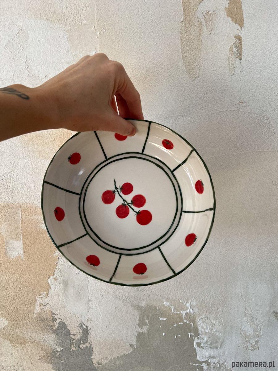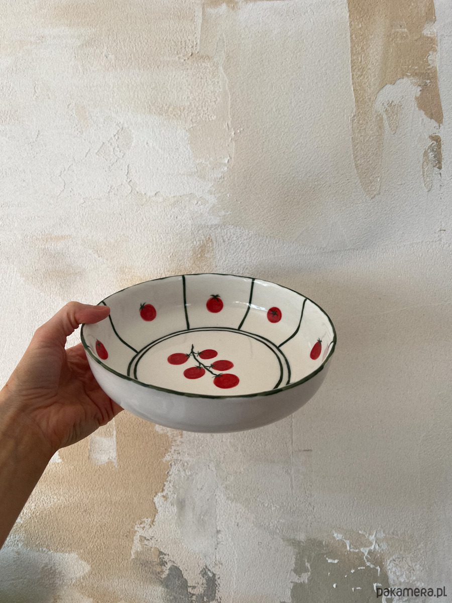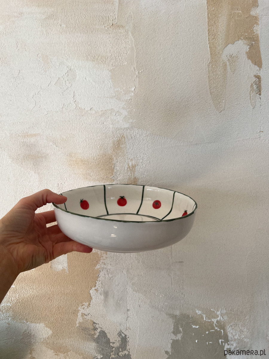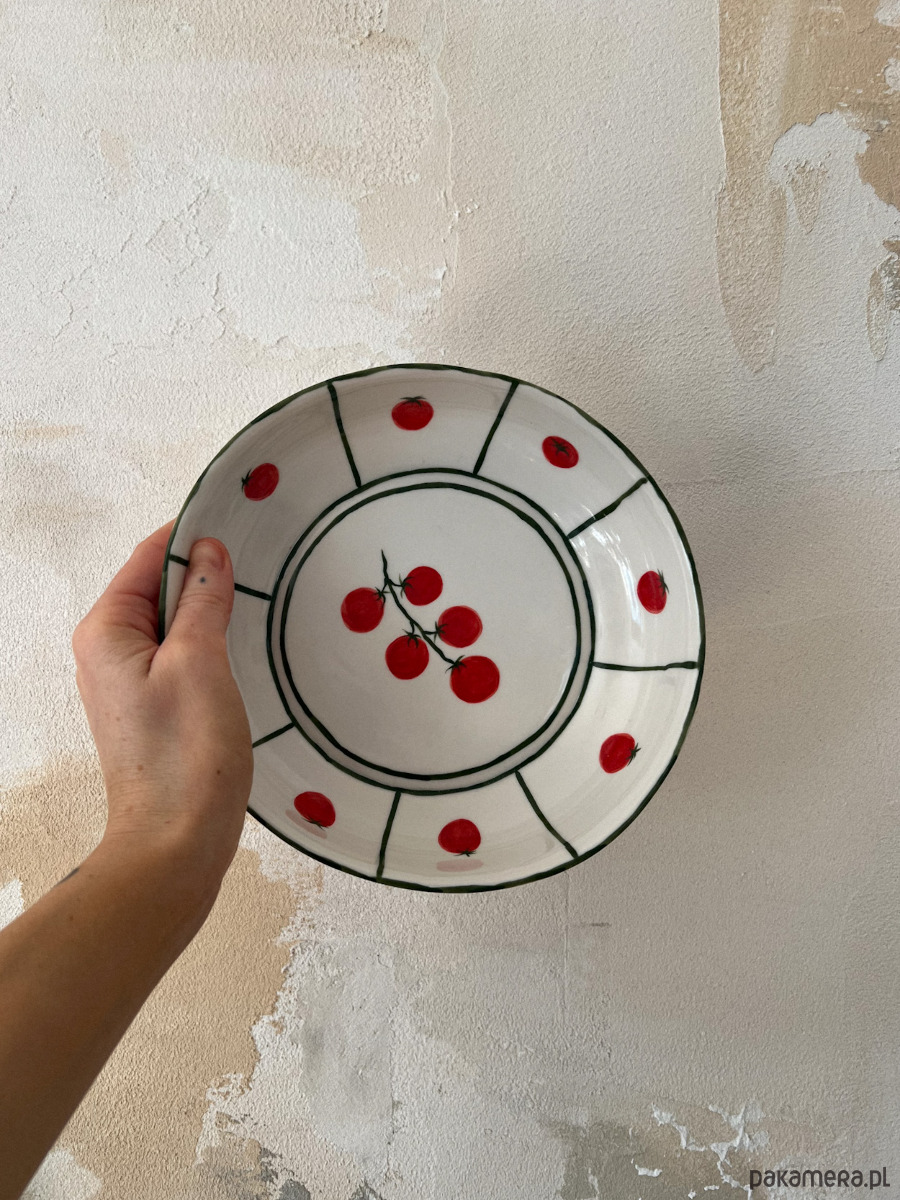 Porcelanowy głęboki talerz z pomidorkami.