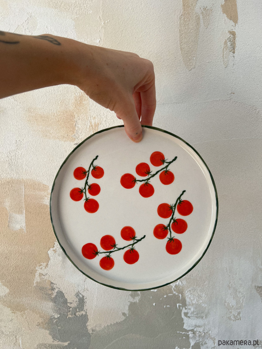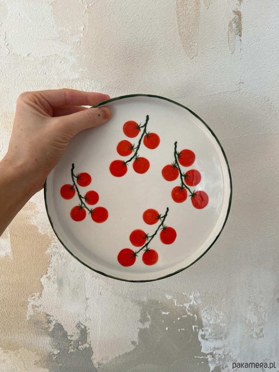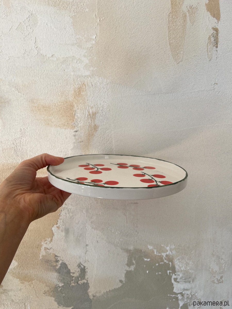 Porcelanowy talerz w pomidorki z zielonym rantem.