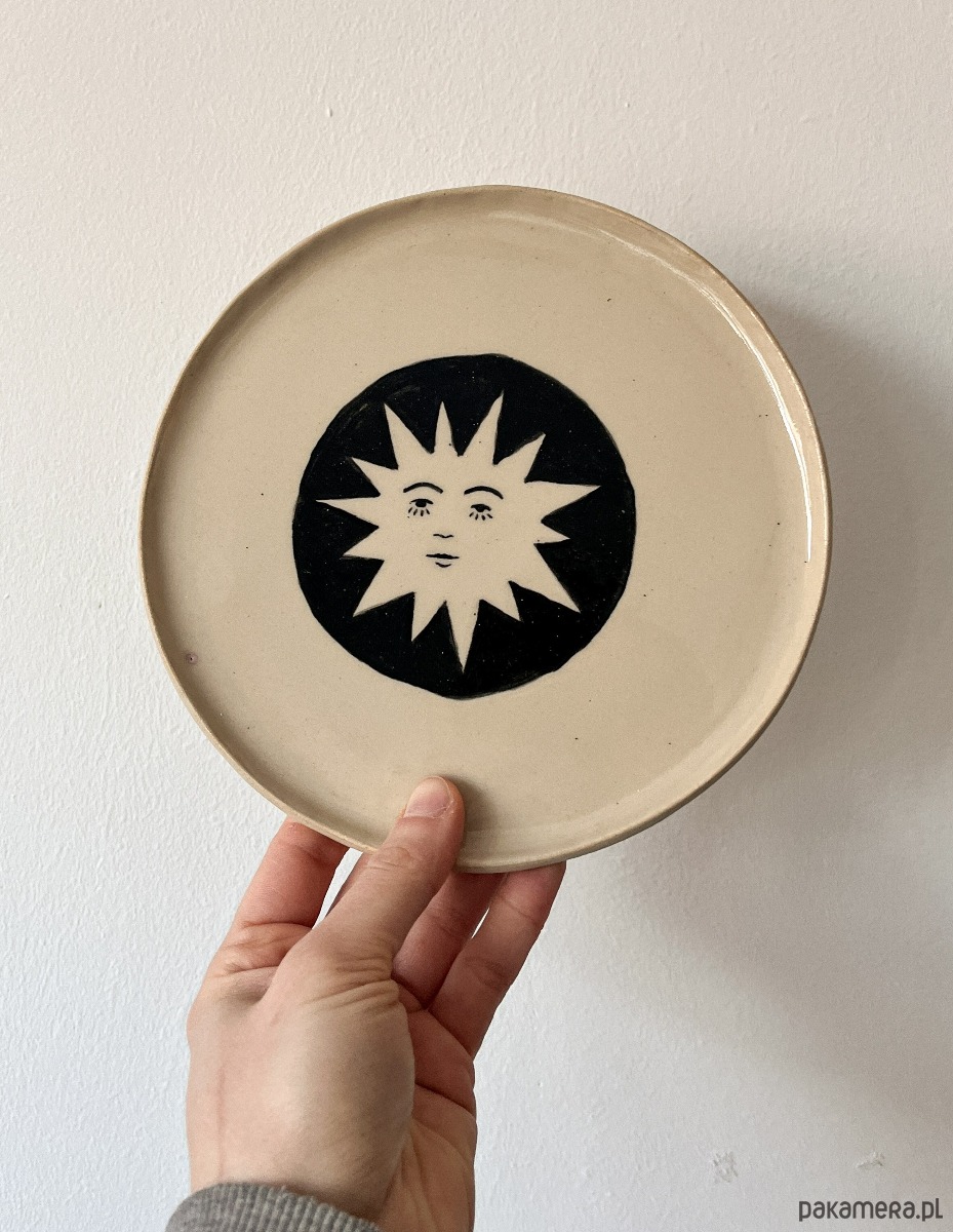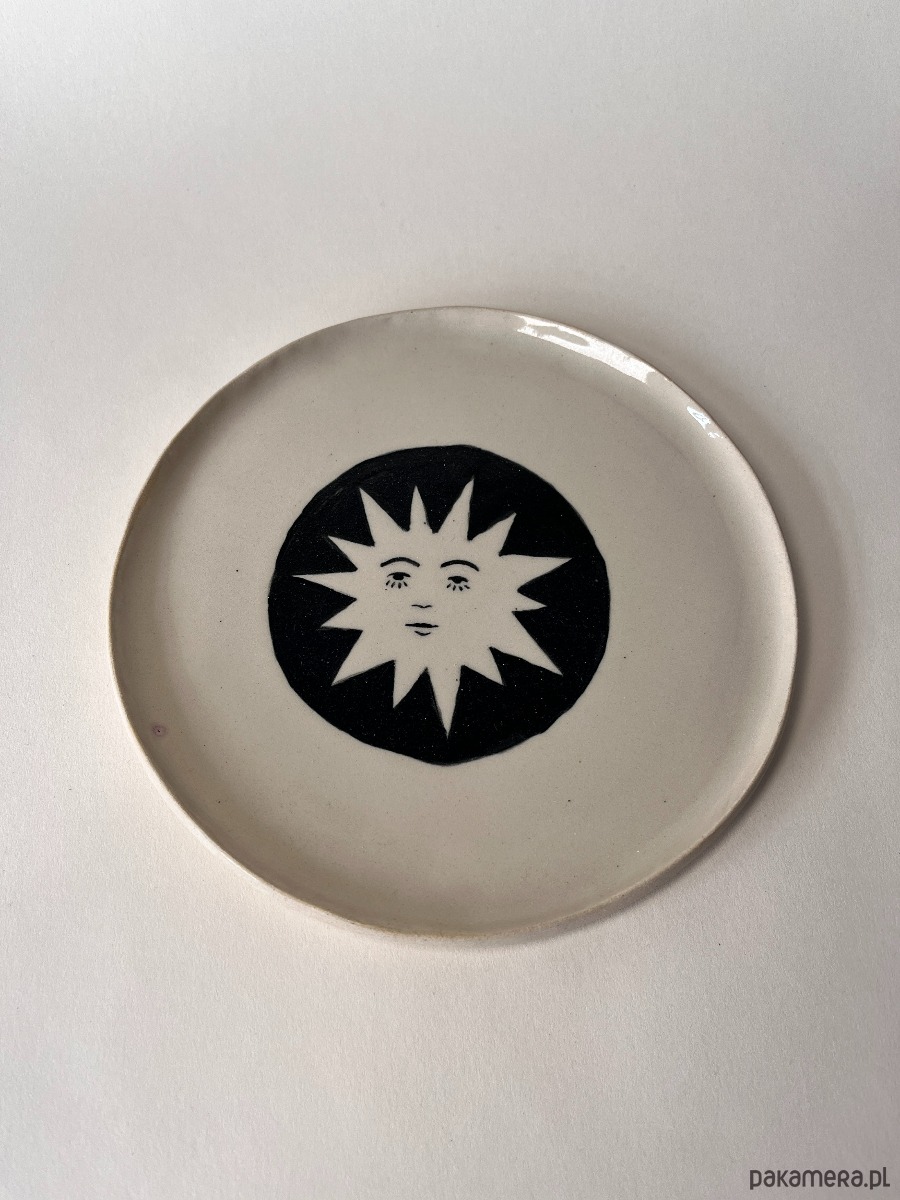 Talerz z jasnej masy ceramicznej, z grafiką słońca. Pokryty szkliwem z atestem przydatności do kontaktu z żywnością.
