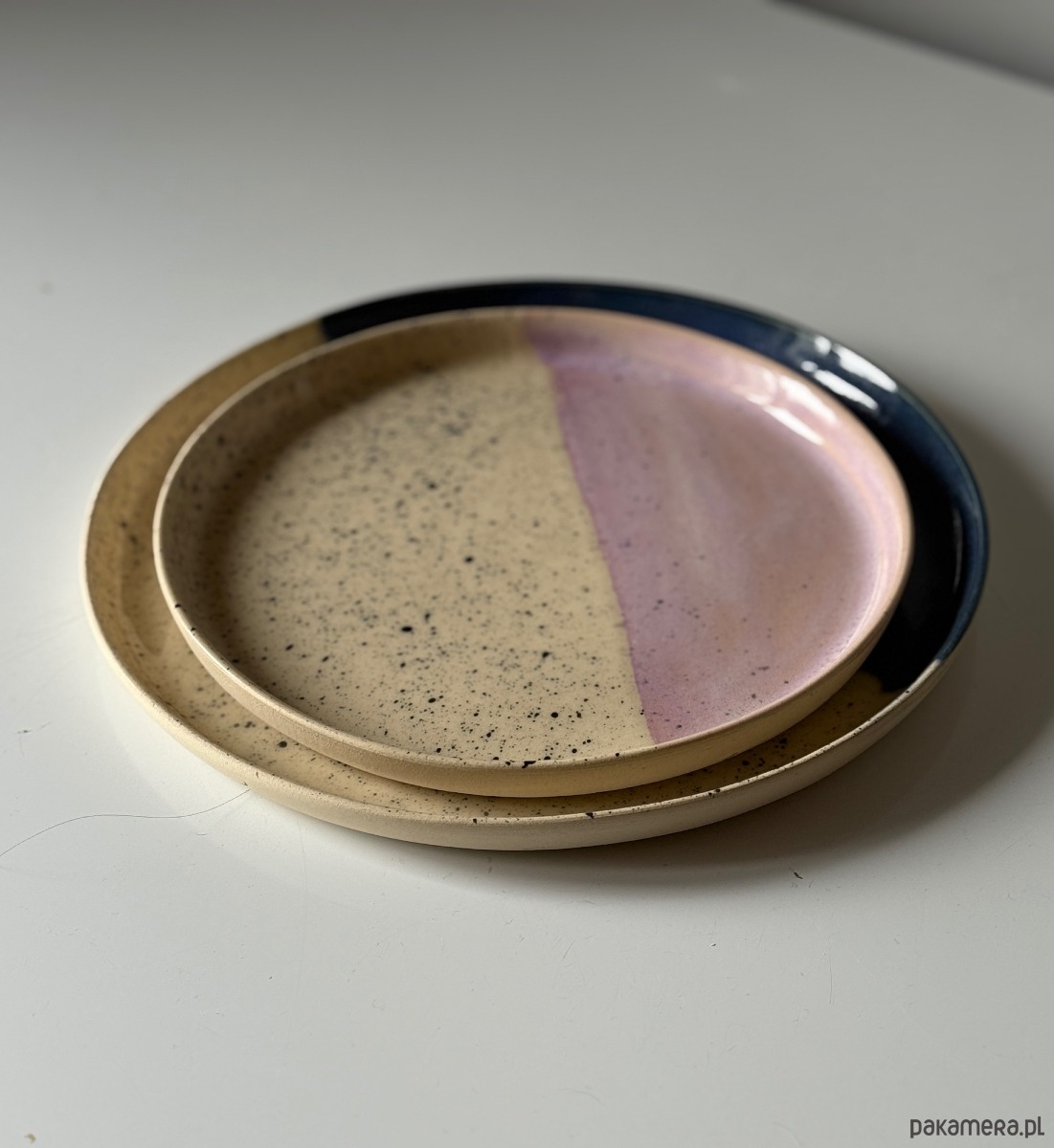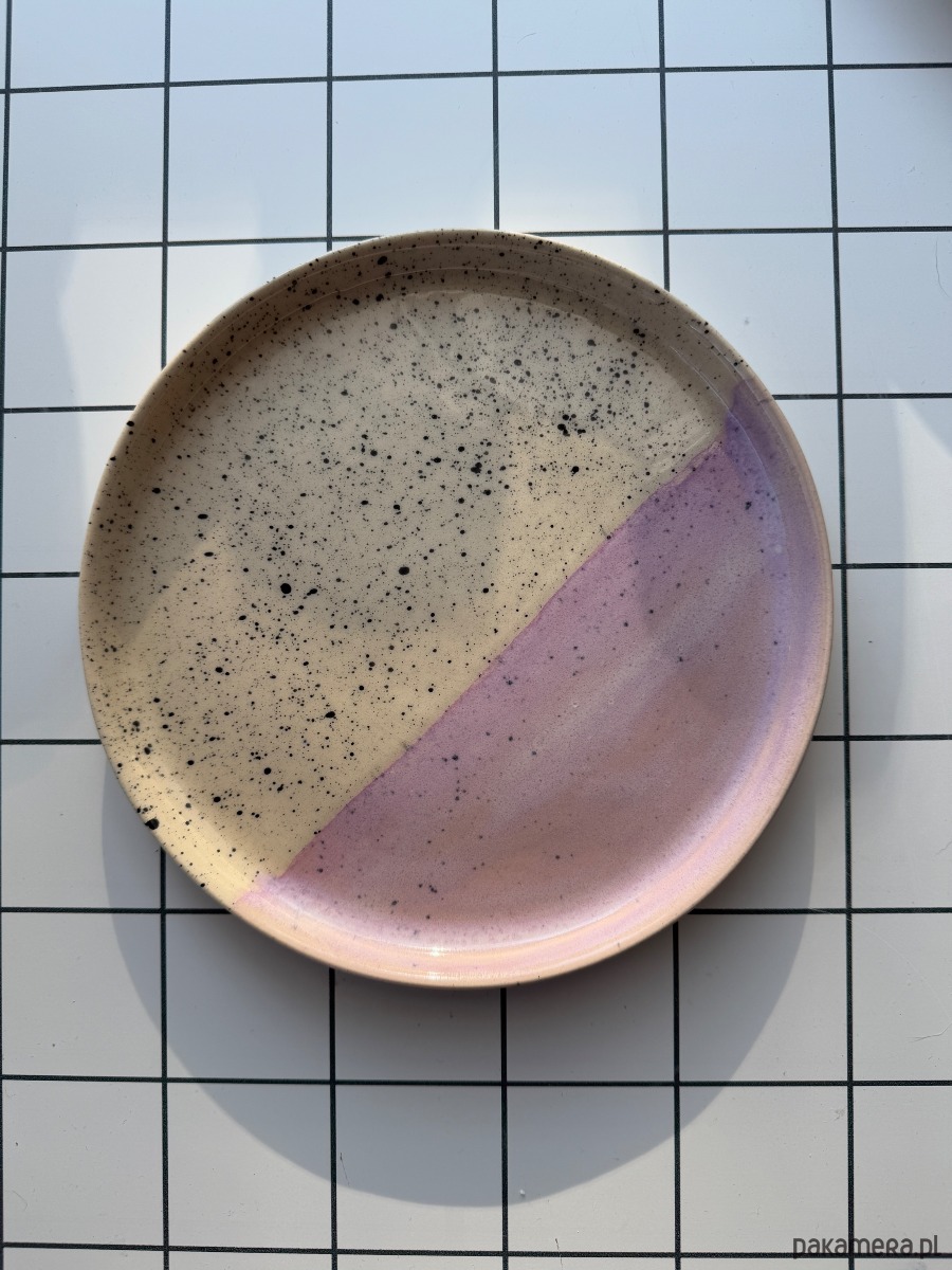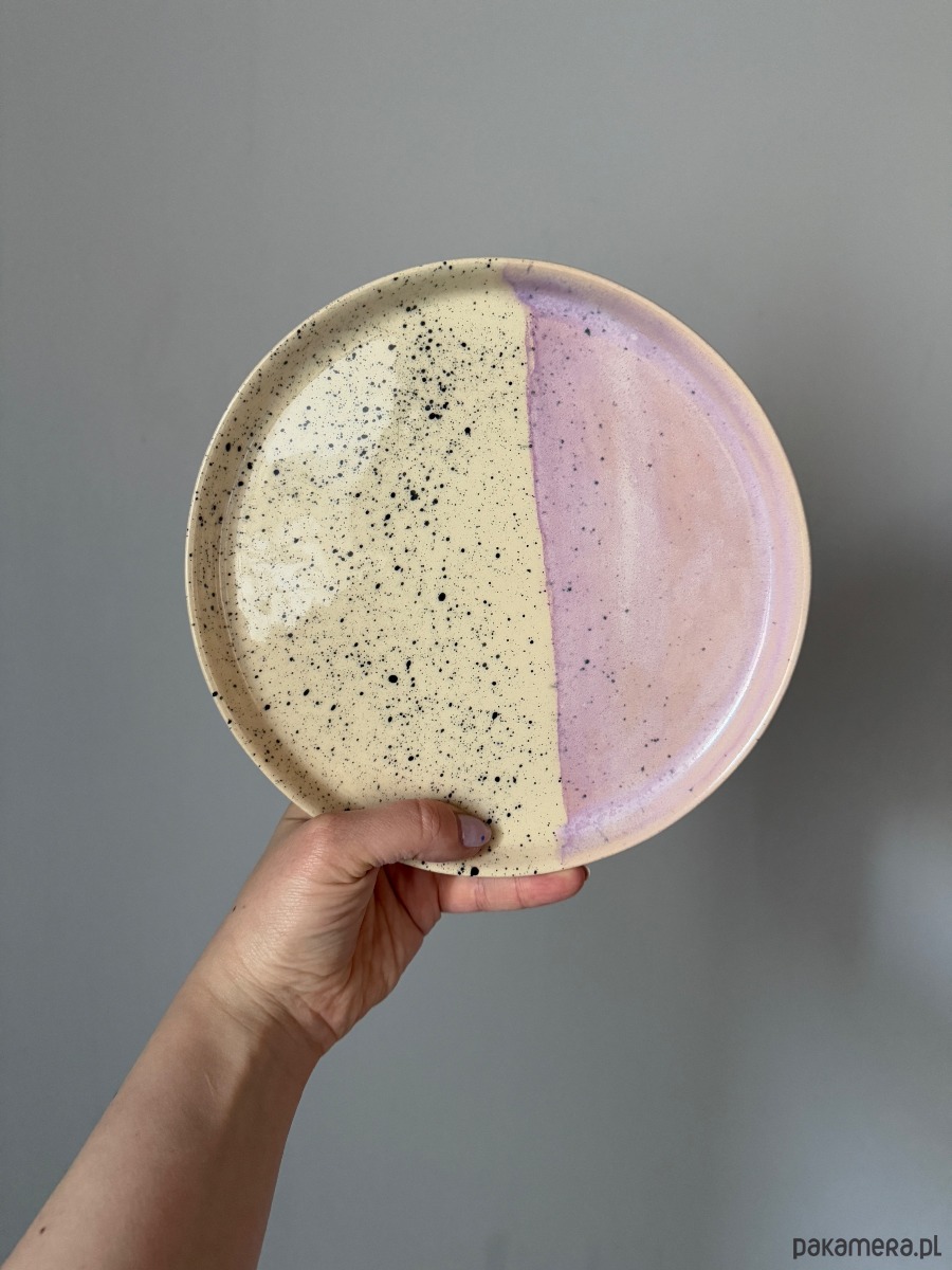 Ręcznie wykonany talerz, stworzony na kole garncarskim z jasnej gliny, pokrytej czarnymi ciapkami i różowym szkliwem.