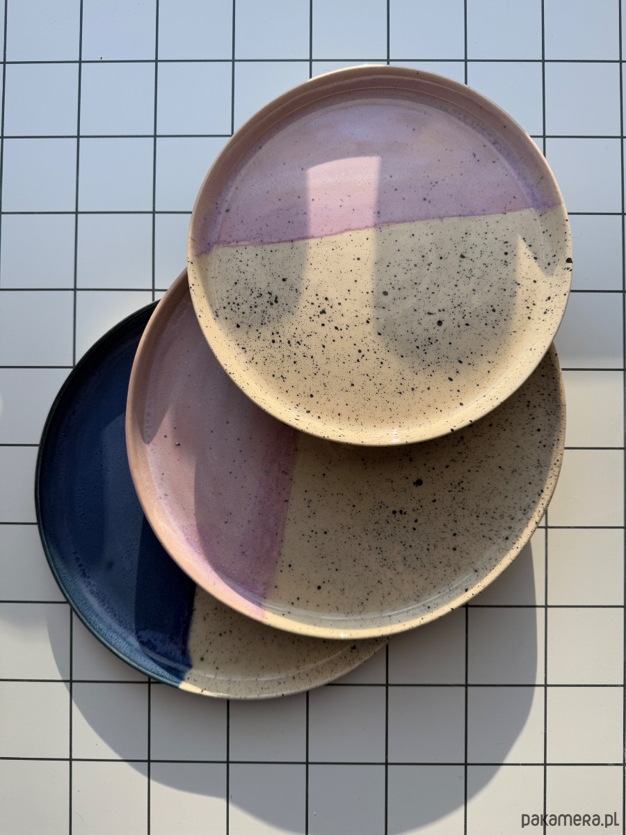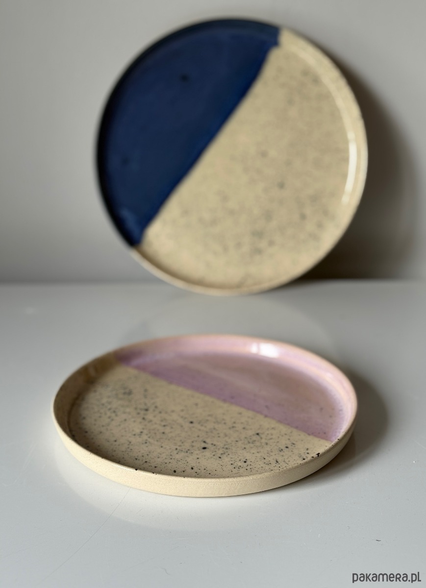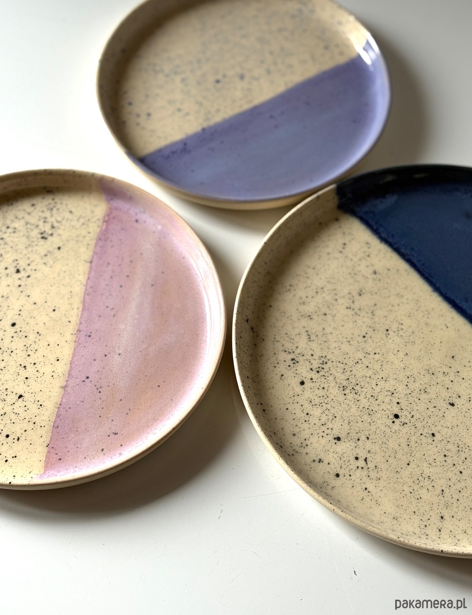 Ręcznie wykonany talerz, stworzony na kole garncarskim z jasnej gliny, pokrytej czarnymi ciapkami i różowym szkliwem.