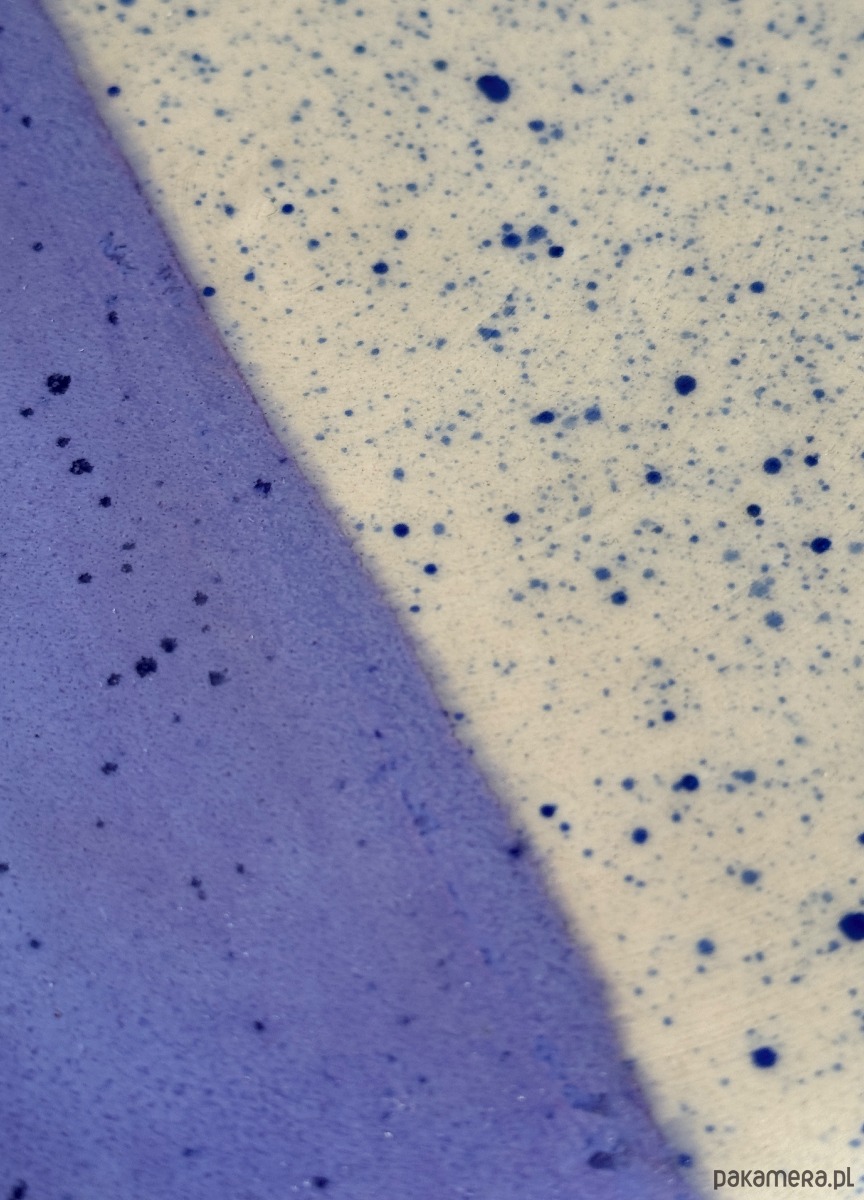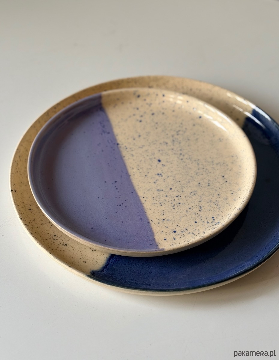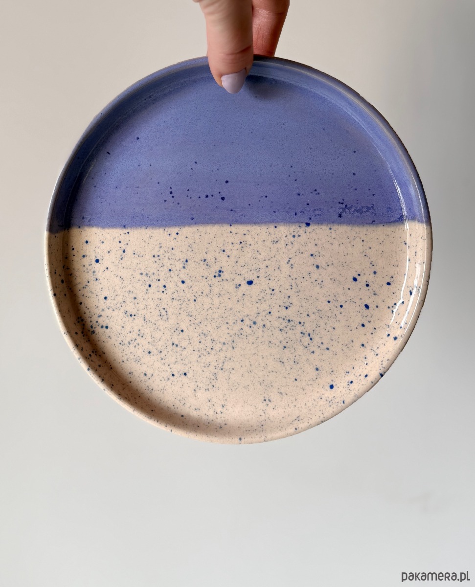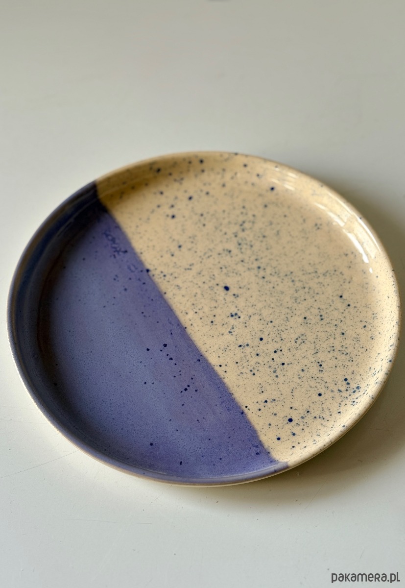 Ręcznie robiony i malowany talerz śniadaniowy, pokryty fioletowym szkliwem i niebieskimi ciapkami.