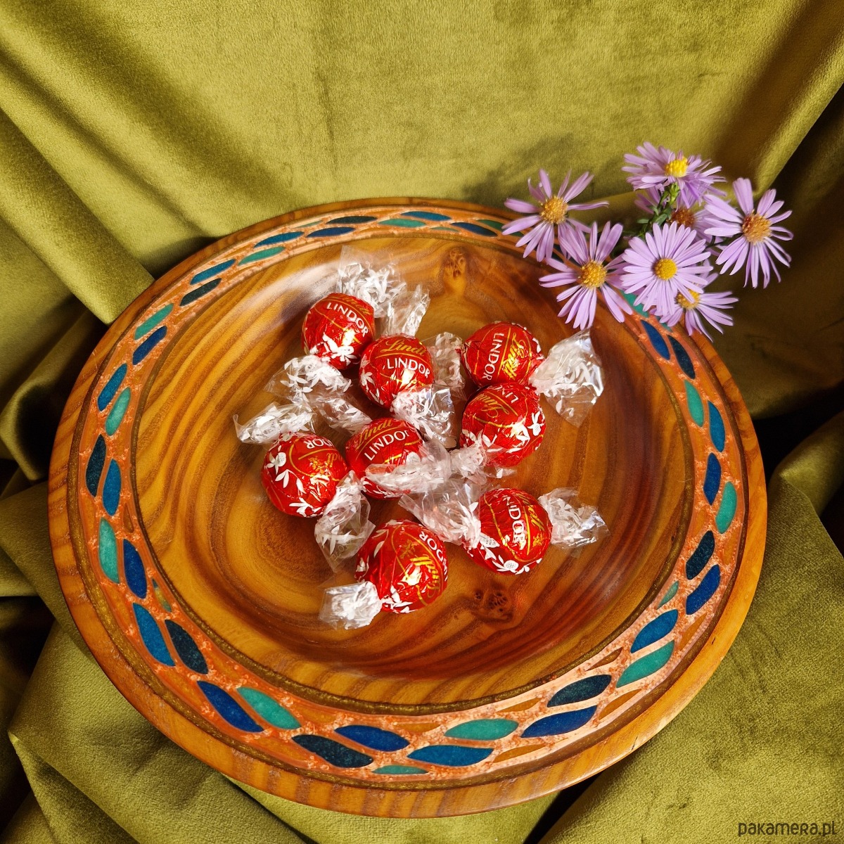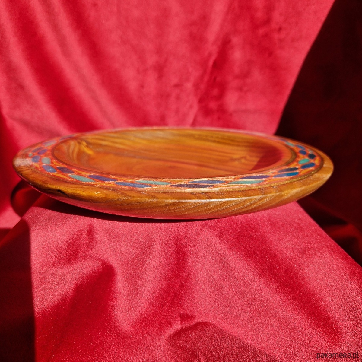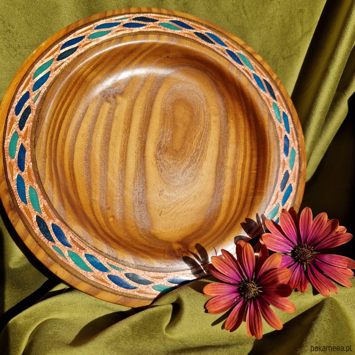 Dekoracyjny talerz z drewna i żywicy epoksydowej zarówno działa na wyobraźnię jak i na estetykę. Ręcznie wykonany na tokarce z rzadkiego drewna dzikiej oliwki, ukazuje słoje wirujące jak topniejące rzeki, odważne i hipnotyzujące. Wzdłuż krawędzi, wąż z łuskami osadzonymi w ciepłej miedzi, odpoczywa zawinięty w rzece złotej żywicy epoksydowej. Jego łuski mienią się jak żywe głębokim niebiesko-zielonym kolorem odbijając światło.