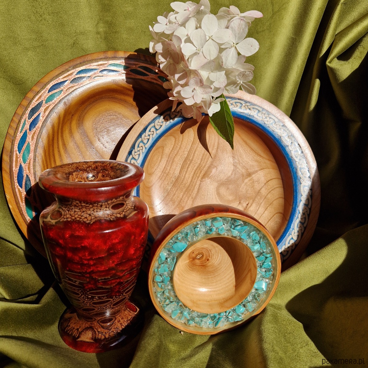 Każde spojrzenie wciąga cię głębiej. Każdy dotyk łączy cię z ponadczasowym rytmem tworzenia. Funkcjonalny, a jednocześnie hipnotyzujący, talerz z drewna i żywicy epoksydowej przekształca każdą przestrzeń w miejsce niezwykłe. Przechowuje skarby, jest świadectwem sztuki rękodzielniczej lub po prostu istnieje jako mit, który stał się rzeczywistością - uderzający hołd dla wiecznego cyklu odradzania się i piękna rzemiosła.