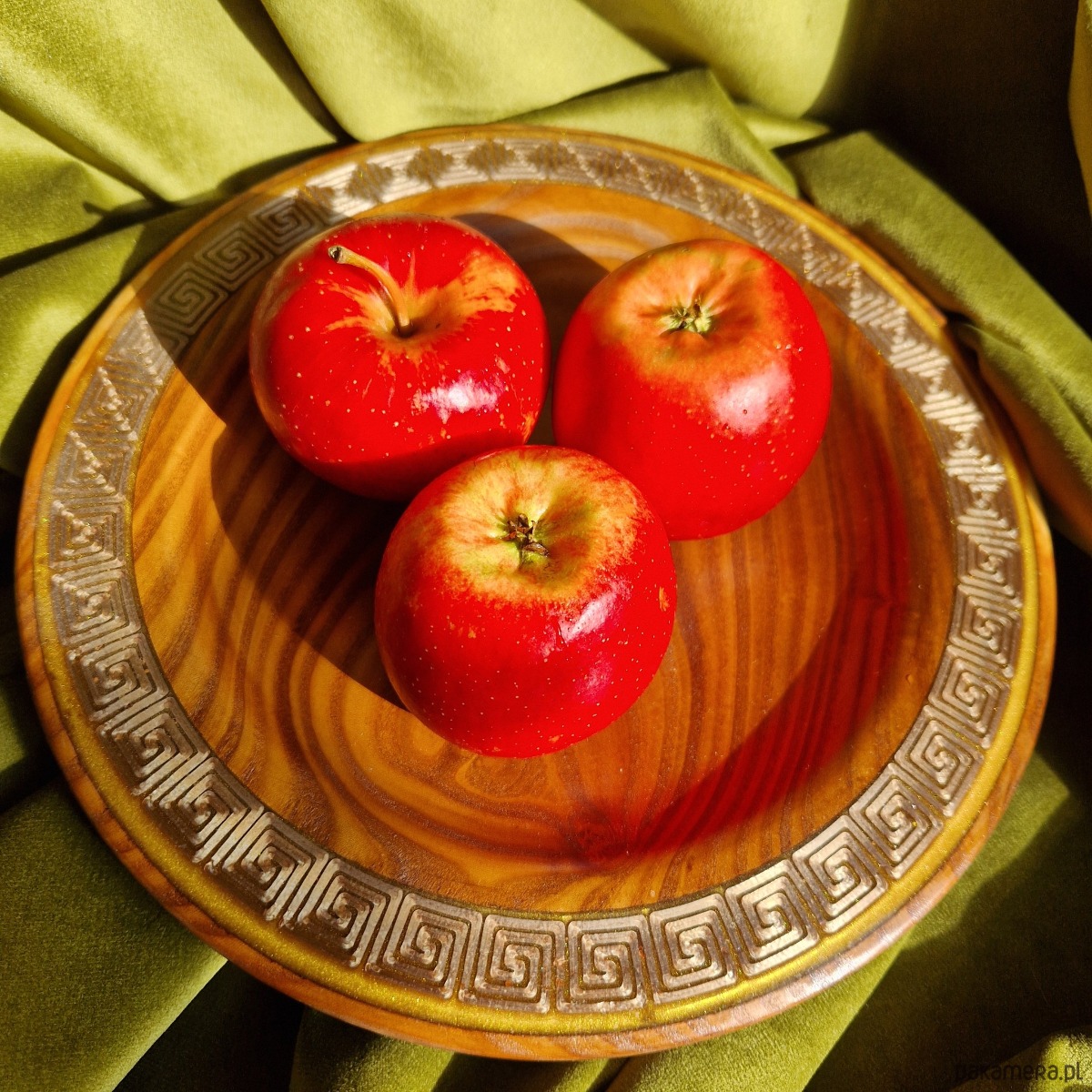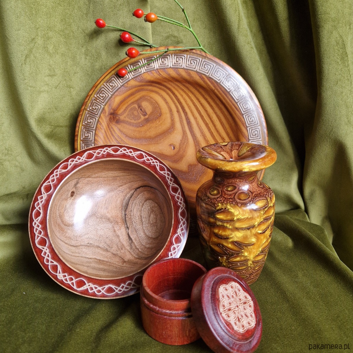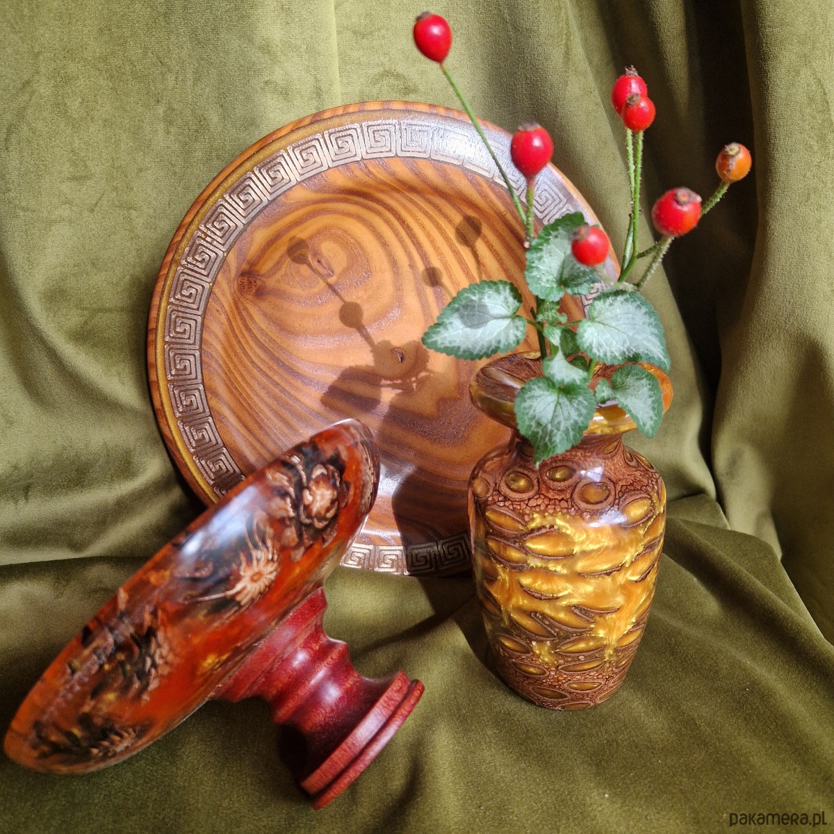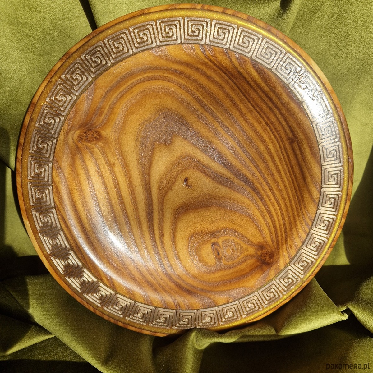 Światło słoneczne sprawia, że grecki wzór świeci jak starożytny brąz. Podczas obracania talerza blask zmienia się, dodając magicznej głębi. Oświetlenie wewnętrzne ujawnia ciepłe, naturalne brązowe odcienie drewna, nawet jeśli na zdjęciach pojawiają się odcienie czerwieni.