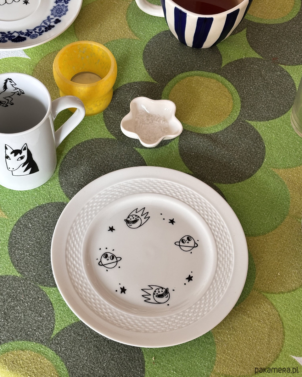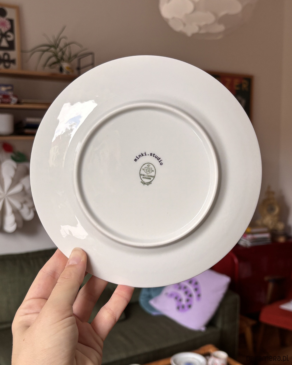 To naczynie ma już swoją historię – znalazłam je na pchlim targu, aukcjach online, a czasem nawet na śmietniku (serio!). Ozdobiłam je moimi autorskimi ilustracjami, które ręcznie przeniosłam na naczynia techniką kalkomanii ceramicznej. Na koniec całość wypaliłam w wysokiej temperaturze, dzięki czemu wzory są trwałe i bez problemu można je myć w zmywarce.
