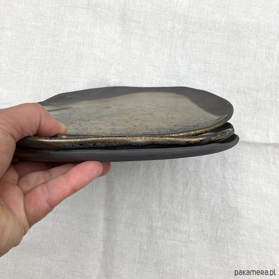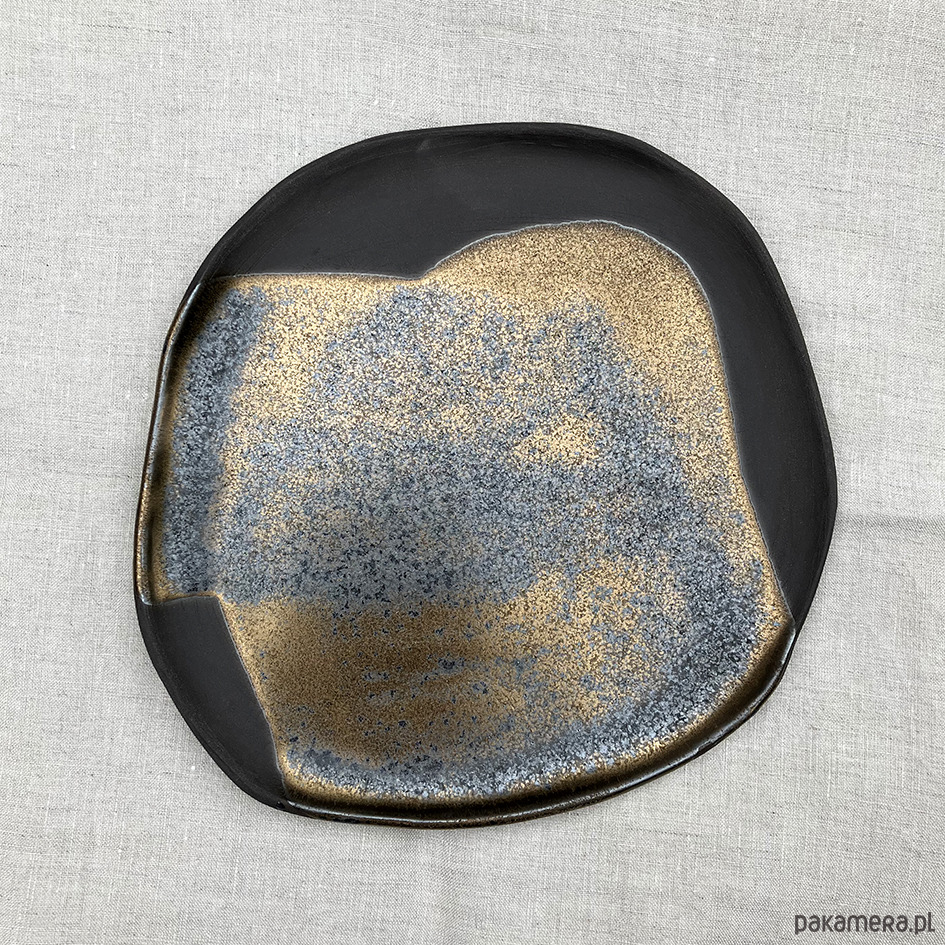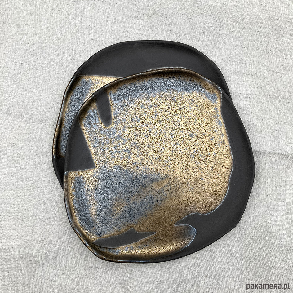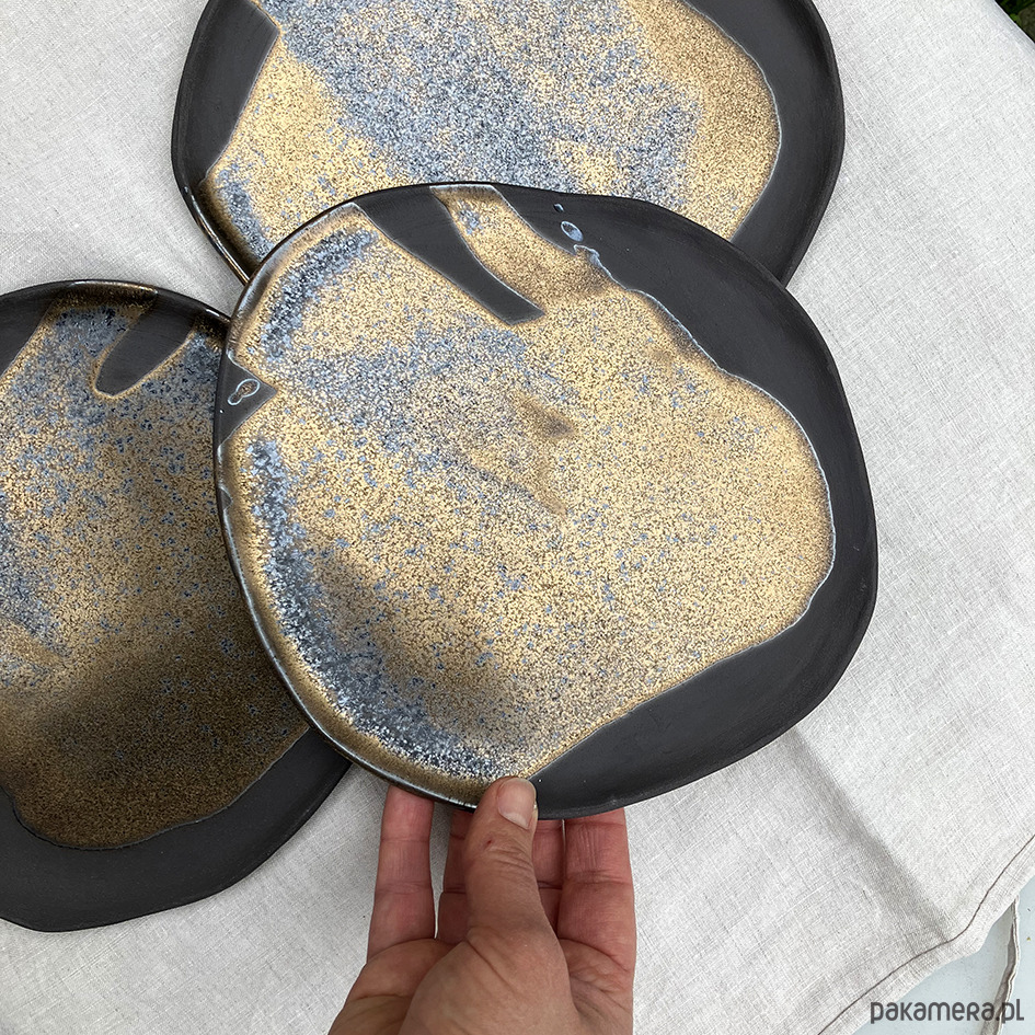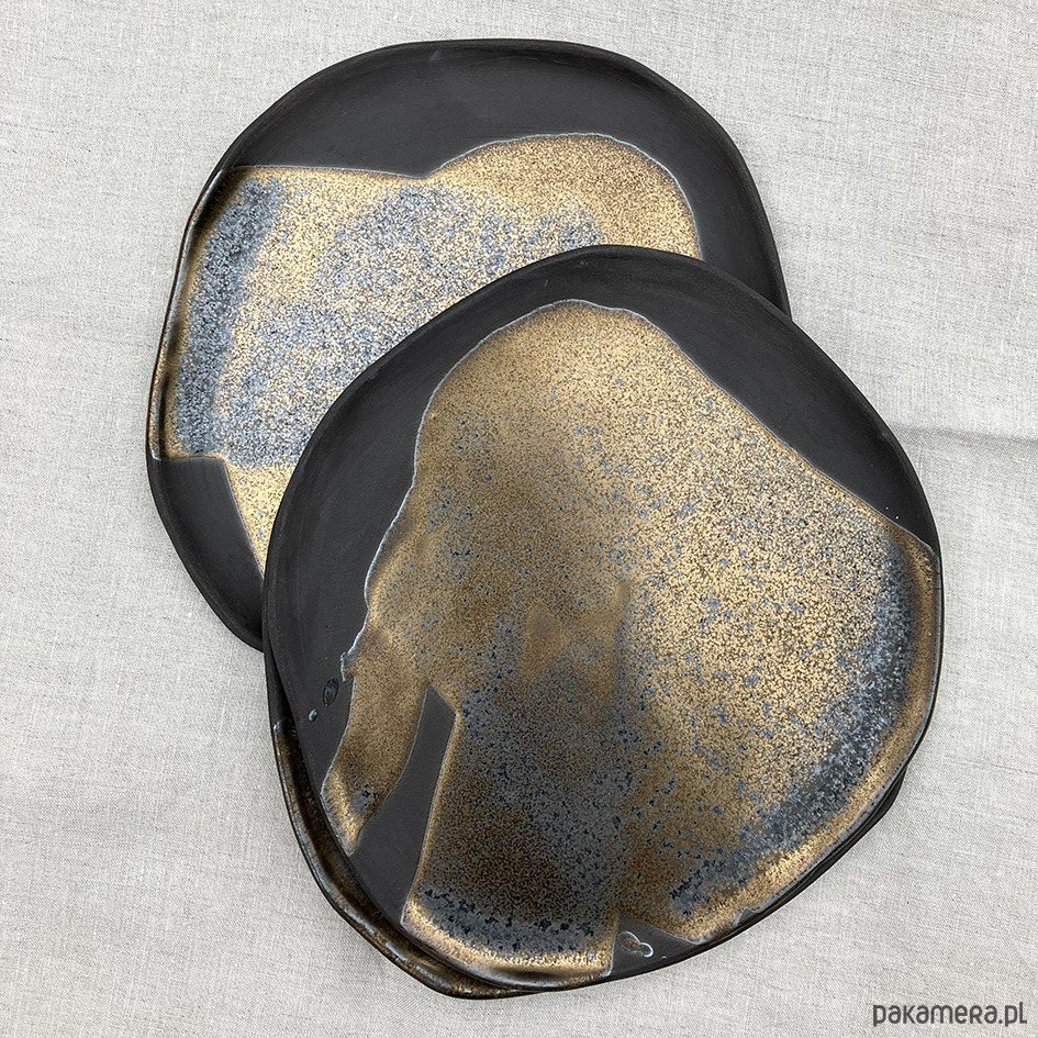 Niezwykle oryginalne talerze szkliwione brązowo-zlotym, mieniącym się szkliwem.