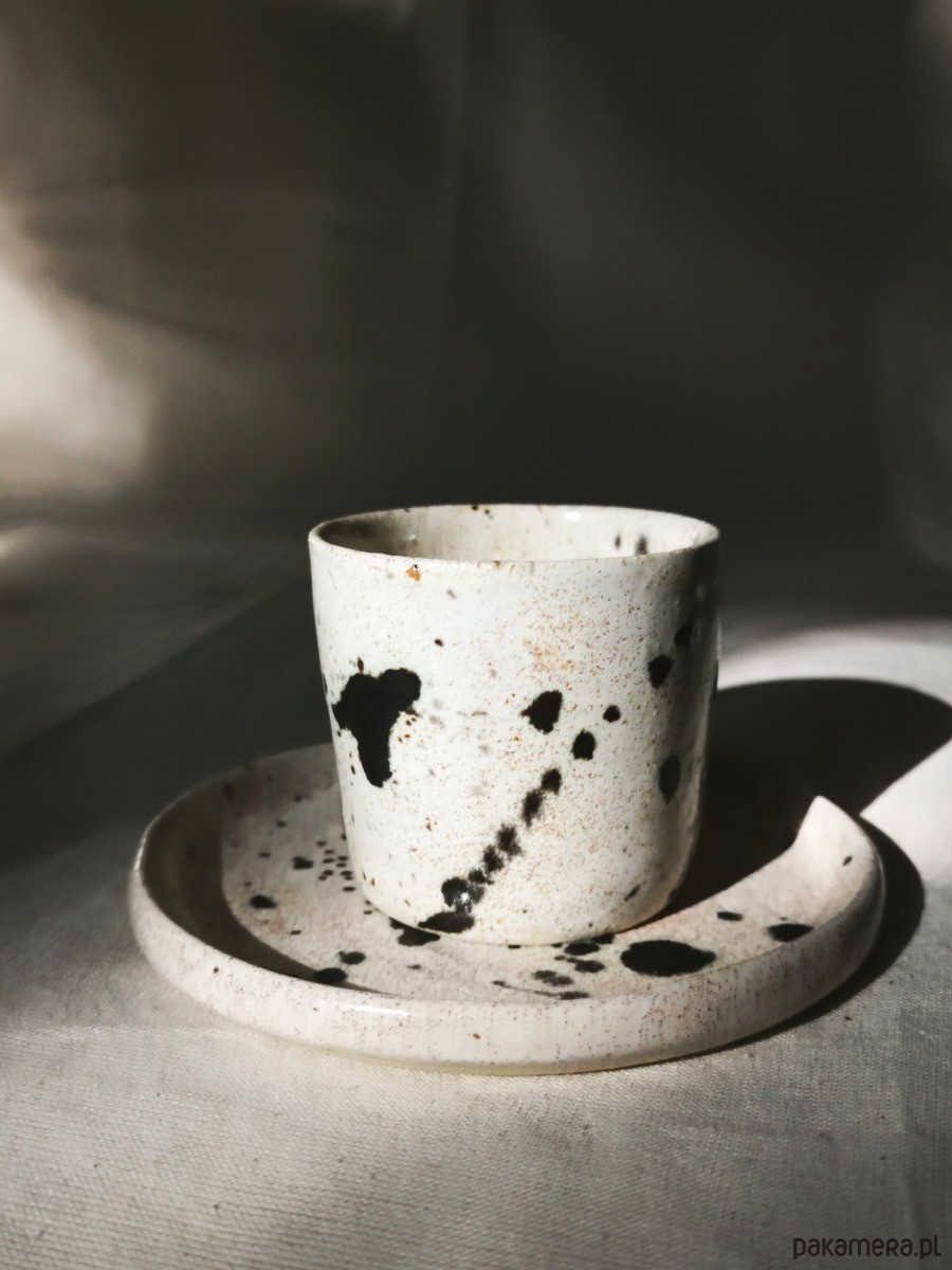 Ręcznie toczony talerzyk, stworzony jako dopełnienie filiżanki ze złotej serii. Subtelny beż z delikatnymi, złotymi i ciemnymi akcentami sprawia, że całość wygląda elegancko i naturalnie – jak spokojny poranek w miękkim świetle.