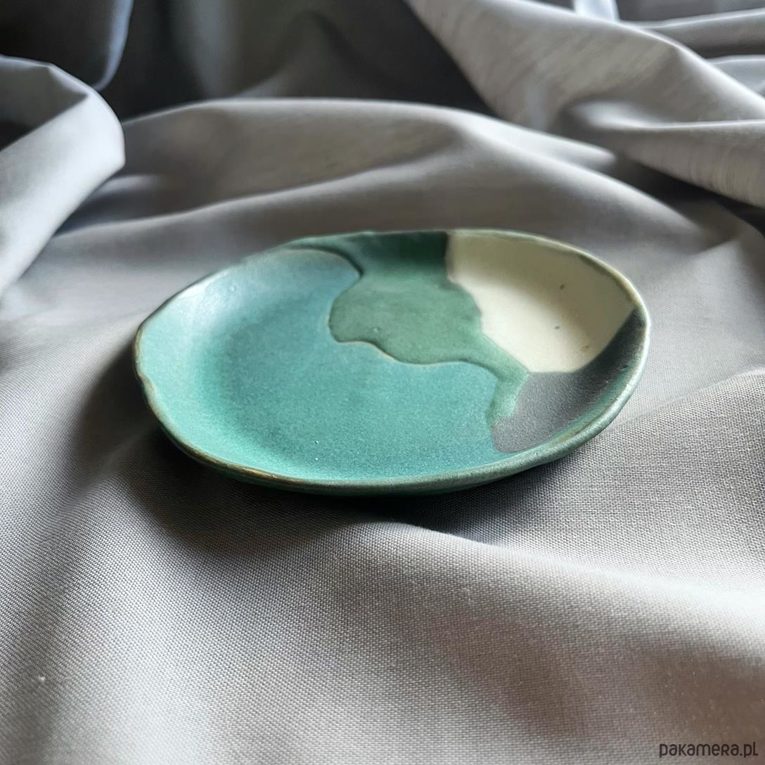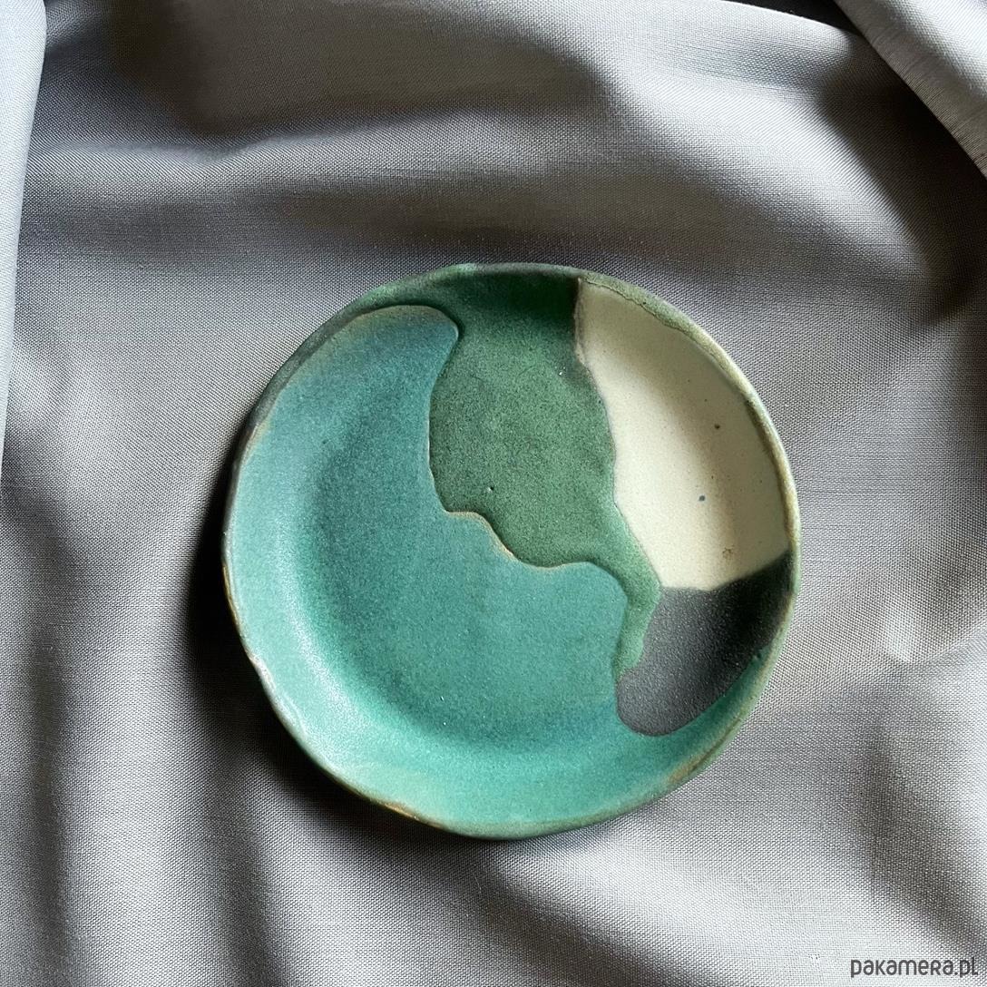 Wyjątkowy ceramiczny talerzyk dekoracyjny w łączących się odcieniach zieleni i beżu.