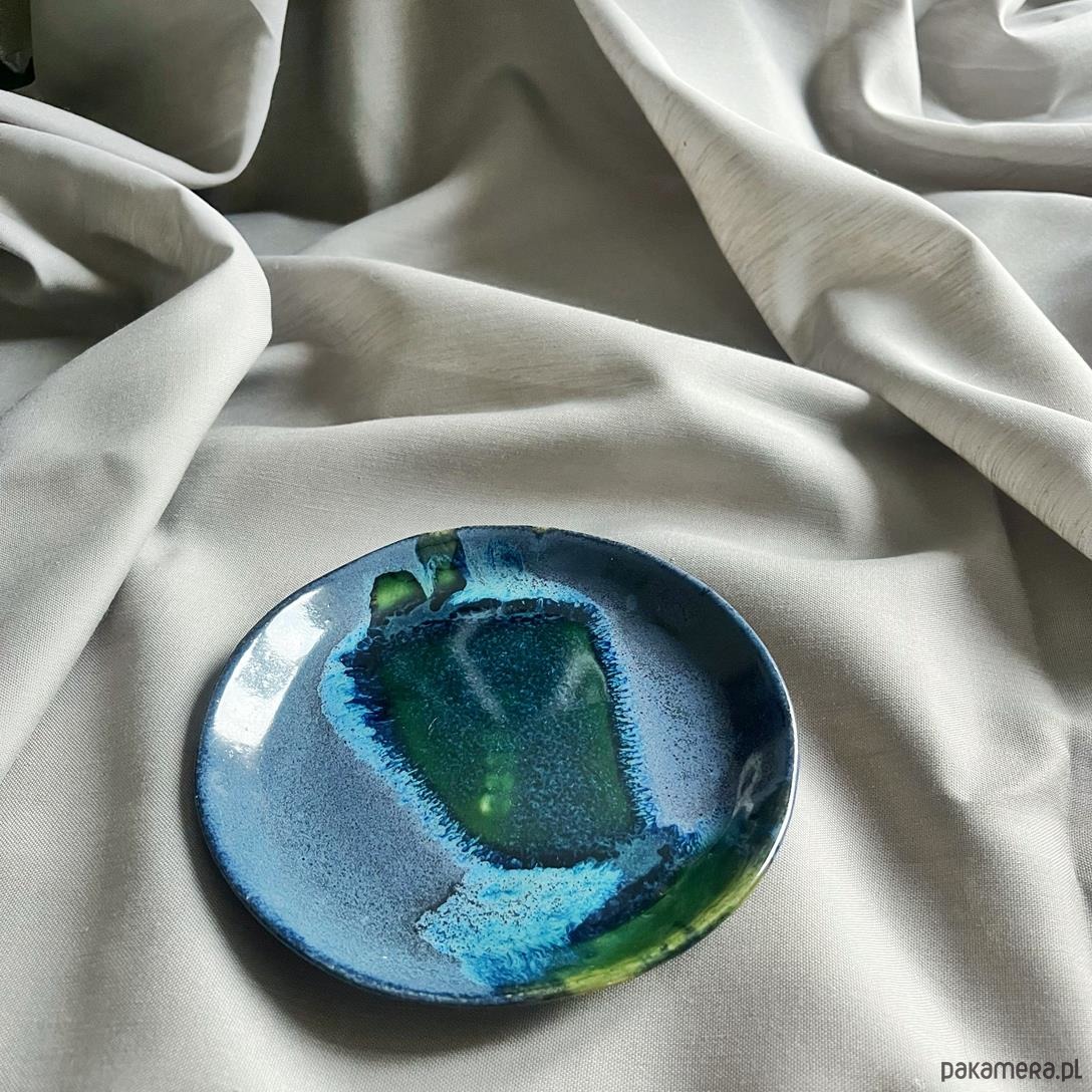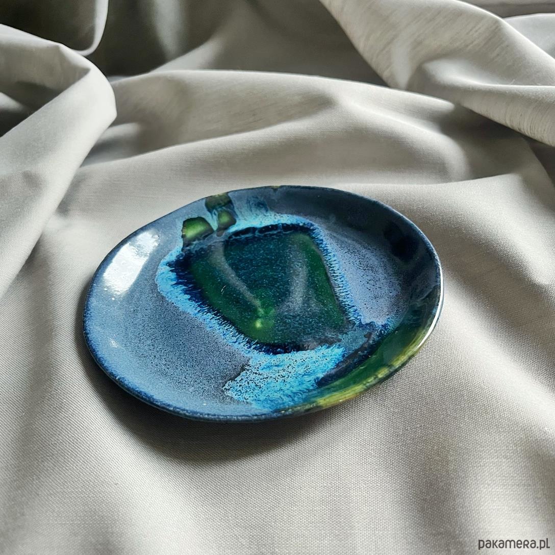 Unikatowa ceramiczna postawka / talerzyk w łączących się odcieniach zieleni i granatu, tworzących niepowtarzalne kompozycje barwne.