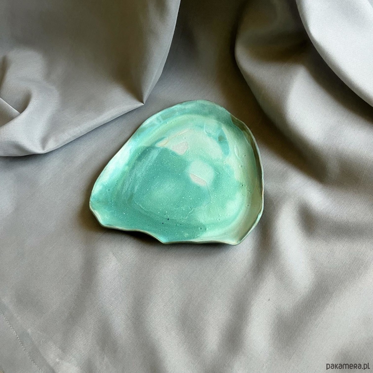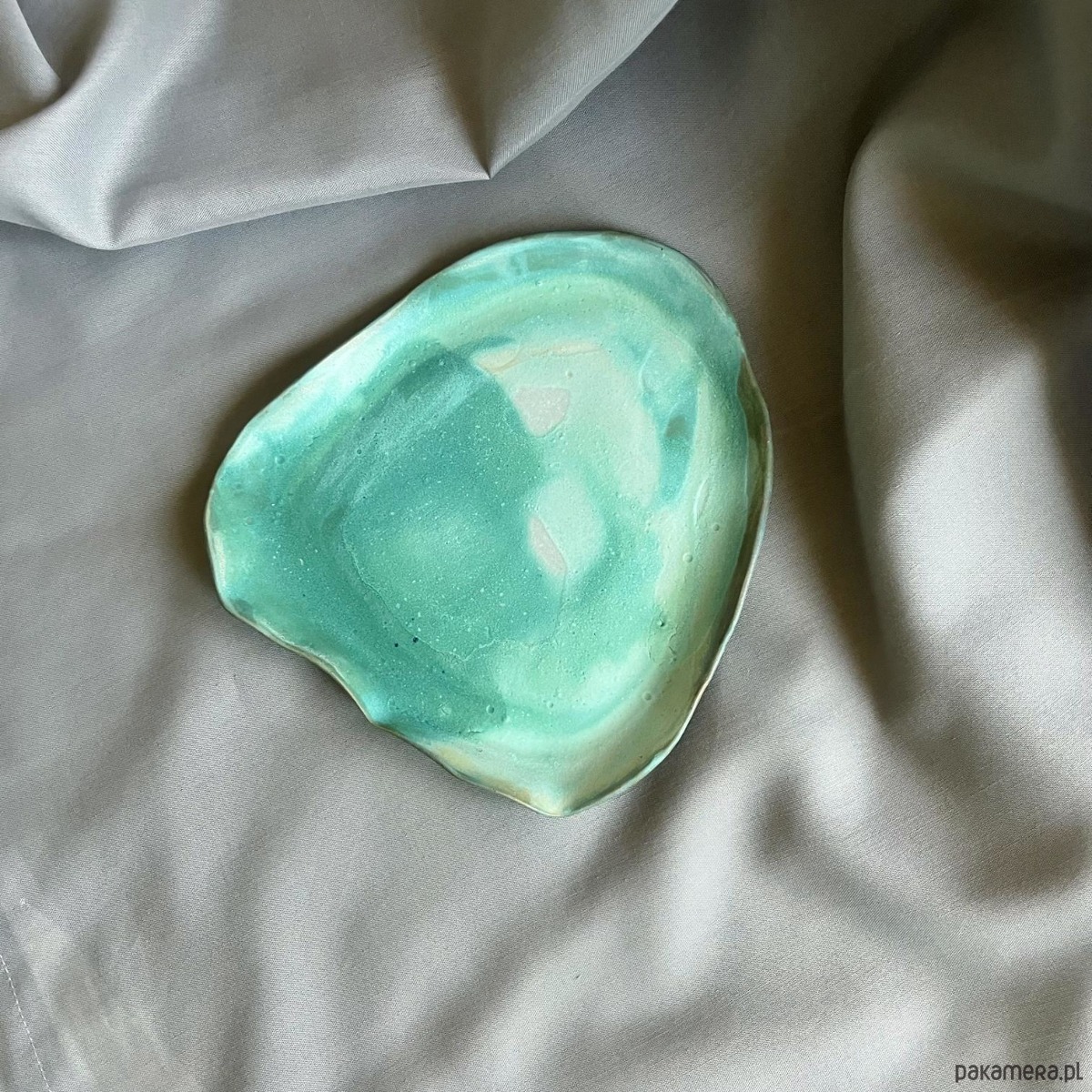 Talerzyk o nieregularnym kształcie i fantazyjnym szkliwieniu przywodzącym na myśl morską lagunę.