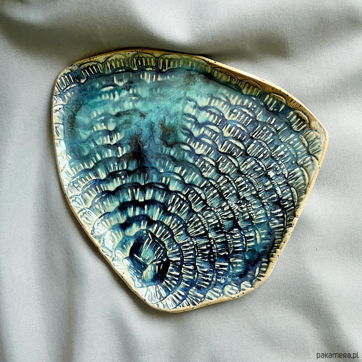 Talerzyk o nieregularnym kształcie i zdobieniu przypominającym rybią płetwę w odmętach morza.