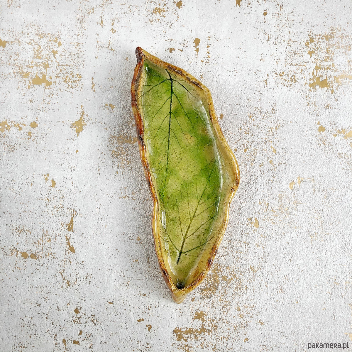 Ręcznie formowana i malowana ceramiczna miseczka dekoracyjna z odciskiem prawdziwego liścia, idealna do przechowywania biżuterii oraz innych drobiazgów. Może również posłużyć jako podstawka pod tealighty, miseczka do serwowania słodyczy lub drobnych przekąsek. Dekoracja wykonana 100% ręcznie z jasnej gliny , pokryta szkliwami w odcieniach turkusu ,zieleni i brązu, dopuszczone do kontaktu z żywnością.