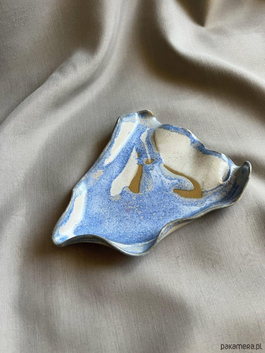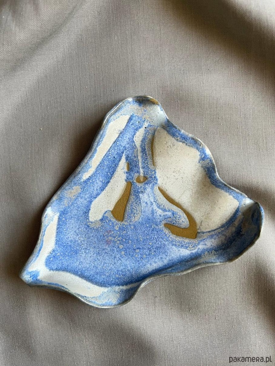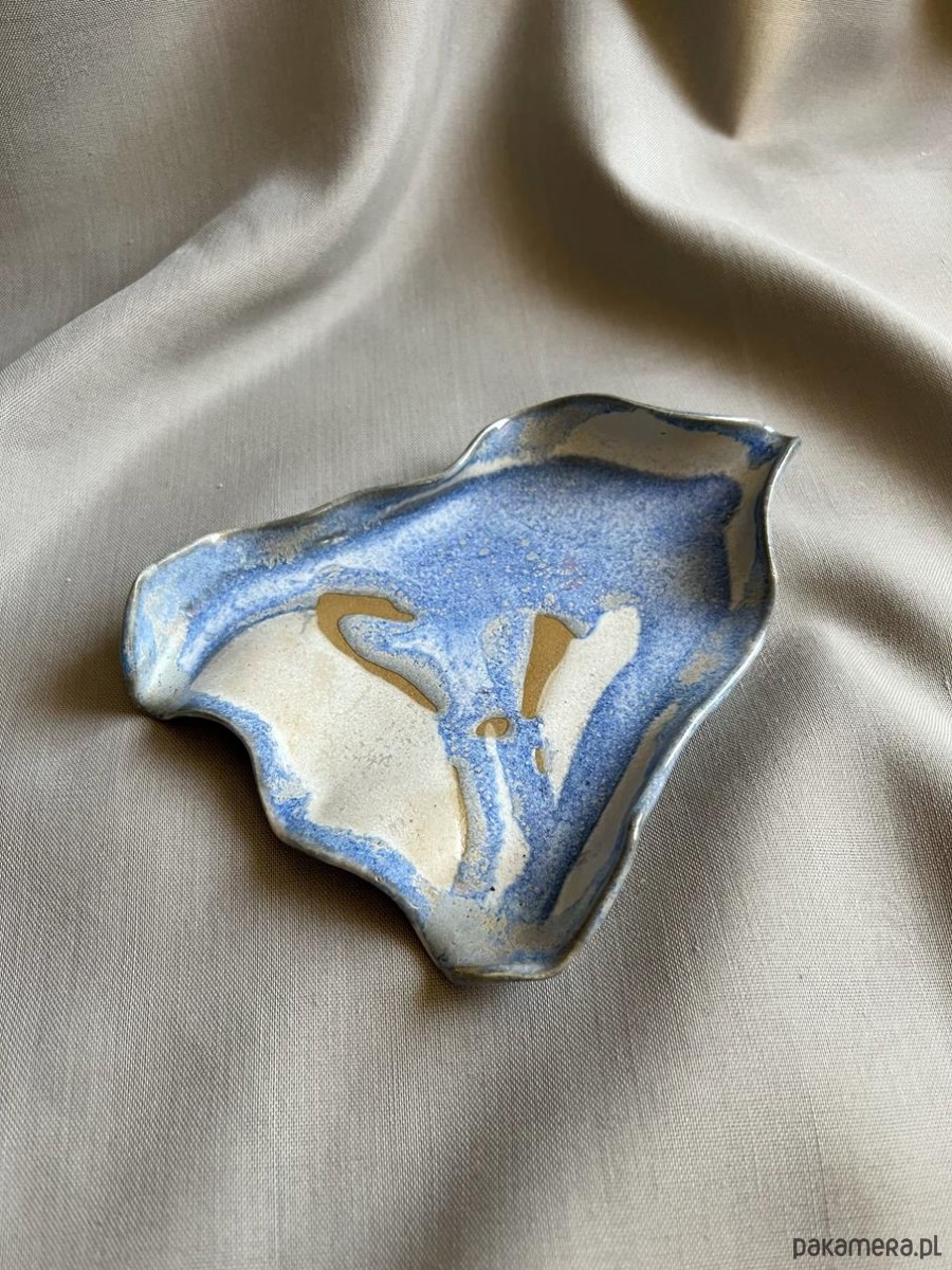 Podstawka ceramiczna wykonana 100% ręcznie z płata gliny, kształt organiczny,poszkliwiony wewnątrz pastelowymi odcieniami bieli, beżu i niebieskiego.tworzących urocze ciapki.