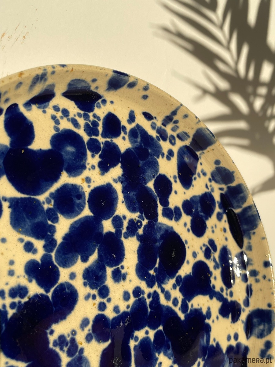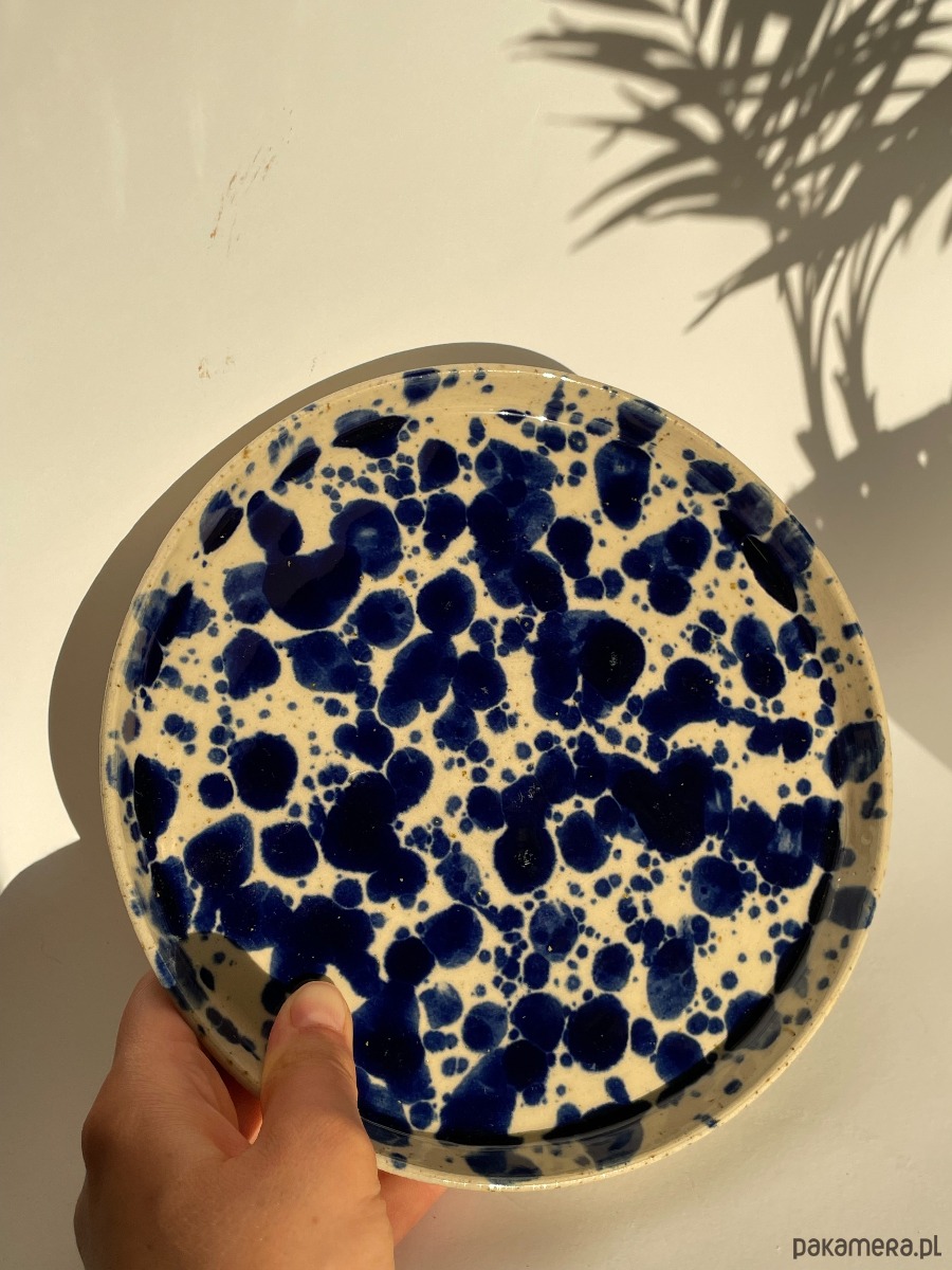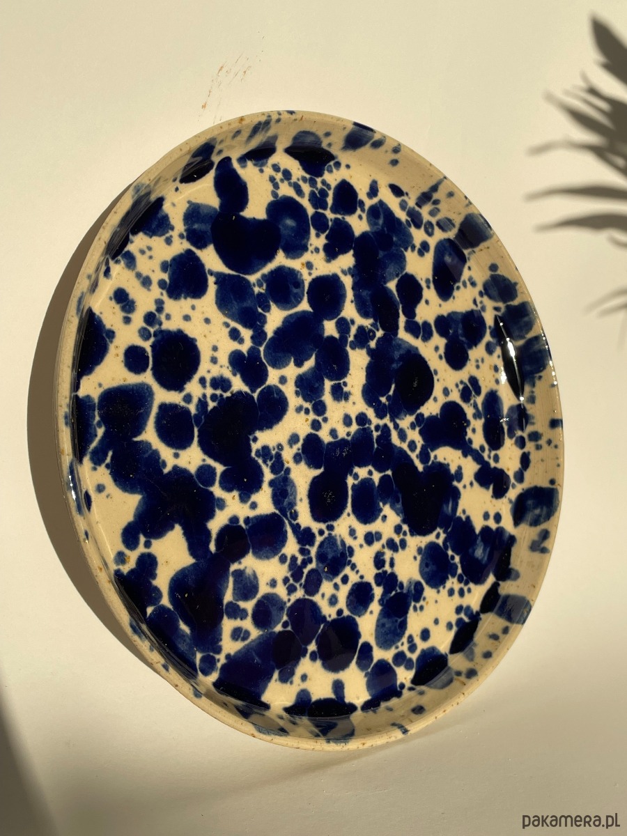 Talerz z nakrapianym kobaltowym szkliwem wykonany na kole garncarskim.