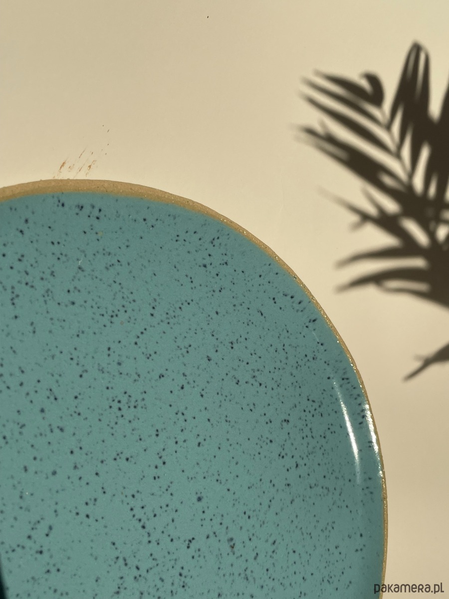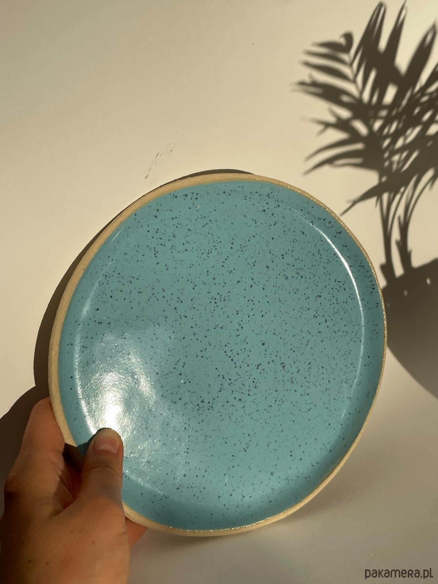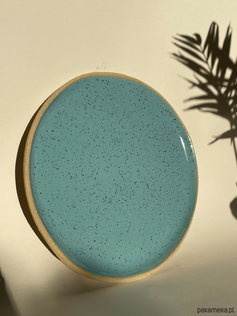 Talerz o nieidealnym okręgu w błękitnym kolorze.