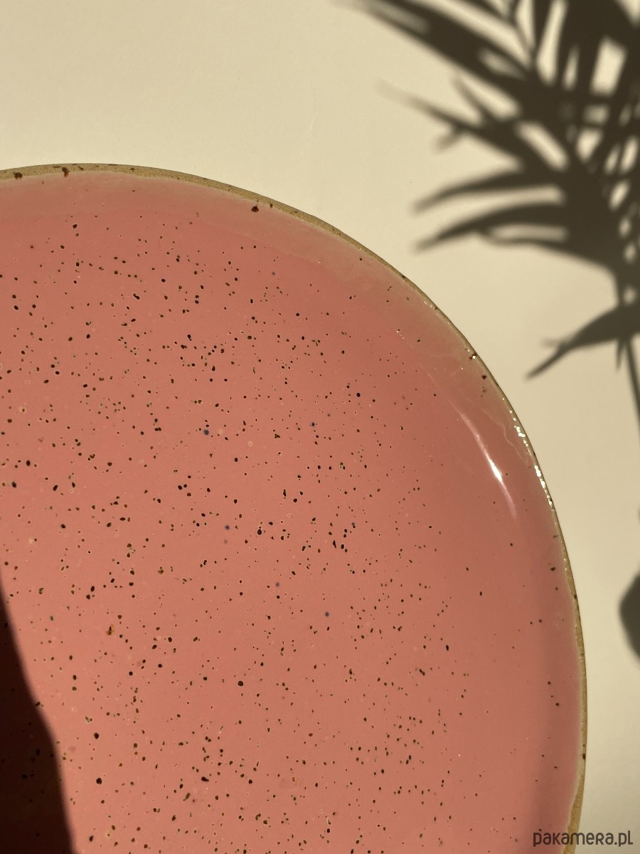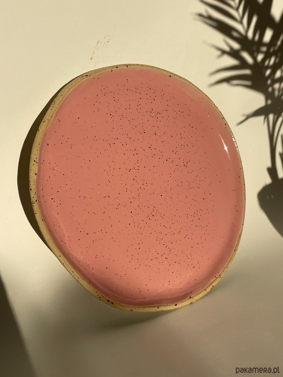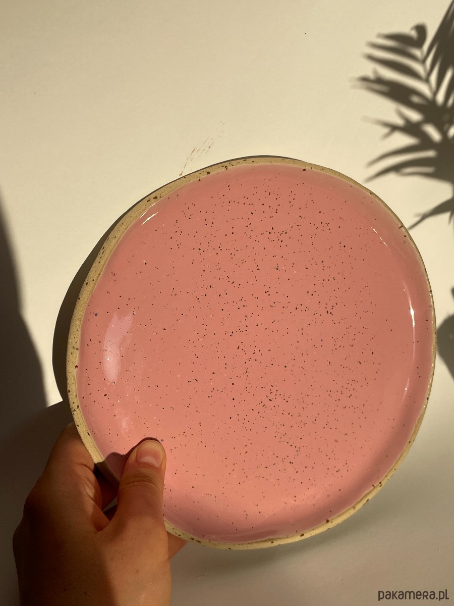 Talerz o nieidealnym okręgu w kolorze różowym.