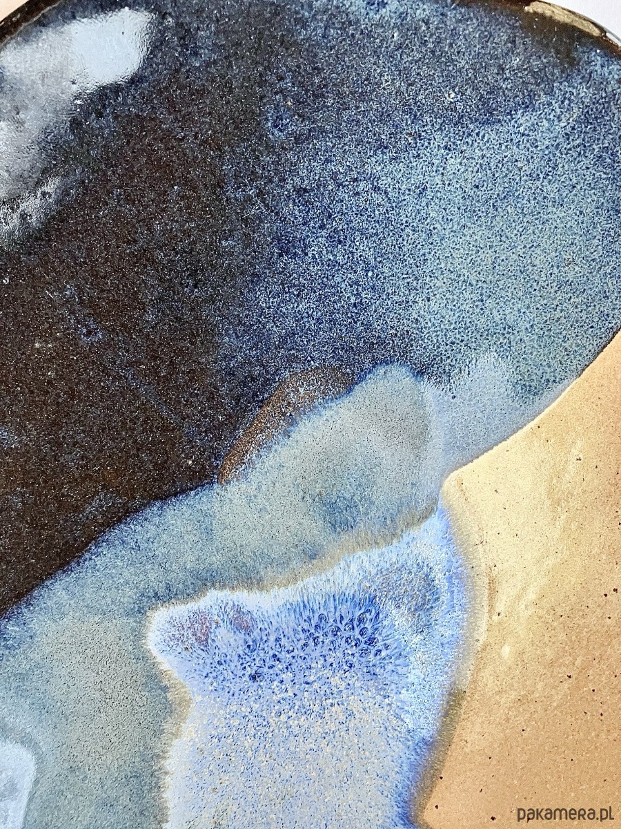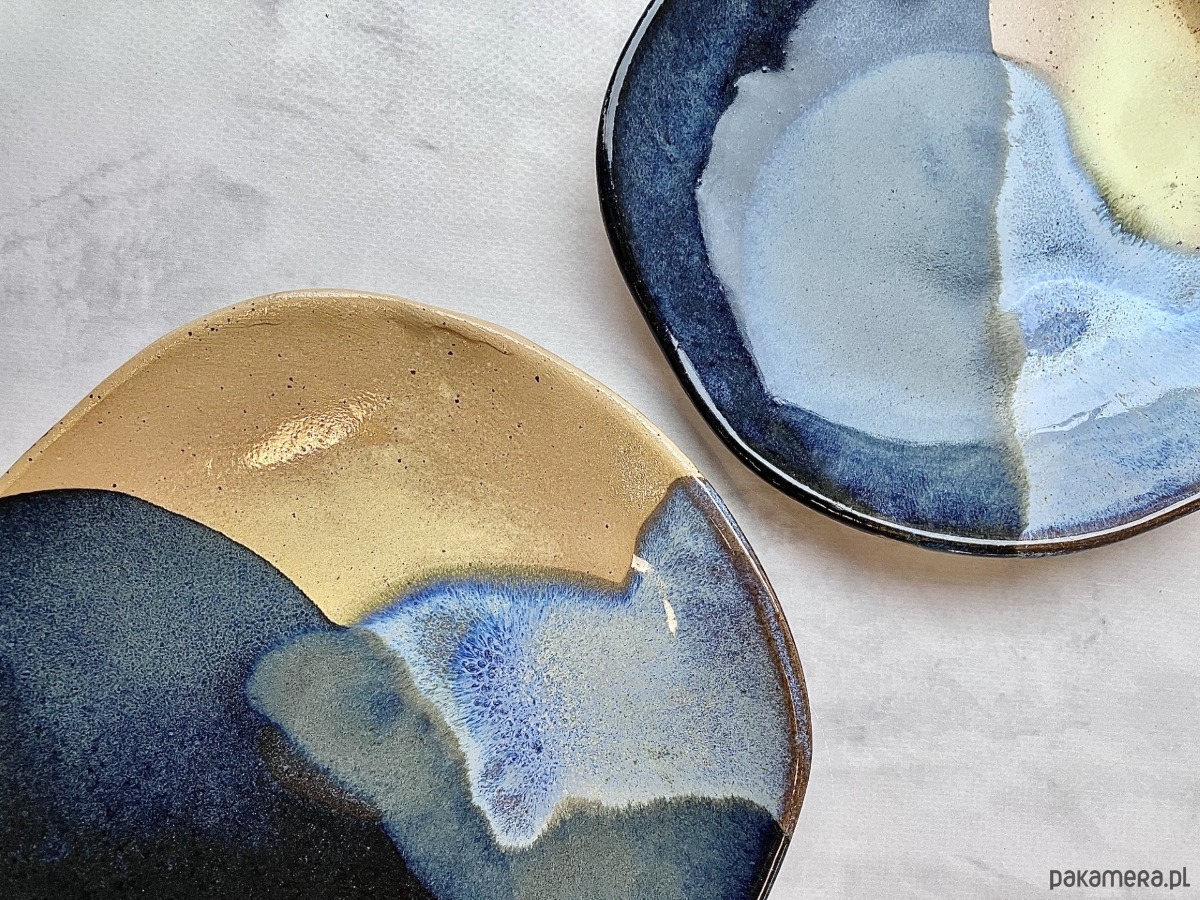 Głębokie granaty i błękity przeplatają się z ciepłymi odcieniami piasku, tworząc harmonijny kontrast światła i cienia. To talerze, które nie tylko podkreślają charakter stołu, ale także wniosą do wnętrza odrobinę spokoju i naturalnej elegancji. Idealne do podawania deserów i przekąsek.