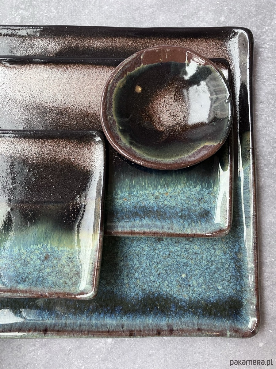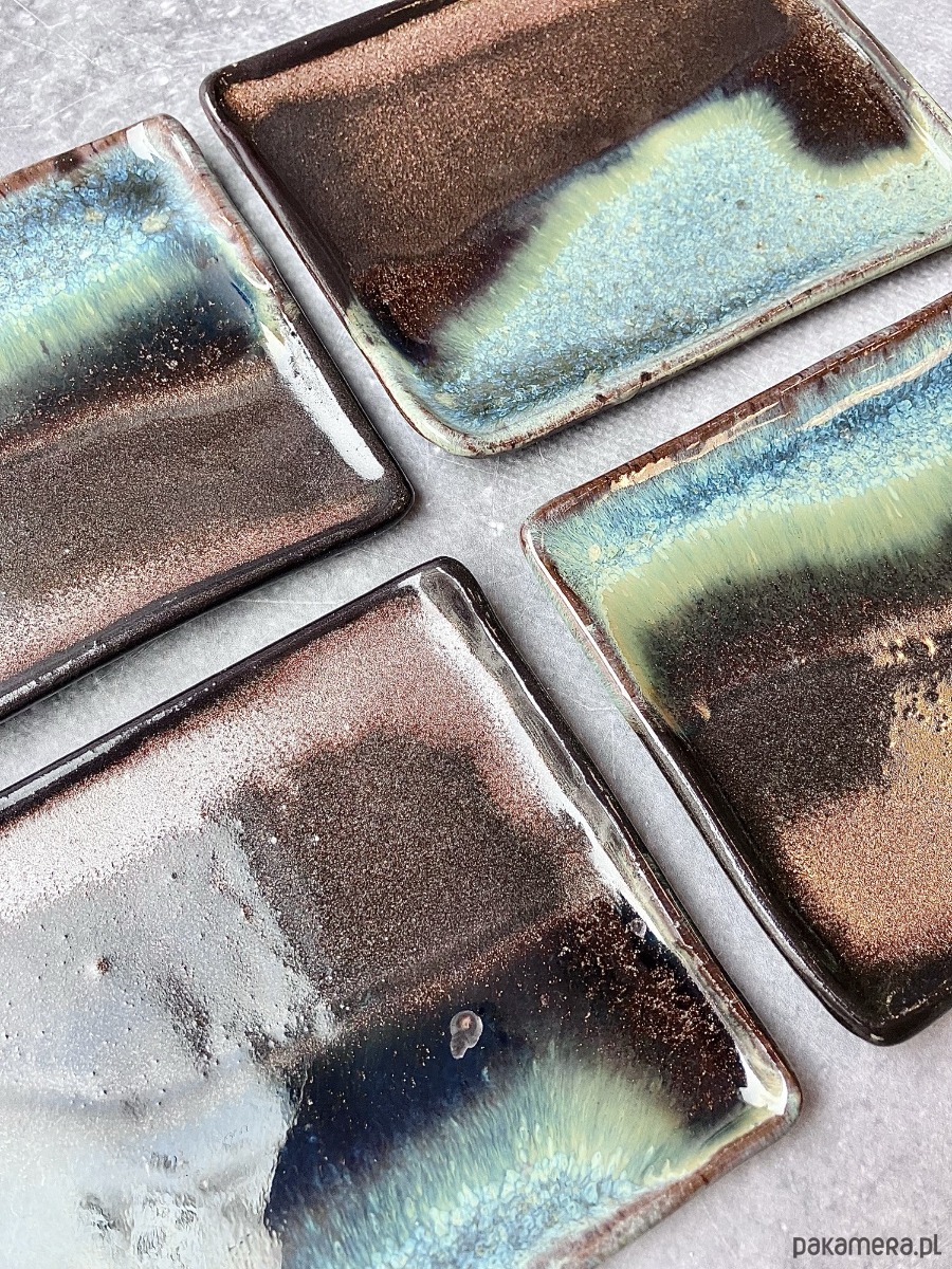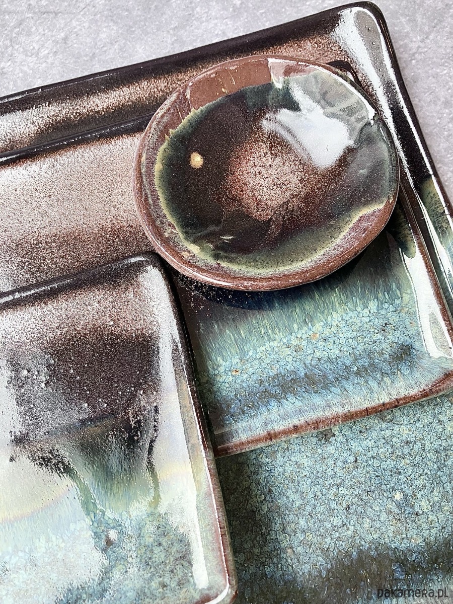 Talerzyki do sushi GLOW to wyjątkowe, ręcznie wykonane naczynia stworzone z myślą o eleganckim podawaniu sushi, przystawek oraz drobnych dań. Ich powierzchnię zdobi efektowne, wielowarstwowe szkliwo w odcieniach głębokiego brązu, turkusu, zieleni i granatu, które przenikają się niczym świetliste refleksy na wodzie. Każdy talerzyk jest niepowtarzalny- układ kolorów i efekty krystalizacji szkliwa za każdym razem tworzą unikatowy obraz.