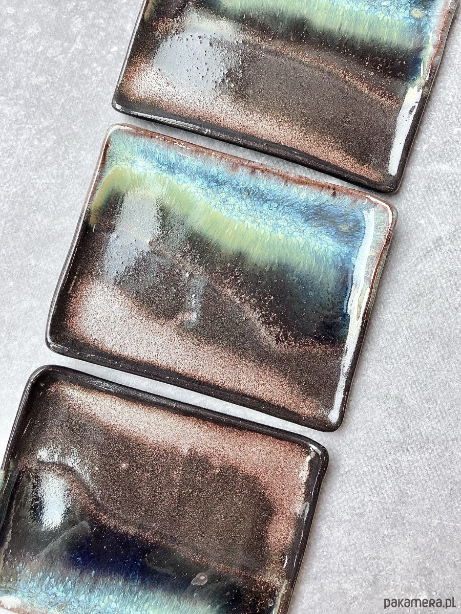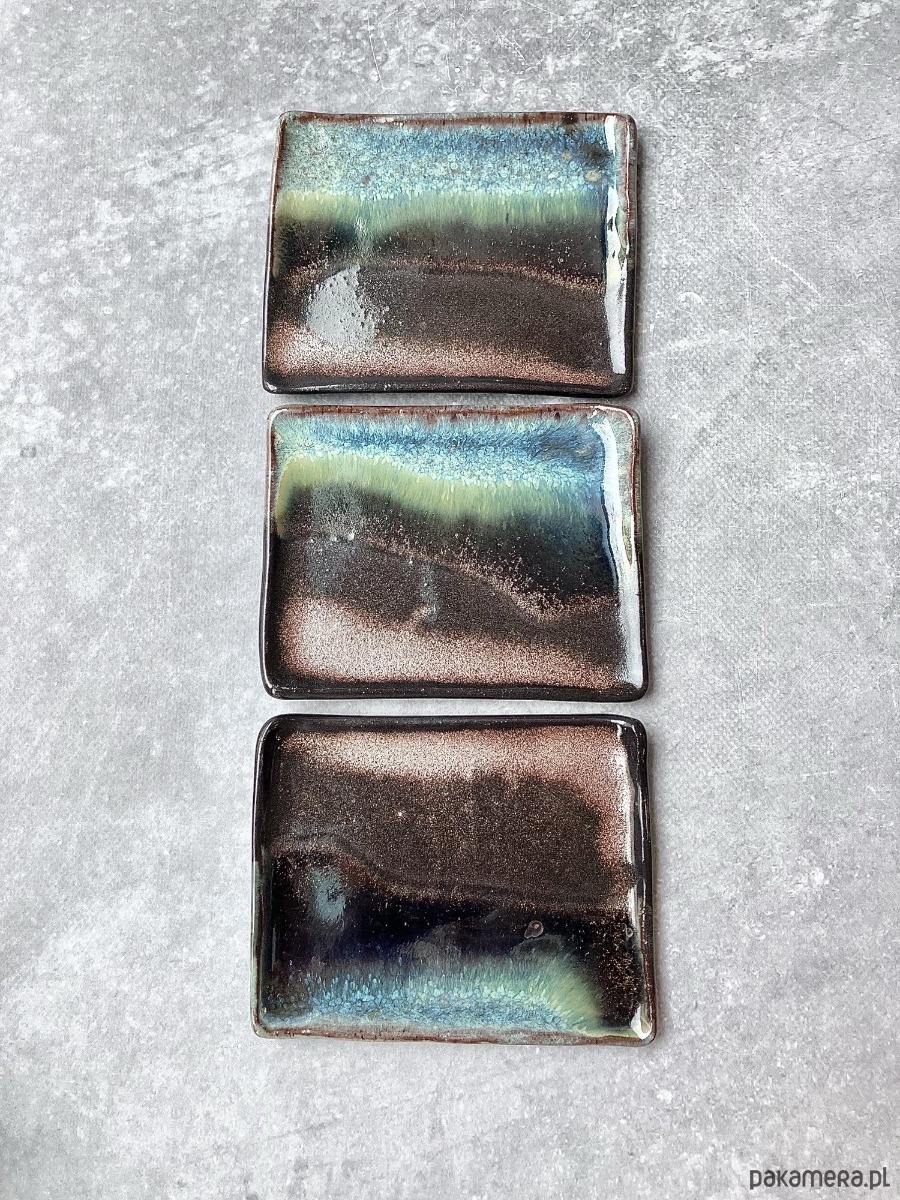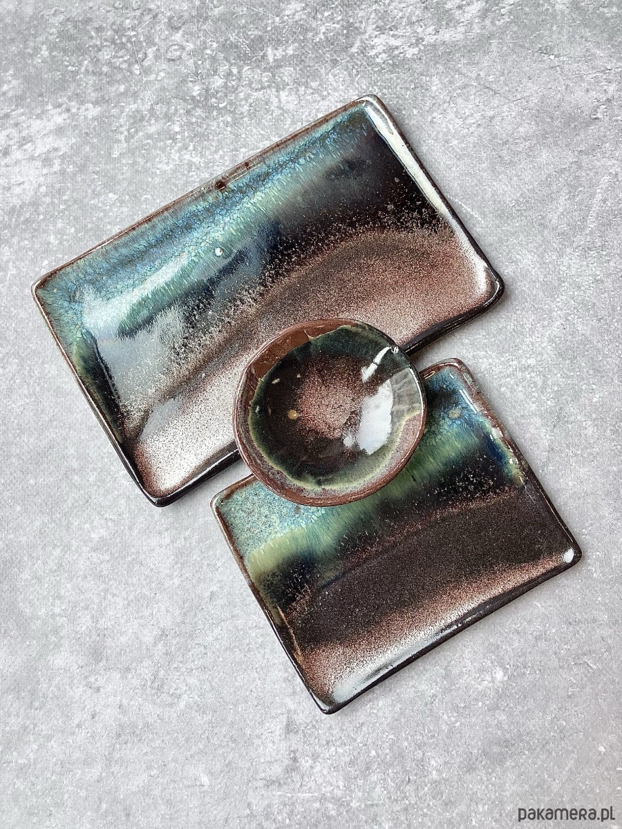 Talerzyki do sushi GLOW to wyjątkowe, ręcznie wykonane naczynia stworzone z myślą o eleganckim podawaniu sushi, przystawek oraz drobnych dań. Ich powierzchnię zdobi efektowne, wielowarstwowe szkliwo w odcieniach głębokiego brązu, turkusu, zieleni i granatu, które przenikają się niczym świetliste refleksy na wodzie. Każdy talerzyk jest niepowtarzalny- układ kolorów i efekty krystalizacji szkliwa za każdym razem tworzą unikatowy obraz.