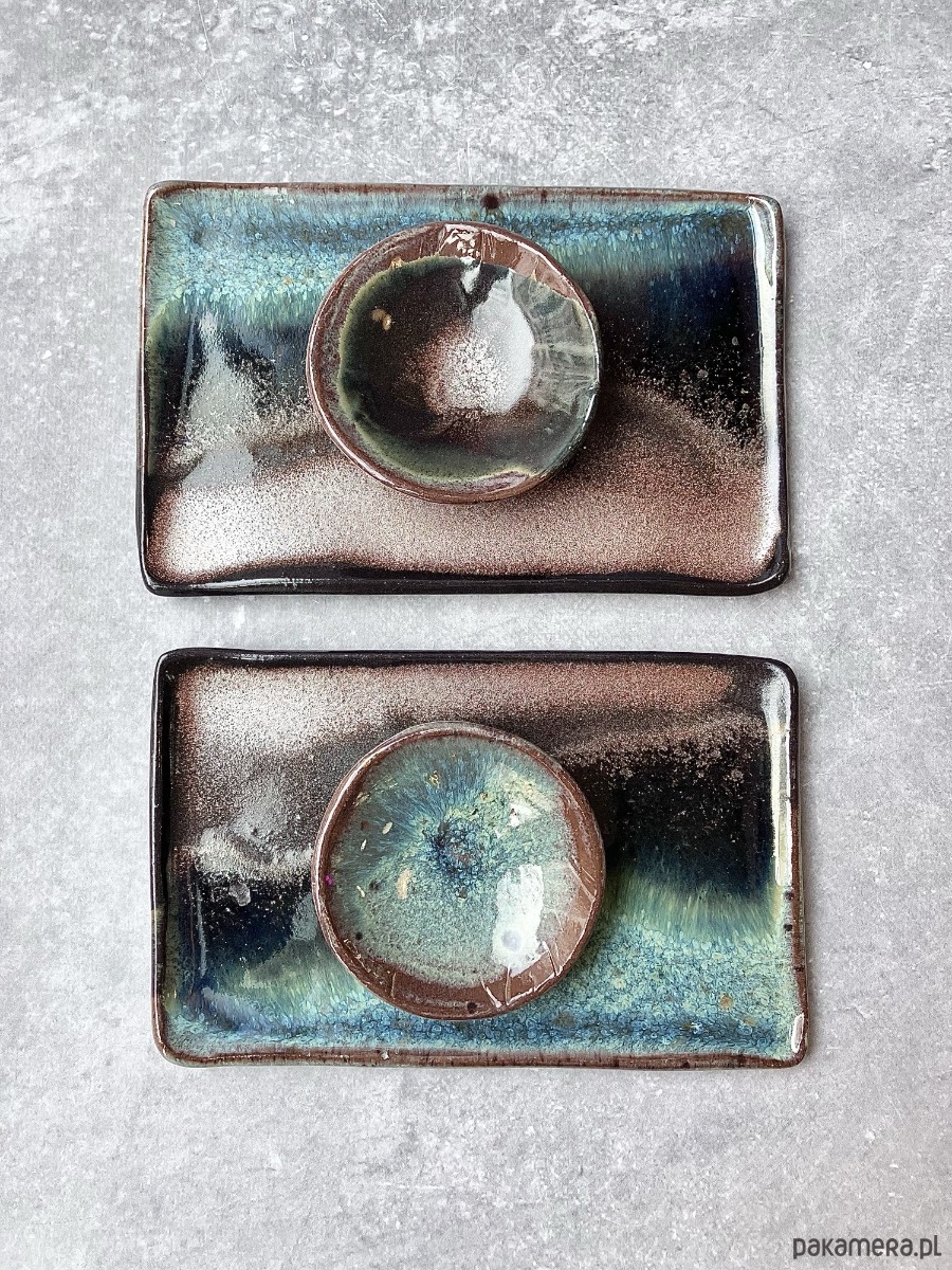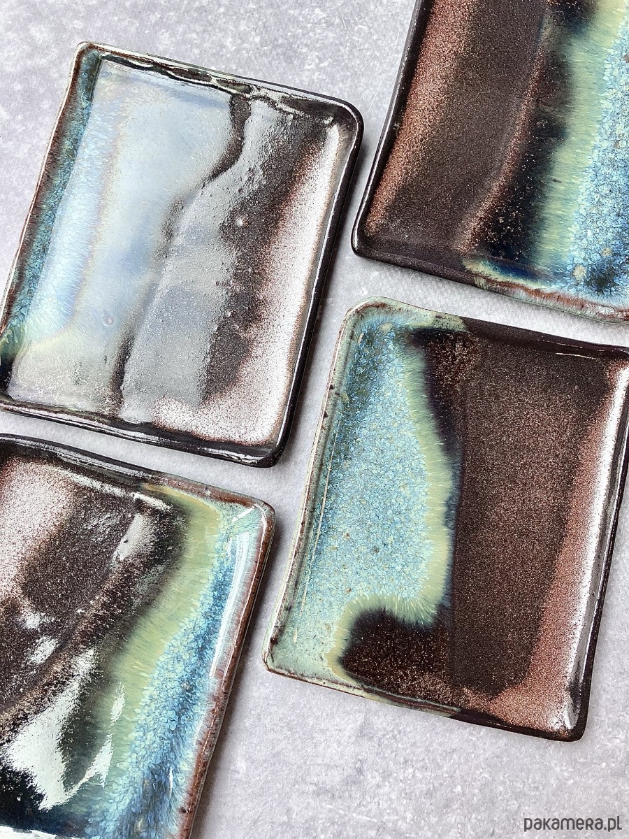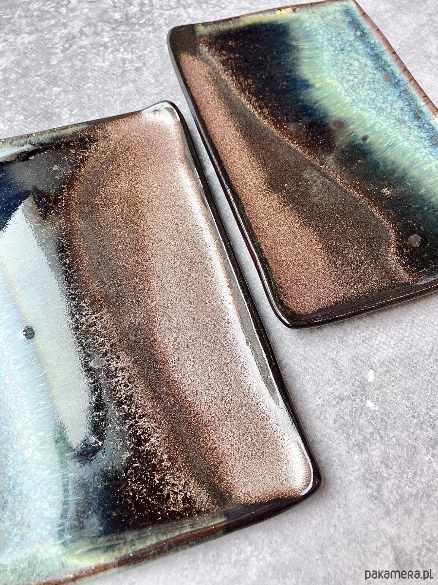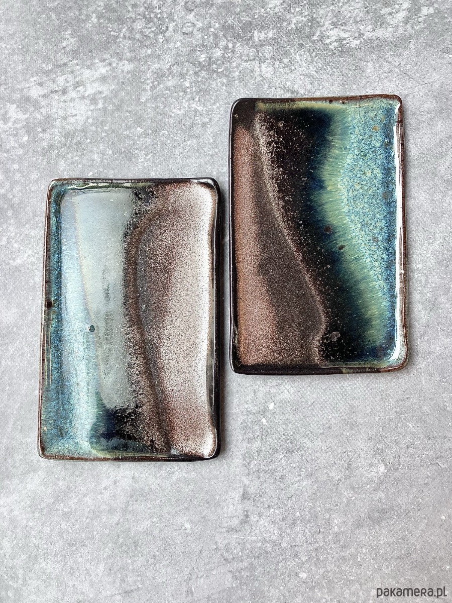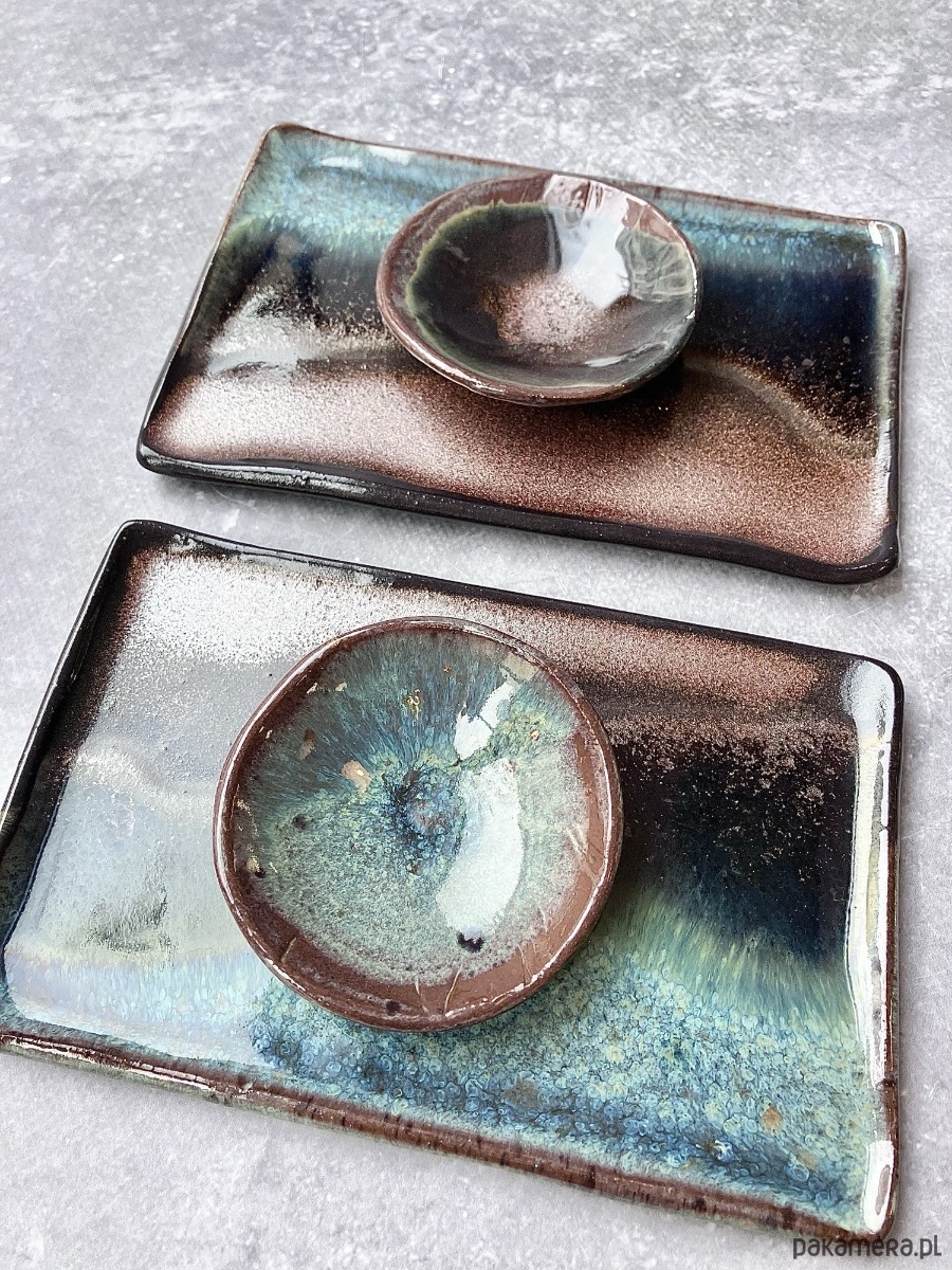Talerzyki do sushi GLOW to wyjątkowe, ręcznie wykonane naczynia stworzone z myślą o eleganckim podawaniu sushi, przystawek oraz drobnych dań. Ich powierzchnię zdobi efektowne, wielowarstwowe szkliwo w odcieniach głębokiego brązu, turkusu, zieleni i granatu, które przenikają się niczym świetliste refleksy na wodzie. Każdy talerzyk jest niepowtarzalny- układ kolorów i efekty krystalizacji szkliwa za każdym razem tworzą unikatowy obraz.