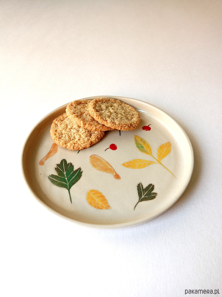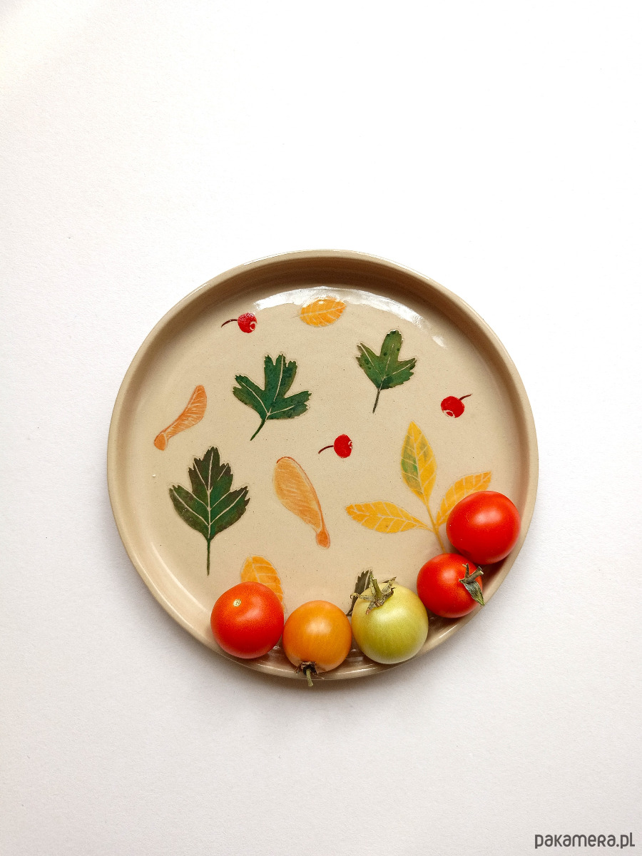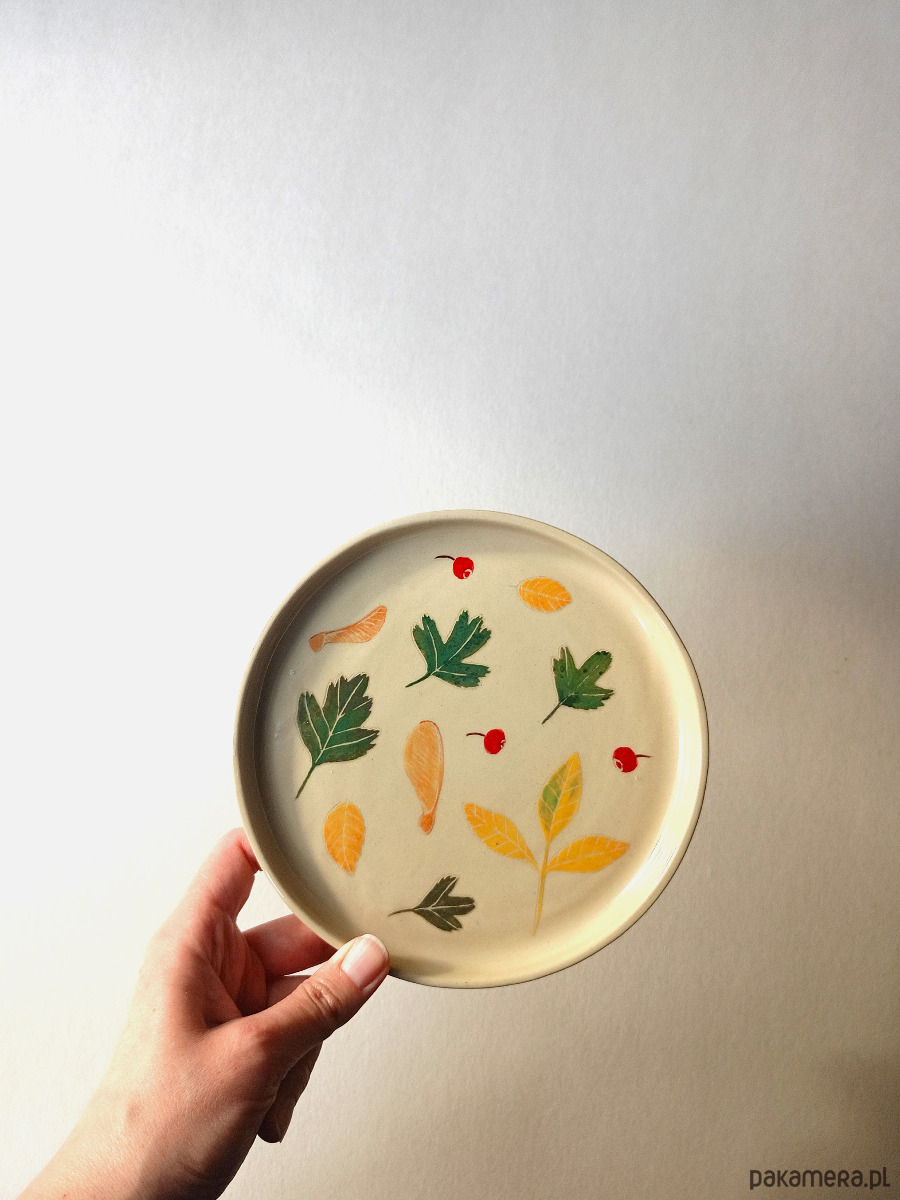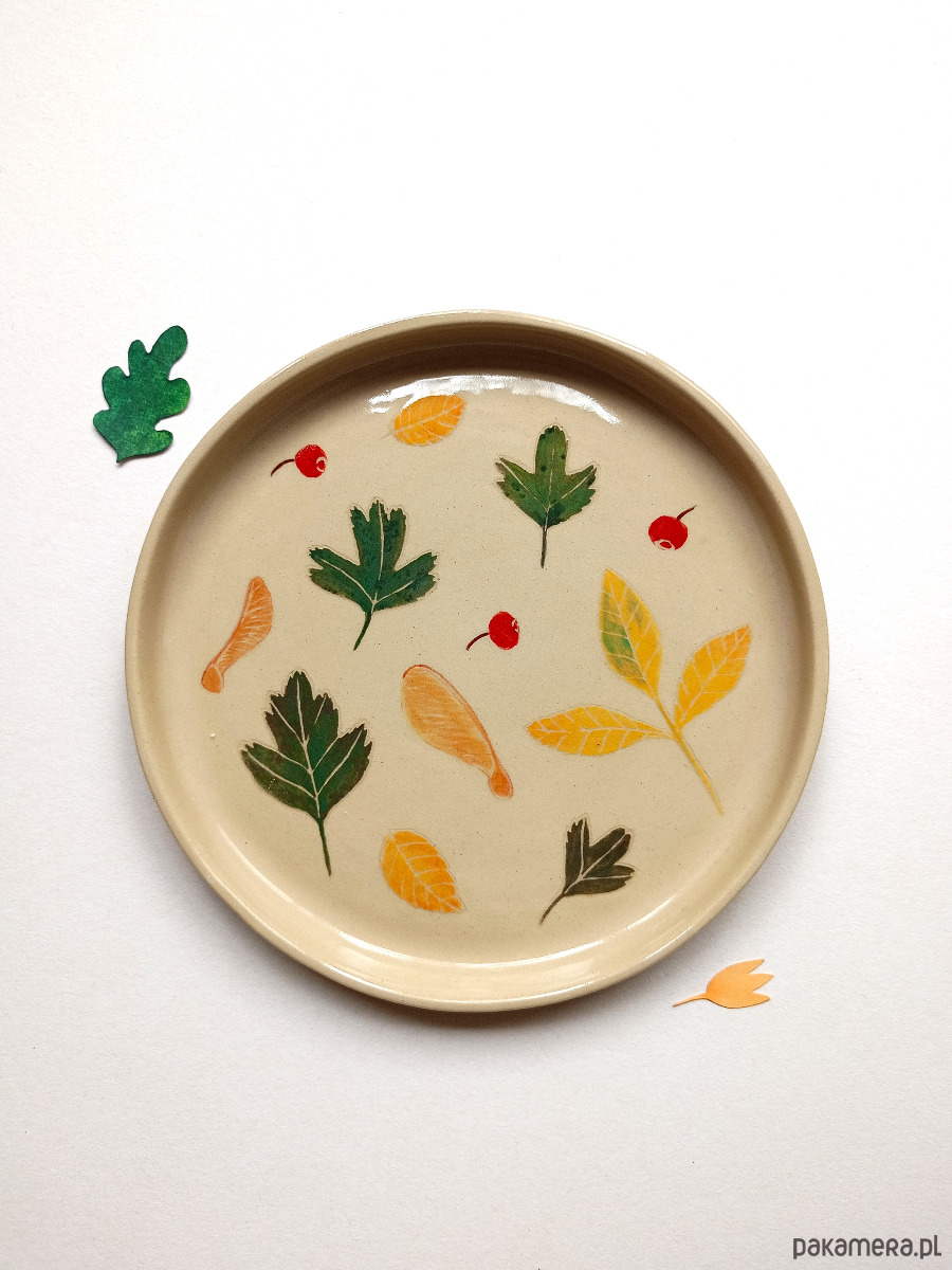 Płaski talerzyk z jesiennym motywem. Na talerzyku liście i owocu głogu, klonowe noski i kilka innych listków. Wszystko zebrane na podwórku i uwiecznione na talerzyku ku chwale złotej polskiej jesieni.