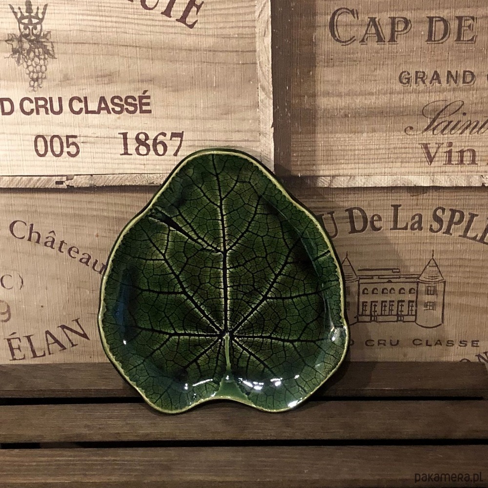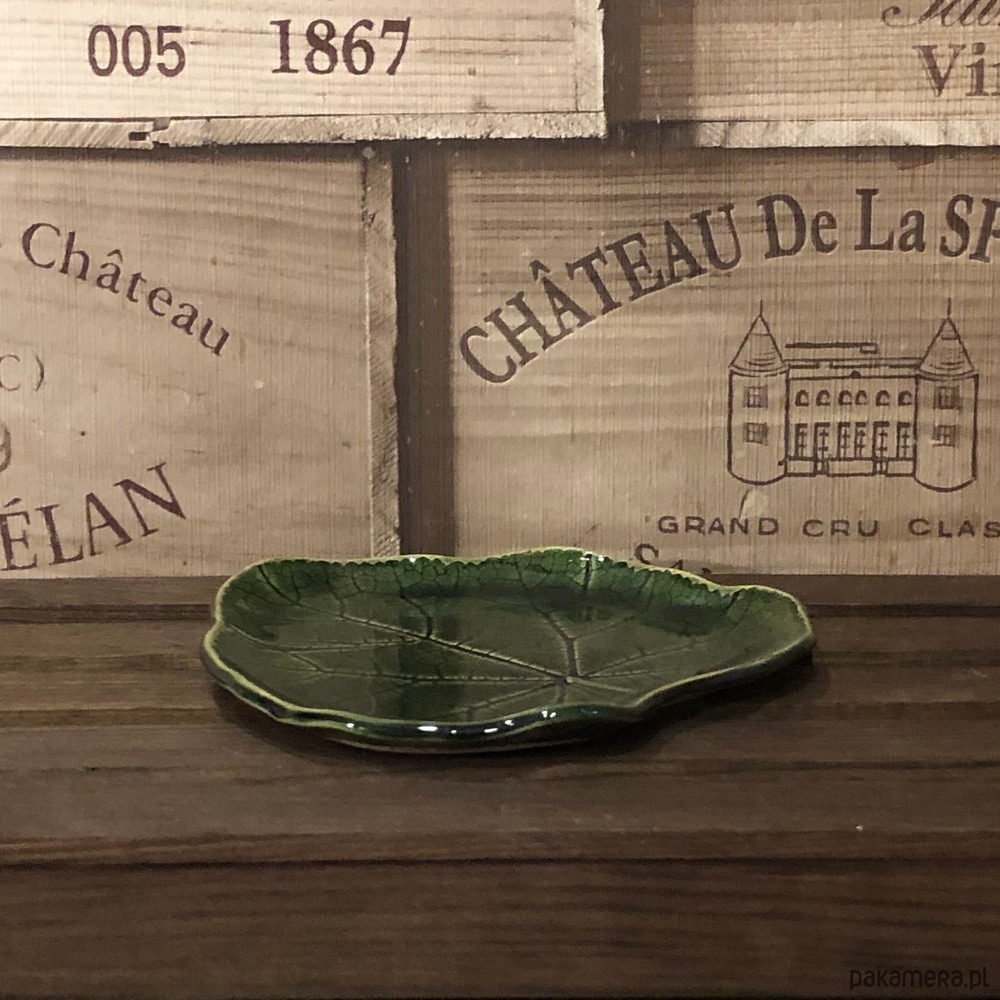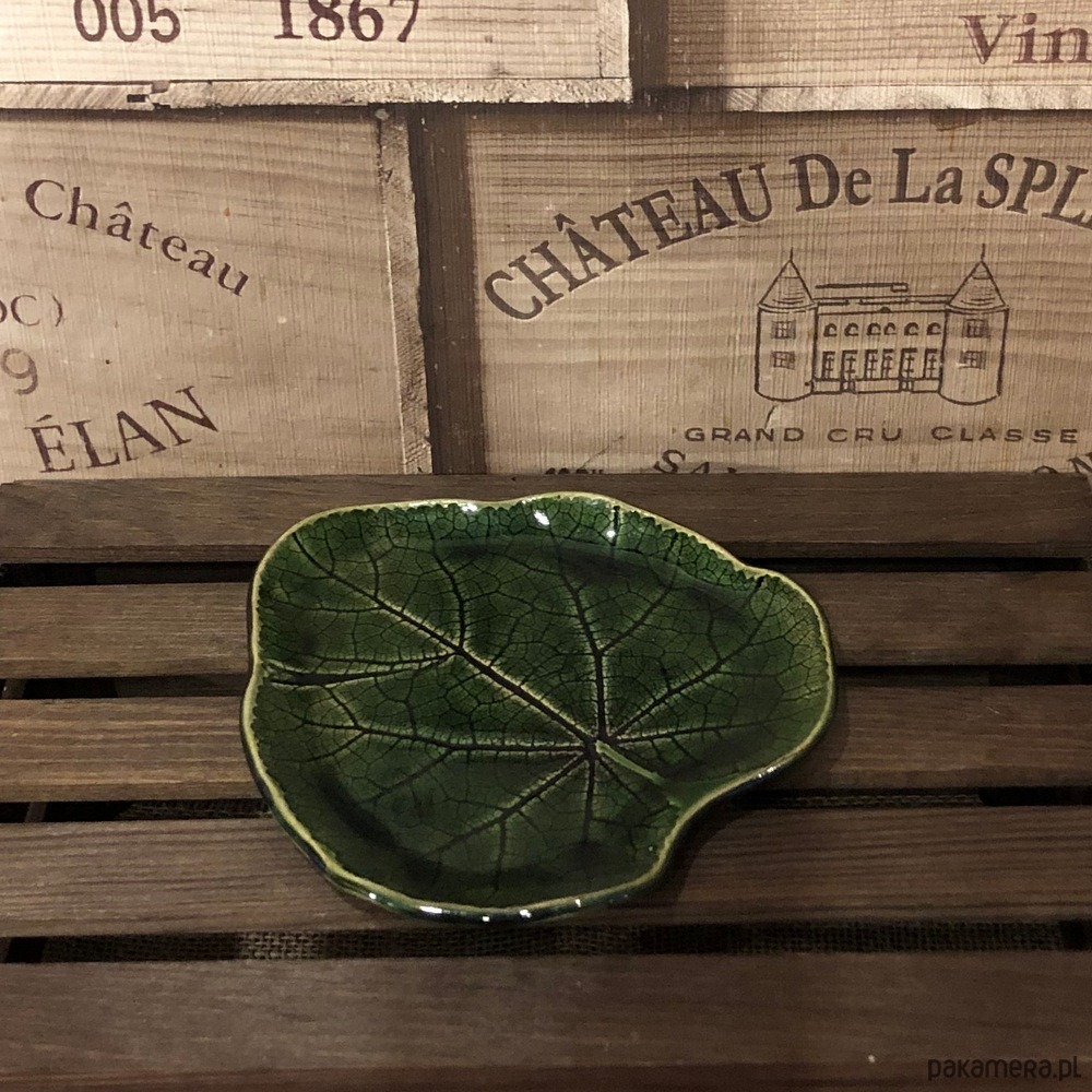 Talerzyk ceramiczny w kolorze butelkowej zieleni z odbitym naturalnym listkiem malwy.