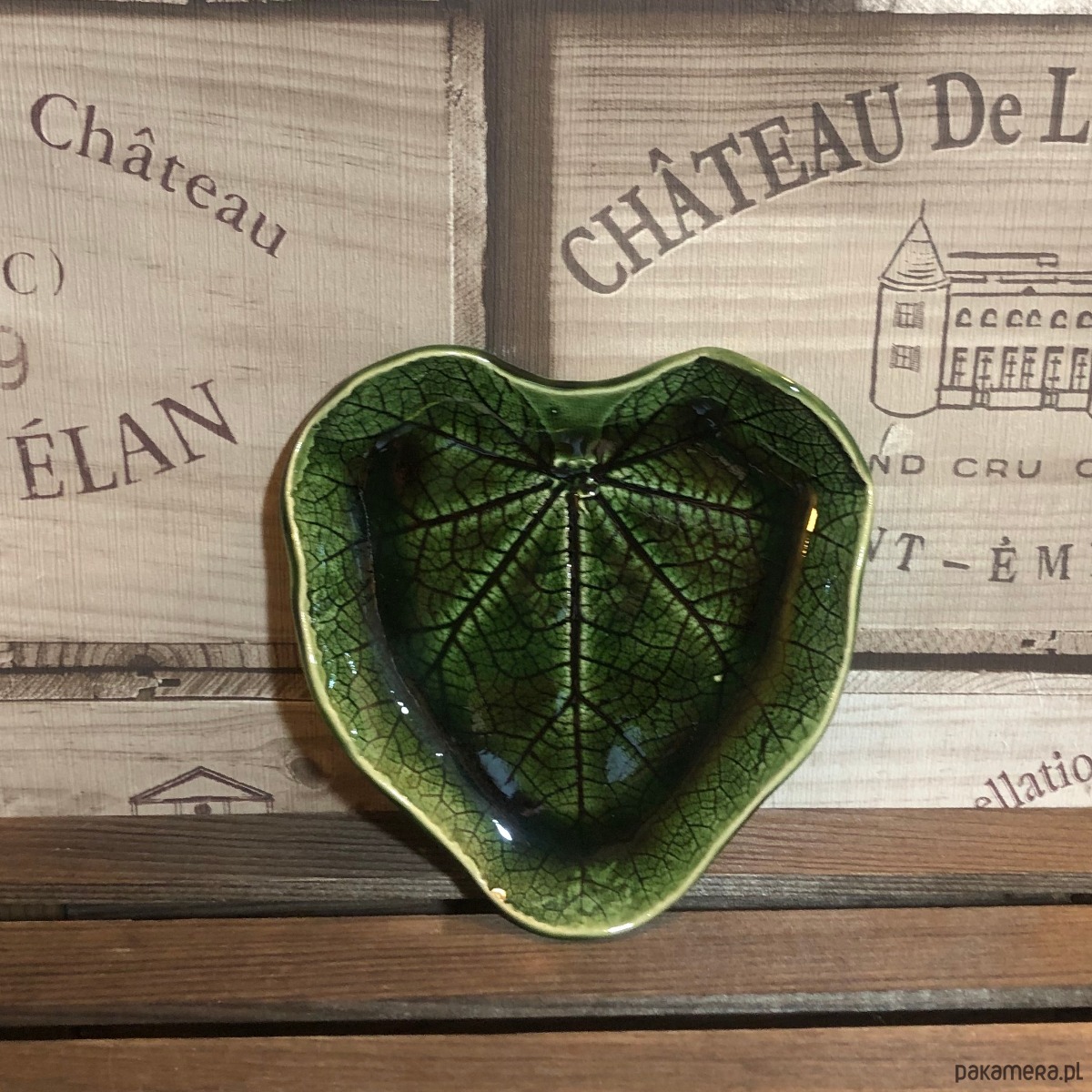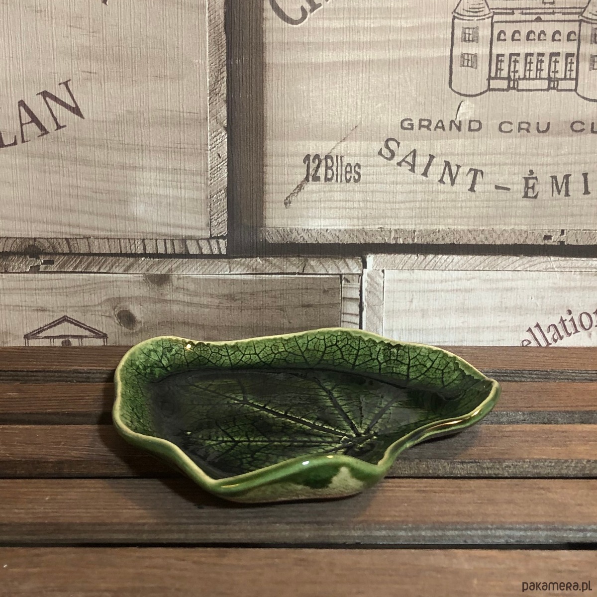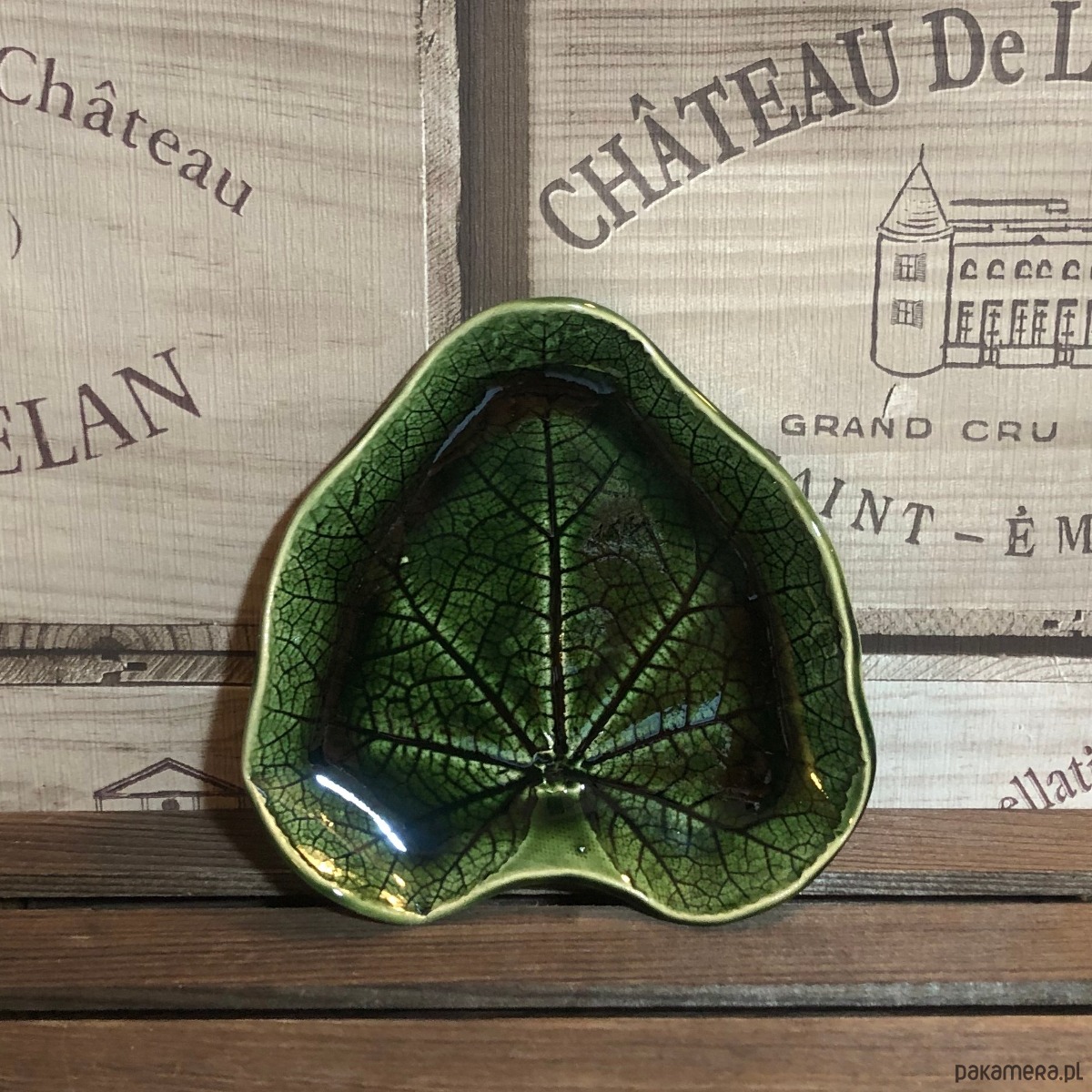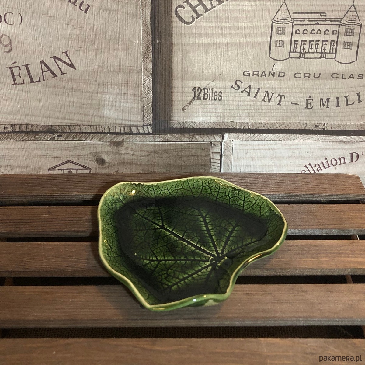 Talerz ceramiczny w kolorze butelkowej zieleni z odbitym naturalnym listkiem malwy.
