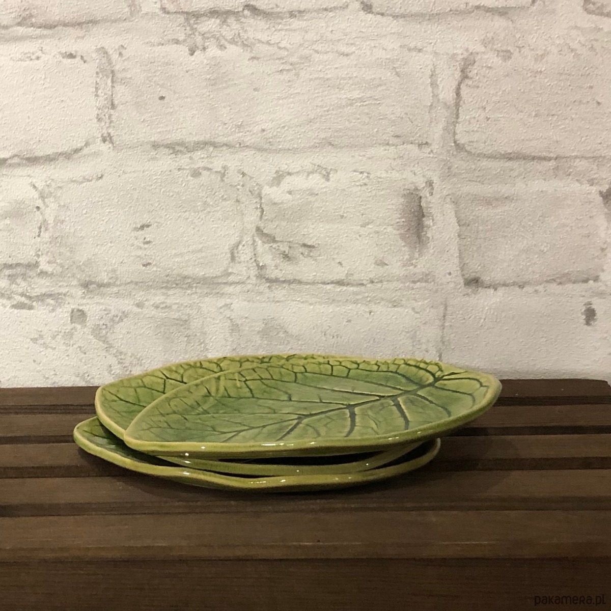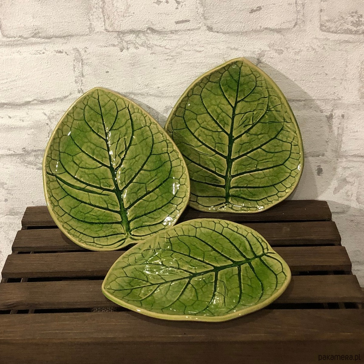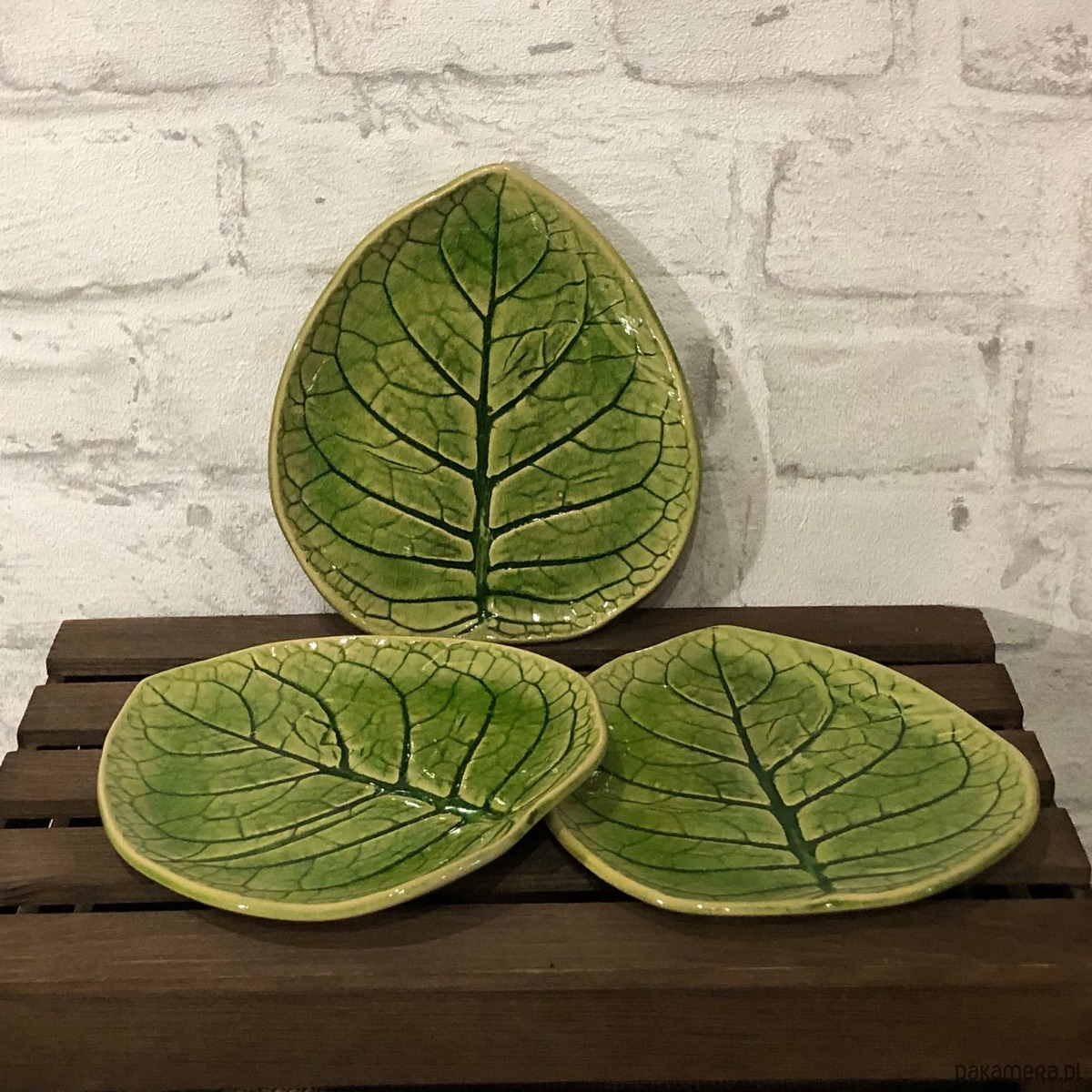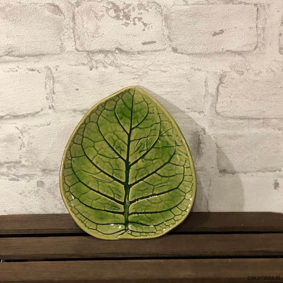 Talerzyk ceramiczny w kolorze soczystej zieleni z odciśniętym wzorem naturalnego liścia .