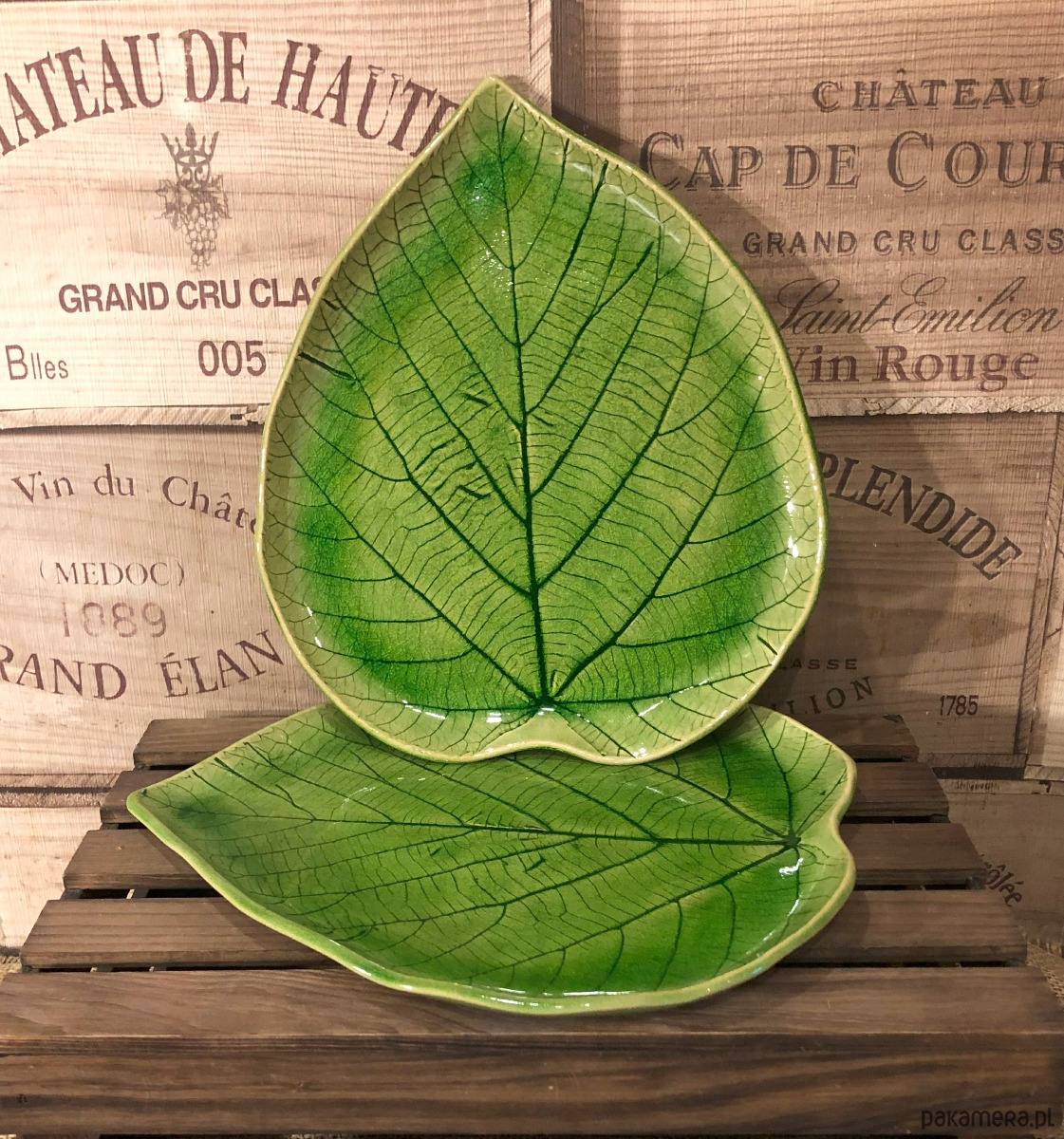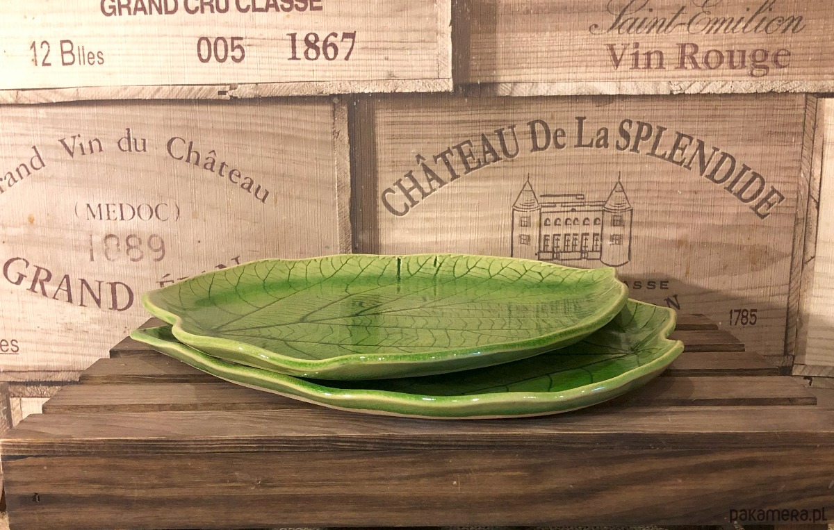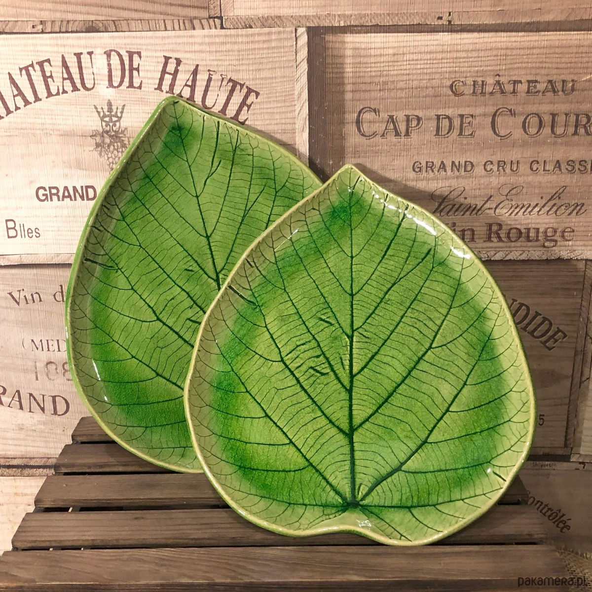 Talerzyk ceramiczny w kolorze jasnej soczystej zieleni z odbitym naturalnym listkiem.