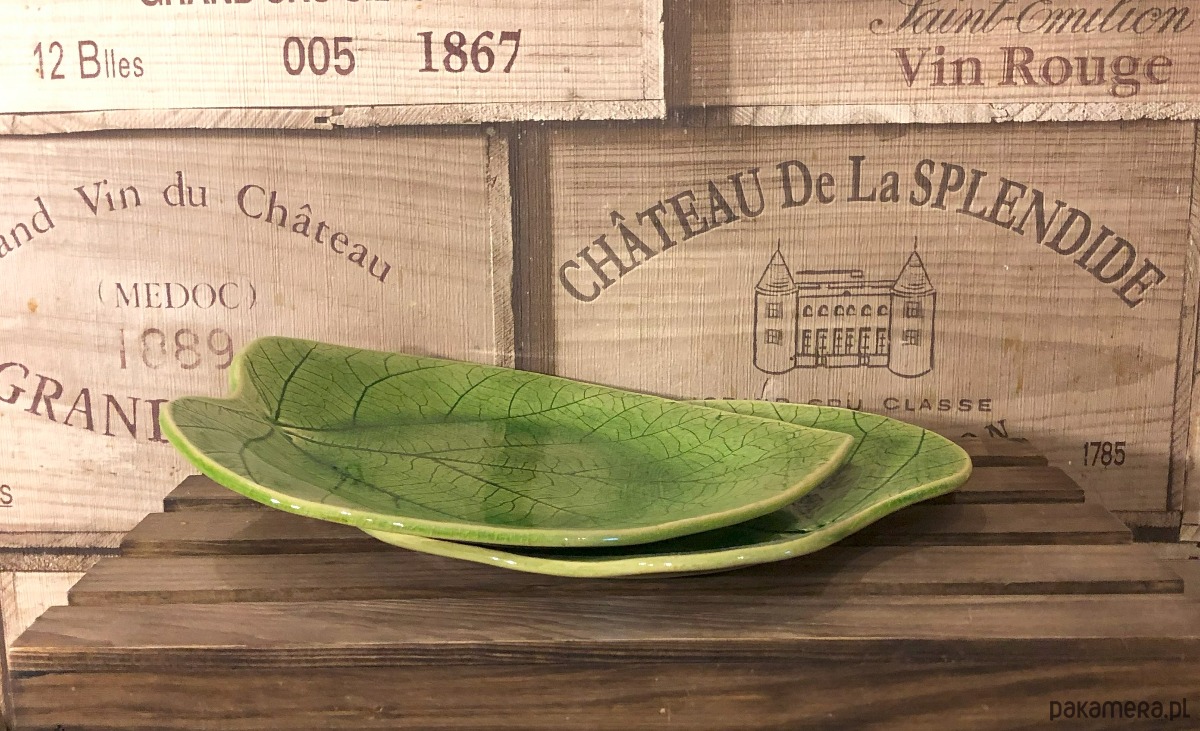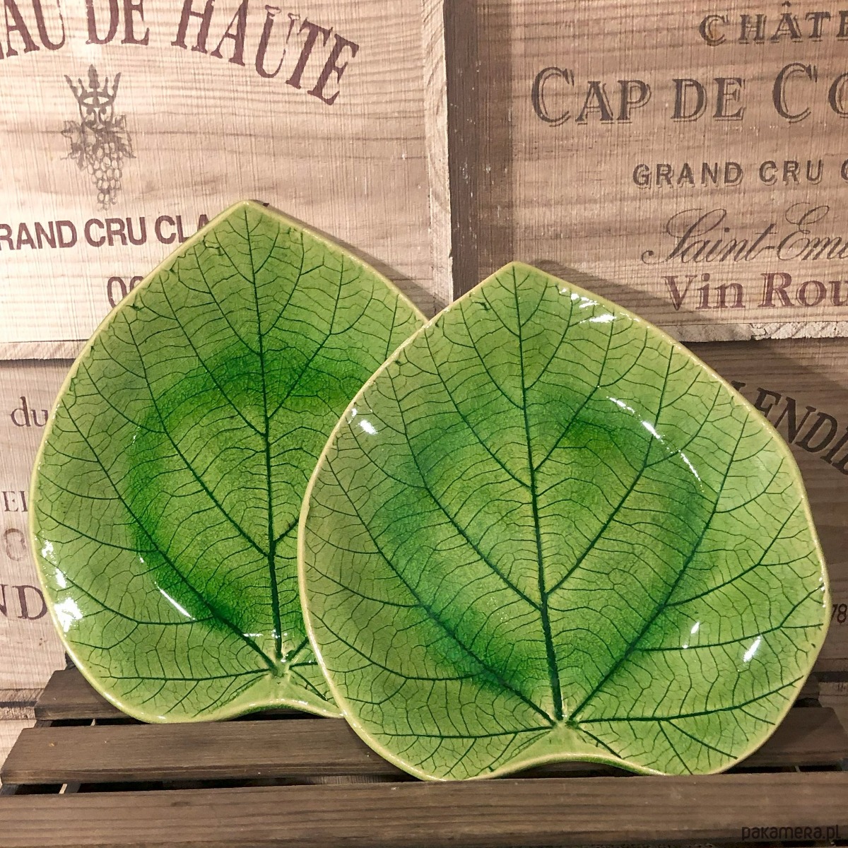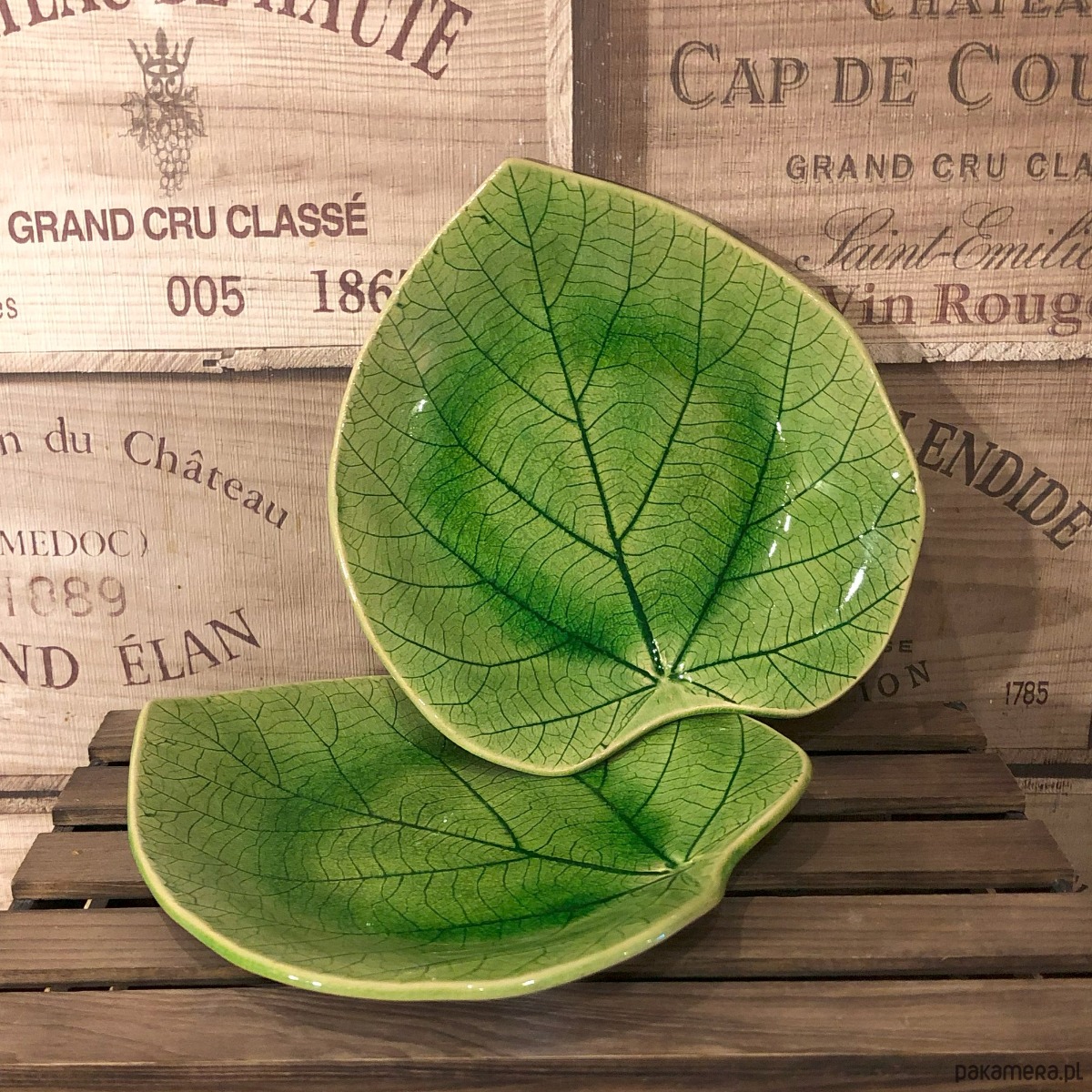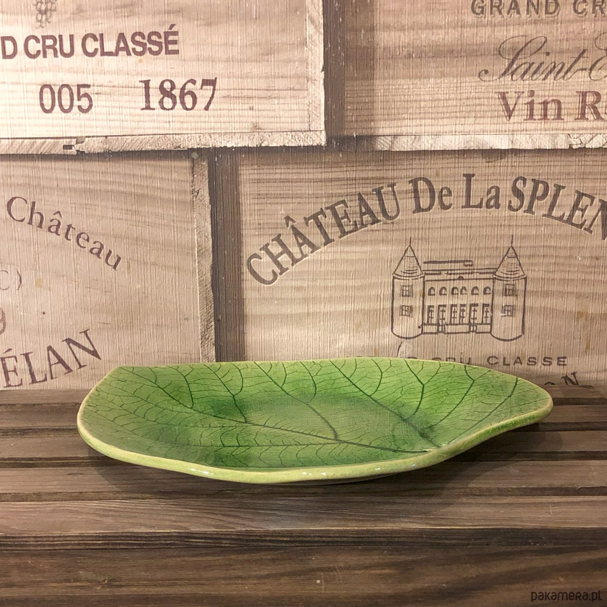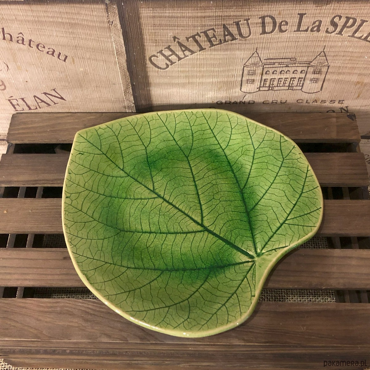 Talerzyk ceramiczny w kolorze jasnej soczystej zieleni z odbitym naturalnym listkiem.