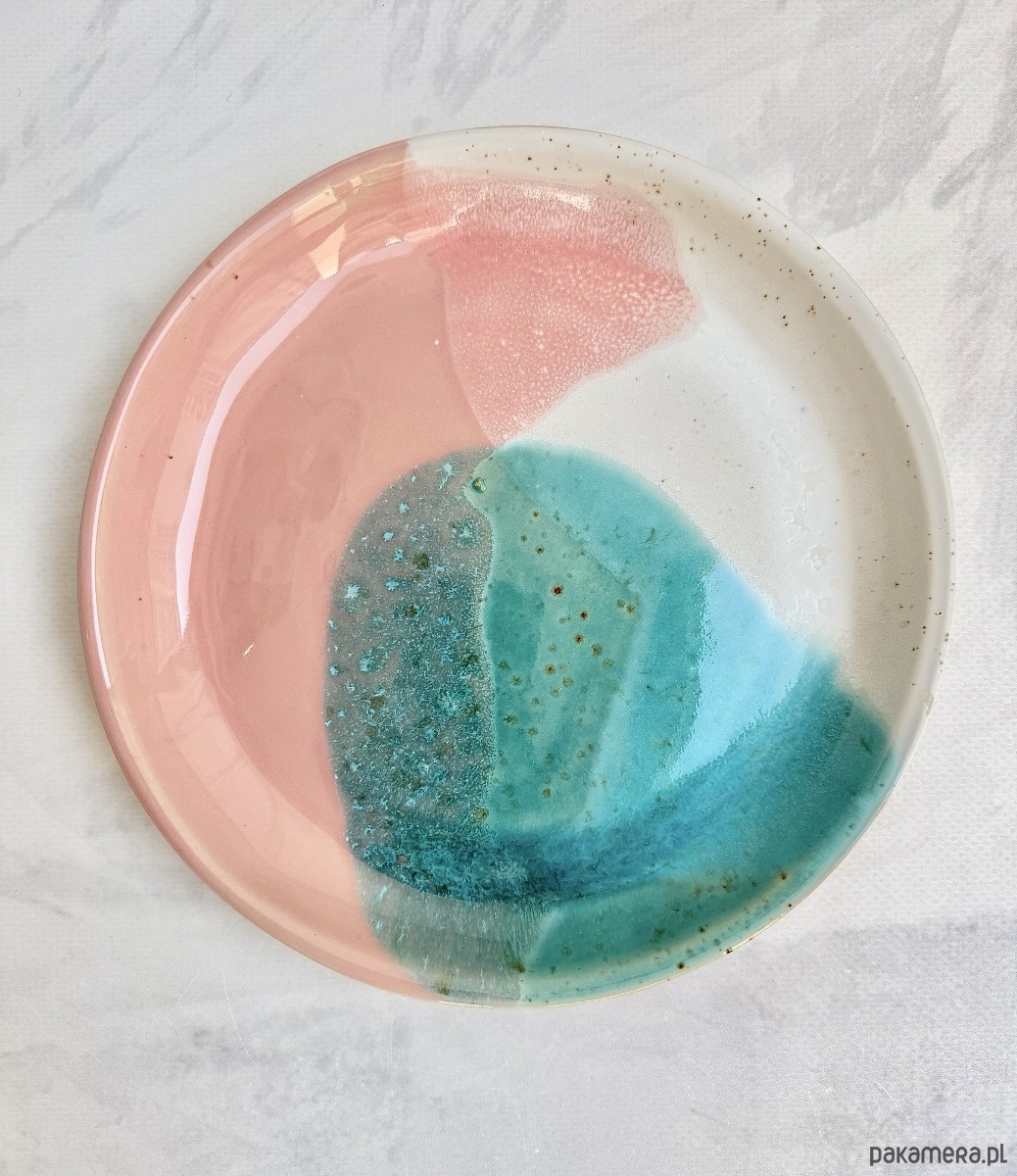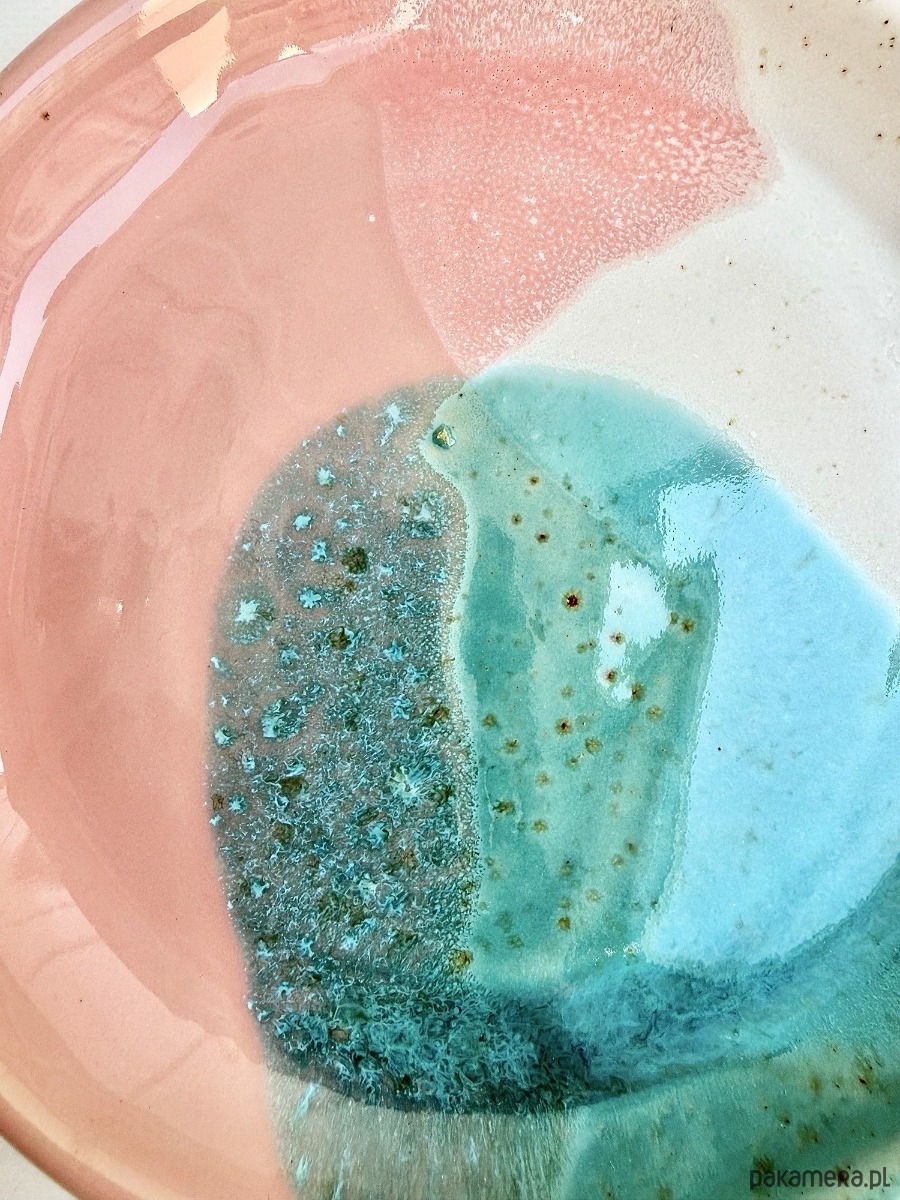 Śliczny, ręcznie wykonany talerzyk MARSHMALLOW. Białe, niebieskie i jasnoróżowe szkliwo przenikają się tworząc wręcz malarski efekt. Talerzyk ma delikatnie podniesiony rant, co nadaje mu nowoczesnego charakteru.