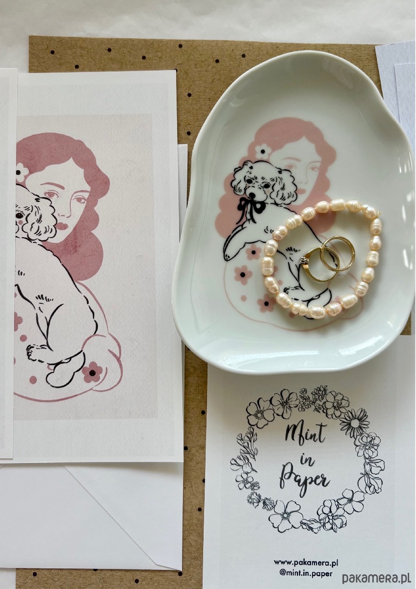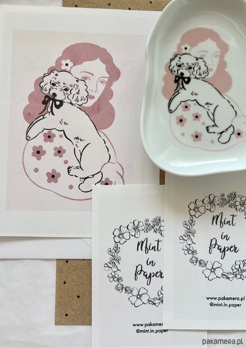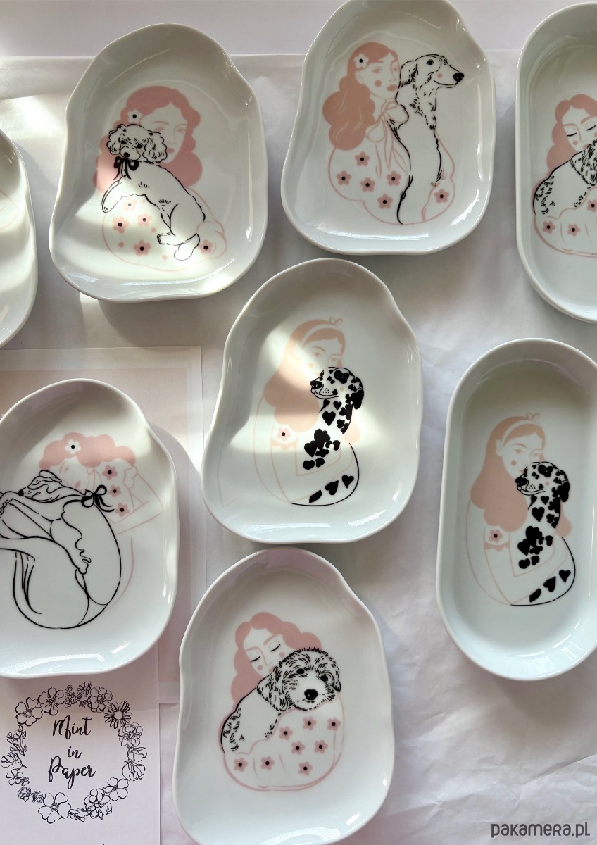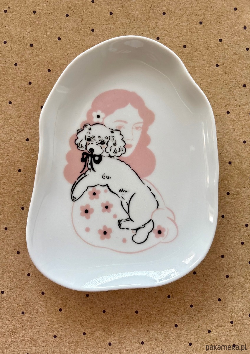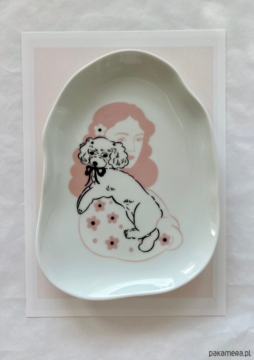 Biały porcelanowy spodek ozdobiony autorską ilustracją dziewczyny z pieskiem.